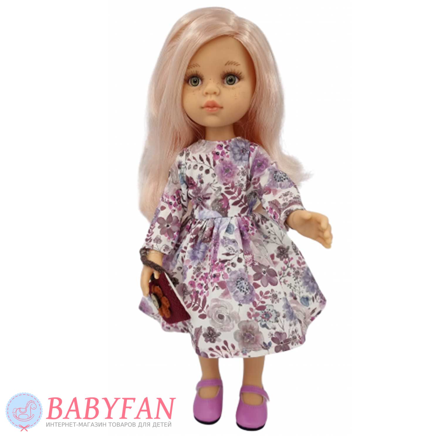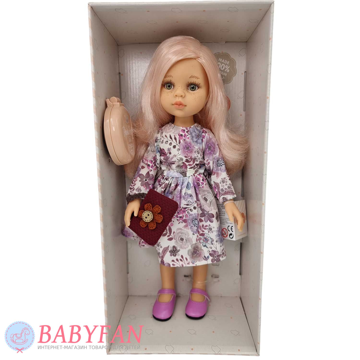 Колекційна лялька Paola Reina 04468 на ім'я Роза, родом з Іспанії, висотою 32 см створена для дітей віком від 3 років. Виготовлена із цілком безпечного приємного на дотик вінілу з ніжним запахом ванілі – не містить фталатів. Лялька з довгим, нижче плечей, розпущеним волоссям з еластичного нейлону міцно прошитим по всій голові. Їх можна розчісувати та укладати у різні зачіски. Очі нерухомі, акрилові. Довгі вії та брови виготовлені та намальовані вручну. Голова на шарнірі легко повертається праворуч і ліворуч. Ніжки та ручки рухливі. Сукня, взуття та аксесуар акуратно та міцно прошиті, легко знімаються/одягаються. Ляльку можна купати та повністю занурювати у воду.
