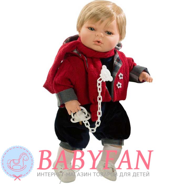 Лялька Raul Lloron 42 см озвучена, Munecas Berbesa 4312 – м'яко-набивний хлопчик. Усередині м'якого тіла вкладено звуковий механізм (лялька плаче, кличе маму – тата). Блондин, темно-сірі очі обрамлені довгими віями (не закриваються). Одягнений - синій оксамитовий комбінезон, в'язана червона курточка з капюшоном, на шиї пов'язаний червоний шарф, на ніжках білі шкарпетки і черевики з м'якого пластику. Одяг весь знімається. У комплекті соска на ланцюжку з прищіпкою.