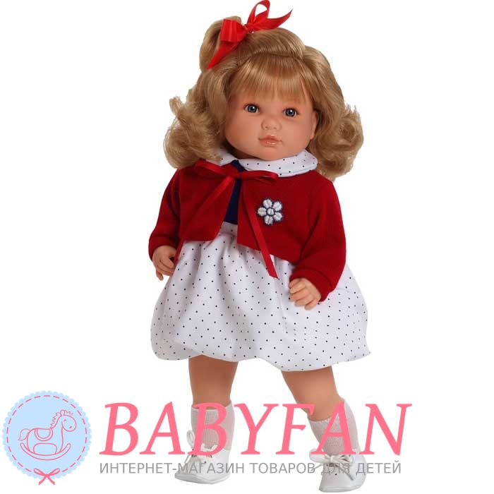 Лялька Sandra Llorona 42 см озвучена, Munecas Berbesa 4412 – миловидна сіроока блондинка з шикарним довгим волоссям, прошивка по всій голові (не перука). Світле волосся прибране в хвостик і прикрашене стрічкою. Сірі акрилові очі з довгими віями (не закриваються). Лялька одягнена в рейтузики, біле плаття в горошок, в'язаний червоний жакет на зав'язці, на білі шкарпетки на ніжках і білі черевики на шнурівці з м'якого пластику. Одяг весь знімається. У ляльки вінілові рухомі ручки, голова і м'яко-набивний тулуб, на ручках і ніжках є складочки, як у справжньої дитини.