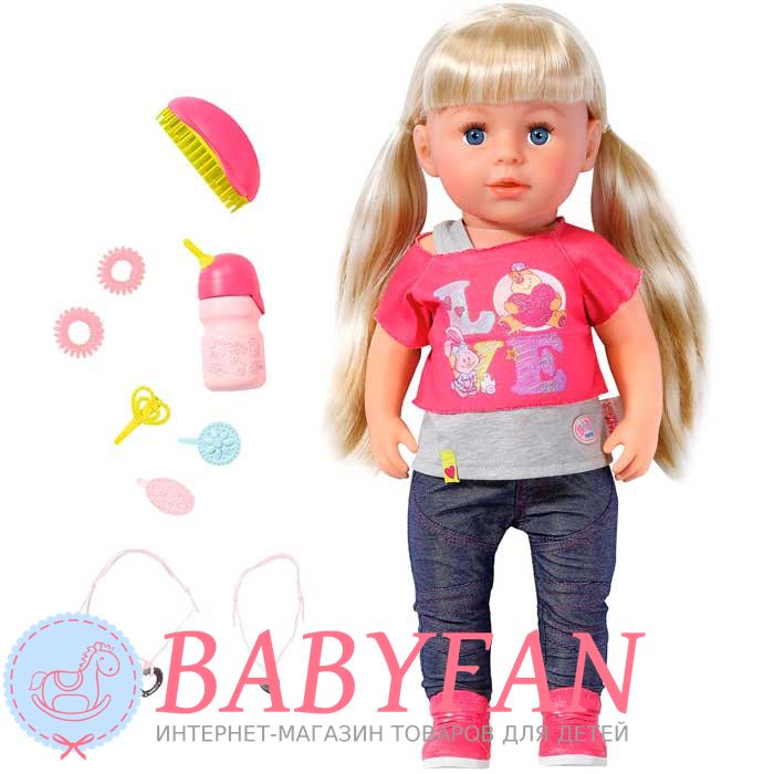 Лялька Старша Сестренка Baby Born Zapf Creation 820704 – познайомтеся зі старшою сестрою малюка Baby Born, що вже полюбилася багатьом! Ця чарівна лялечка стане справжньою подружкою для Вашої дитини! Лялька одягнена дуже стильно: у неї рожева футболочка, джинси та модні кросівки. У такому вигляді можна одразу вирушати на прогулянку! А яке чудове у неї волосся! Ви можете разом створювати їй різні зачіски, використовуючи гумочки, шпильки і гребінець, що йдуть в комплекті!