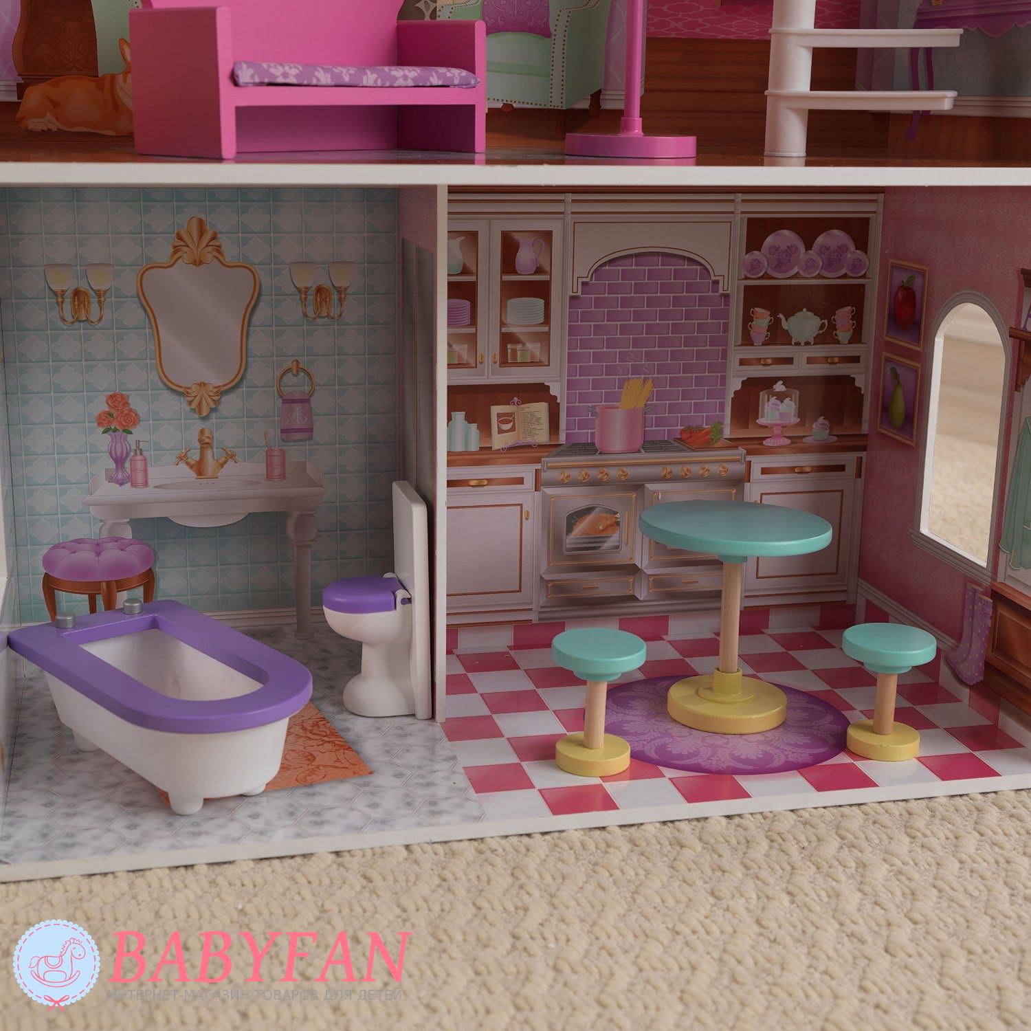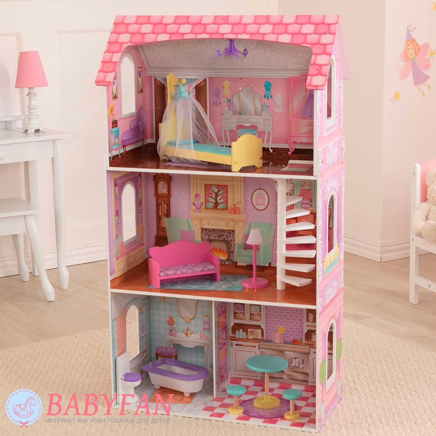 Ляльковий будиночок KidKraft 65179 «Penelope» – відкритий з передньої сторони просторий 3-поверховий будиночок для лялечок висотою до 30 см. Високий будиночок з імітацією на стінах внутрішнім та зовнішнім декоративним оздобленням. Намальований інтер'єр додають реальні 9 предметів меблів, що копіюють справжні аксесуари. Це чудовий ігровий майданчик для сюжетно-рольових ігор, у яких можуть брати участь кілька дівчаток.