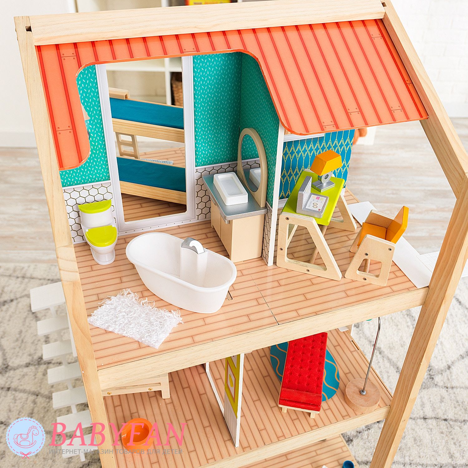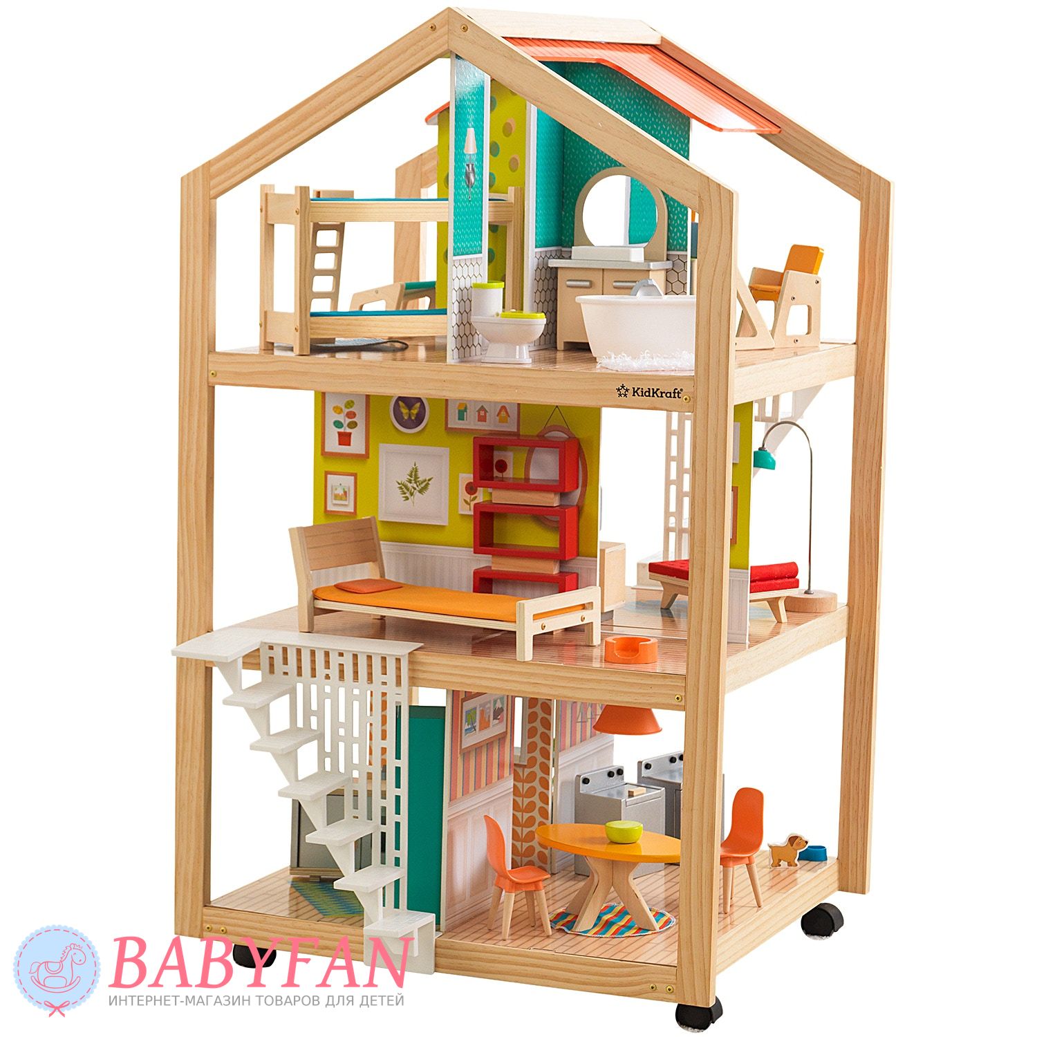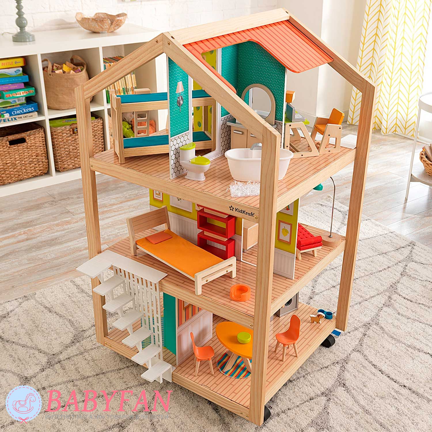 Ляльковий будиночок KidKraft 65199 So Stylish Mansion – відкритий з усіх боків триповерховий будиночок для веселих ігор для дітей. Ляльковий будиночок, виконаний у сучасному стилі, укомплектований 42 предметами меблів та декору, які можна переставляти на свій розсуд. Висотка кімнат розрахована на ляльок до 30 см. Це гарний варіант лялькового будиночка для однієї дитини або групи дітей.