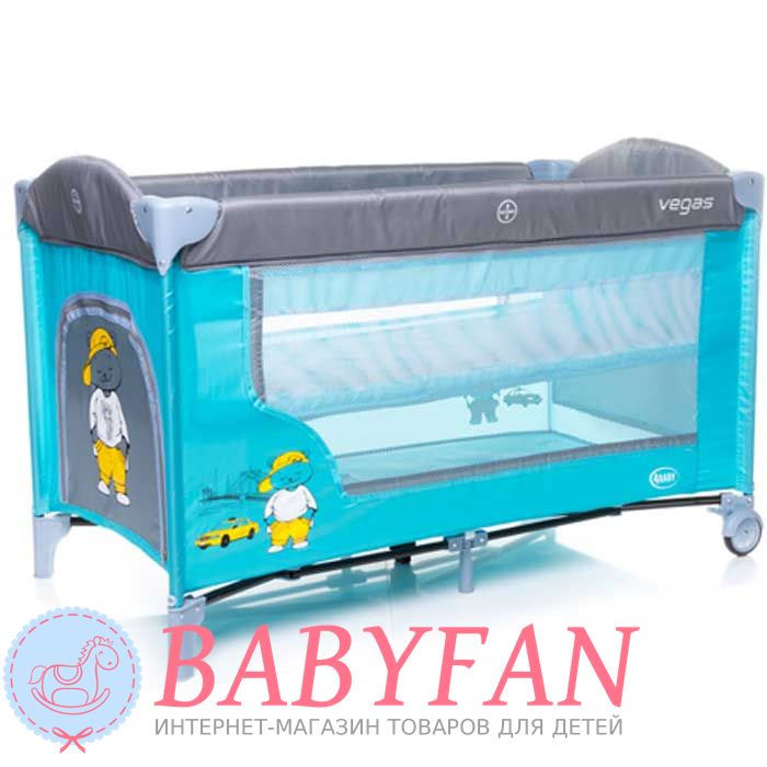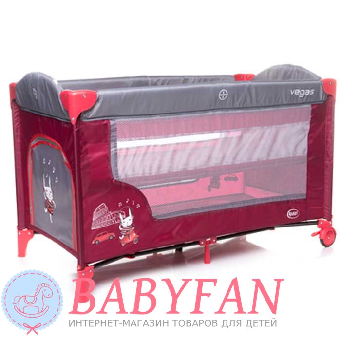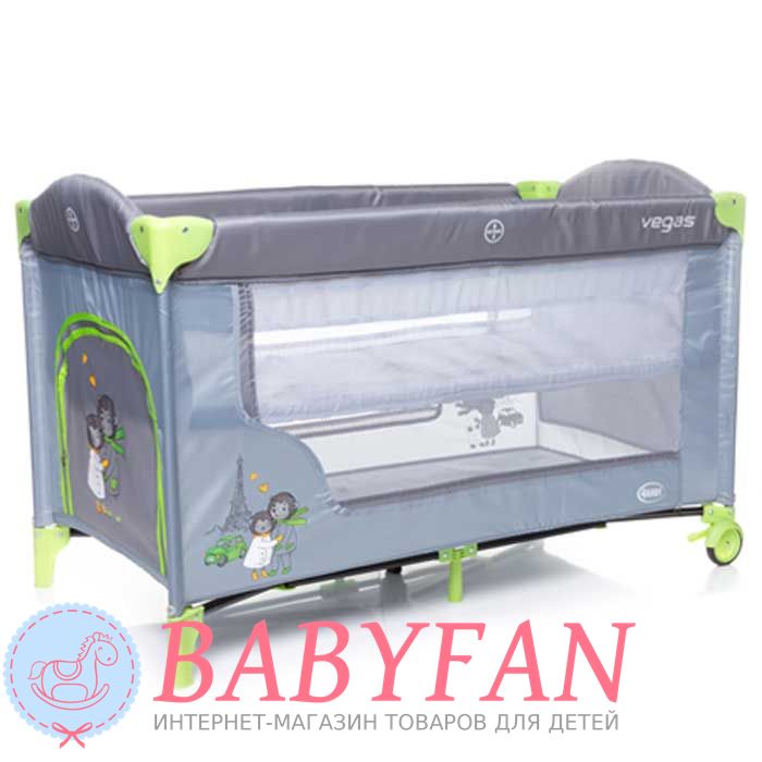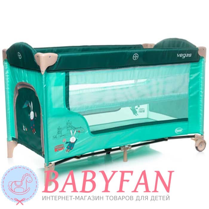 Манеж-ліжко 4baby Vegas – розроблений спеціально для сну та неспання малюка. Він обладнаний подвійним дном: нижнім стаціонарним і верхнім – регульованим по висоті та знімним дном. Таким чином, встановивши верхній рівень, можна укладати малюка спати, не нагинаючись у самий низ, щоразу. Коли ж дитина підросте, її можна укладати спати на нижній рівень, щоб вона не вилізла з манежу. Також, нижній рівень призначений для ігор і неспання дитини. Манеж Він обладнаний додатковими опорами посередині днища, подвійними замками, що запобігають мимовільному складання. Всі кути закриті спеціальними закругленими накладками, а борти обшиті м'якою тканиною.