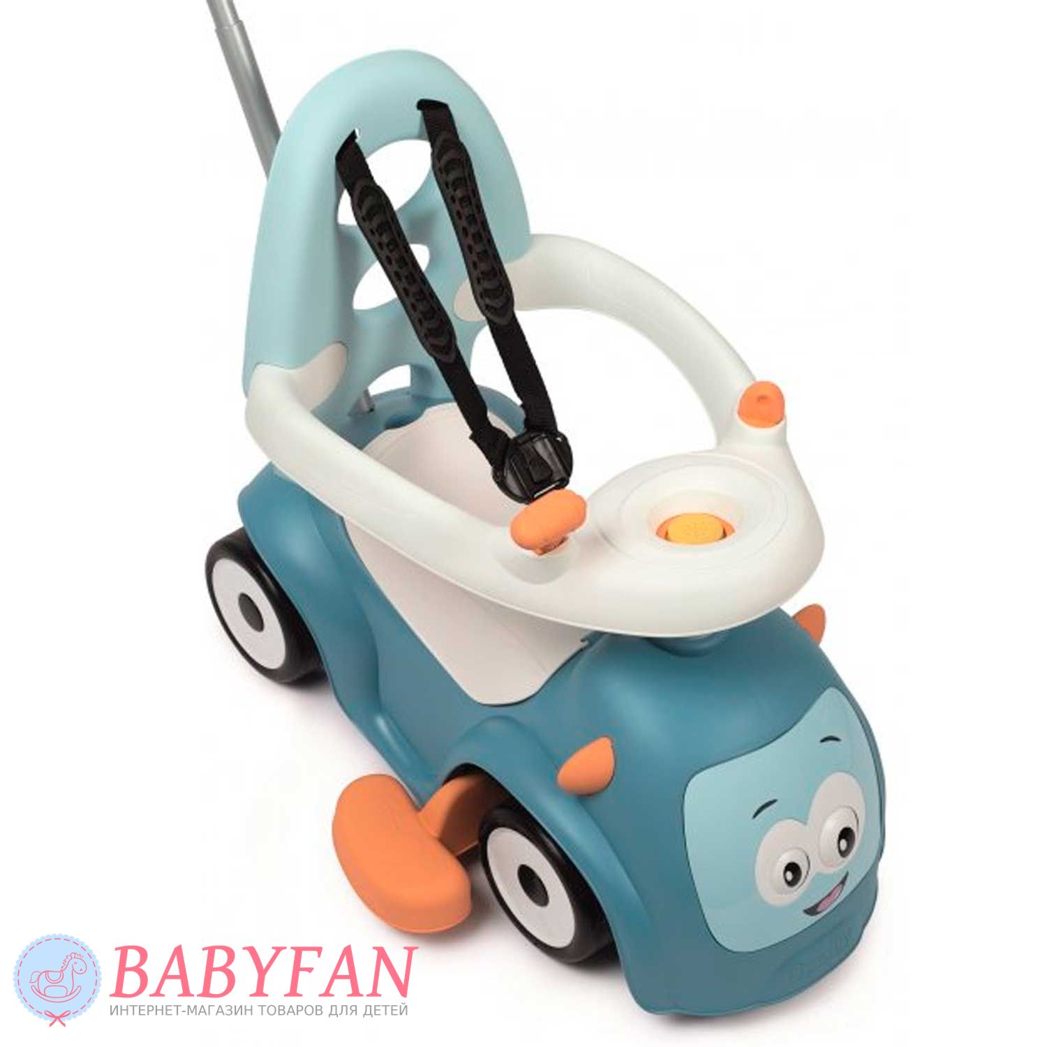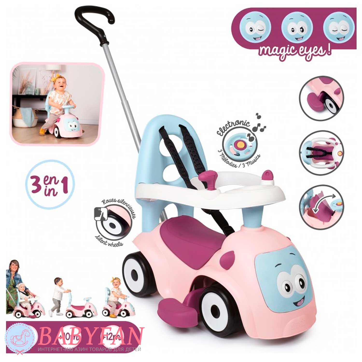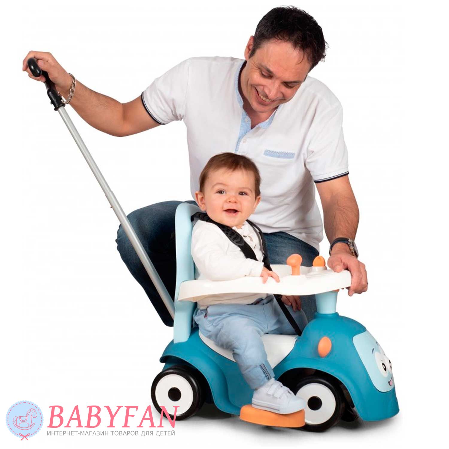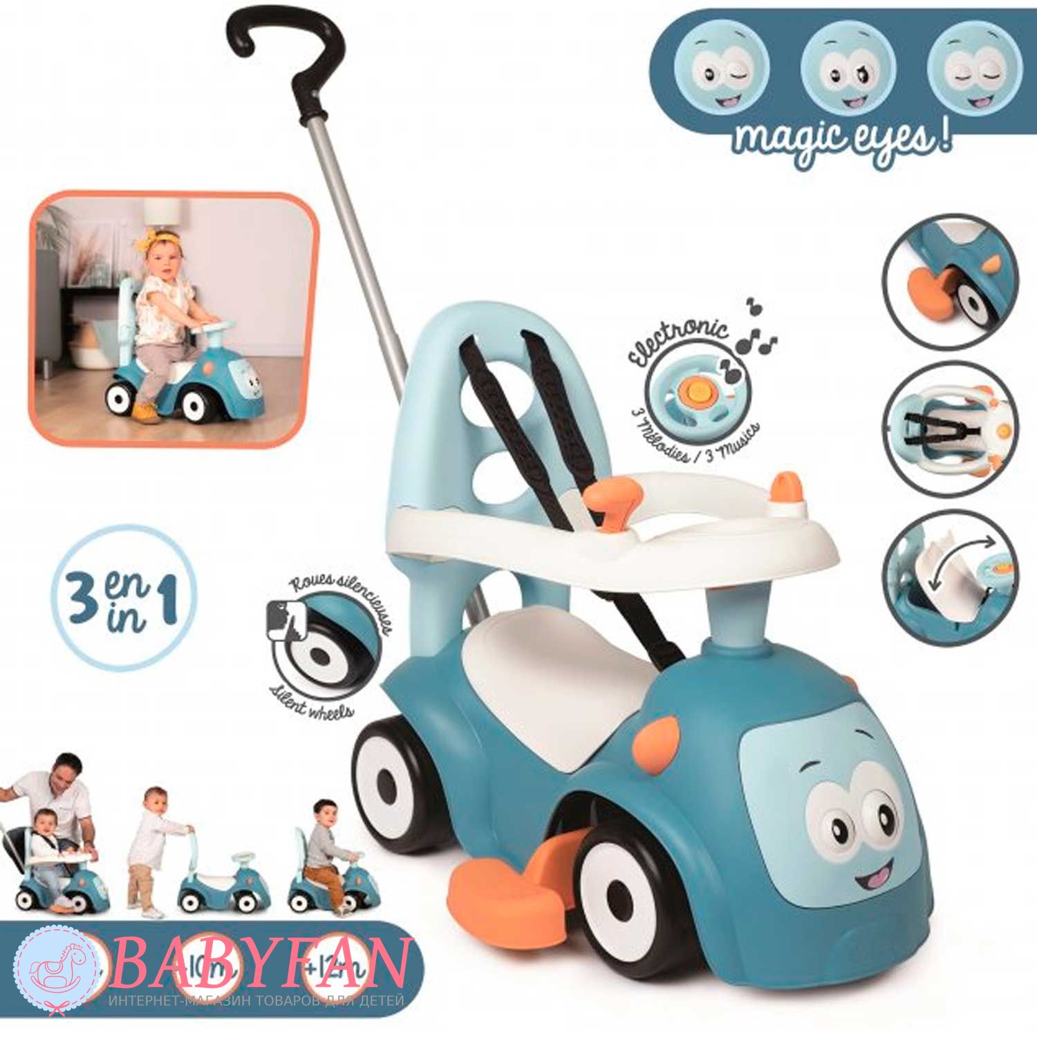 Машинка-каталка Maestro 2 Smoby – призначена для дітей з 6 місяців. Яскрава, барвиста машинка-каталка трансформується і "зростає" відповідно до потреб зростання Вашого малюка: найменші можуть сидіти і грати, а також кататися на вулиці та вдома, завдяки зручній ручці для дорослих, старші малюки – вчитися ходити, спираючись на спинку каталки , А більш дорослі діти - самостійно пересуватися, сидячи на машинці. Кермо обладнане трьома різними сигналами і рухливими очима, що прокручуються, змінюють "емоції". Зручний багажник під сидінням дозволить взяти на прогулянку улюблену іграшку.