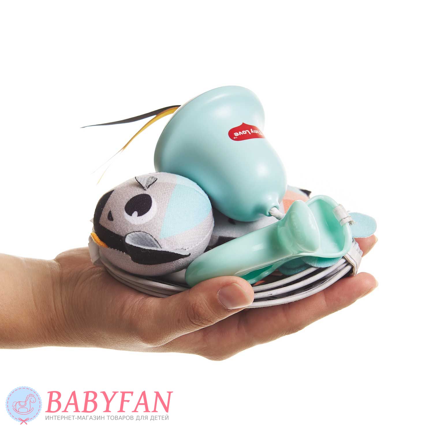 - виконаний з різнофактурних матеріалів і поєднує в собі всі найпривабливіші для малюка іграшки: безпечне дзеркальце, анатомічний прорізувач, м'ячик-брязкальце, китайський дзвіночок, хрусткі елементи;