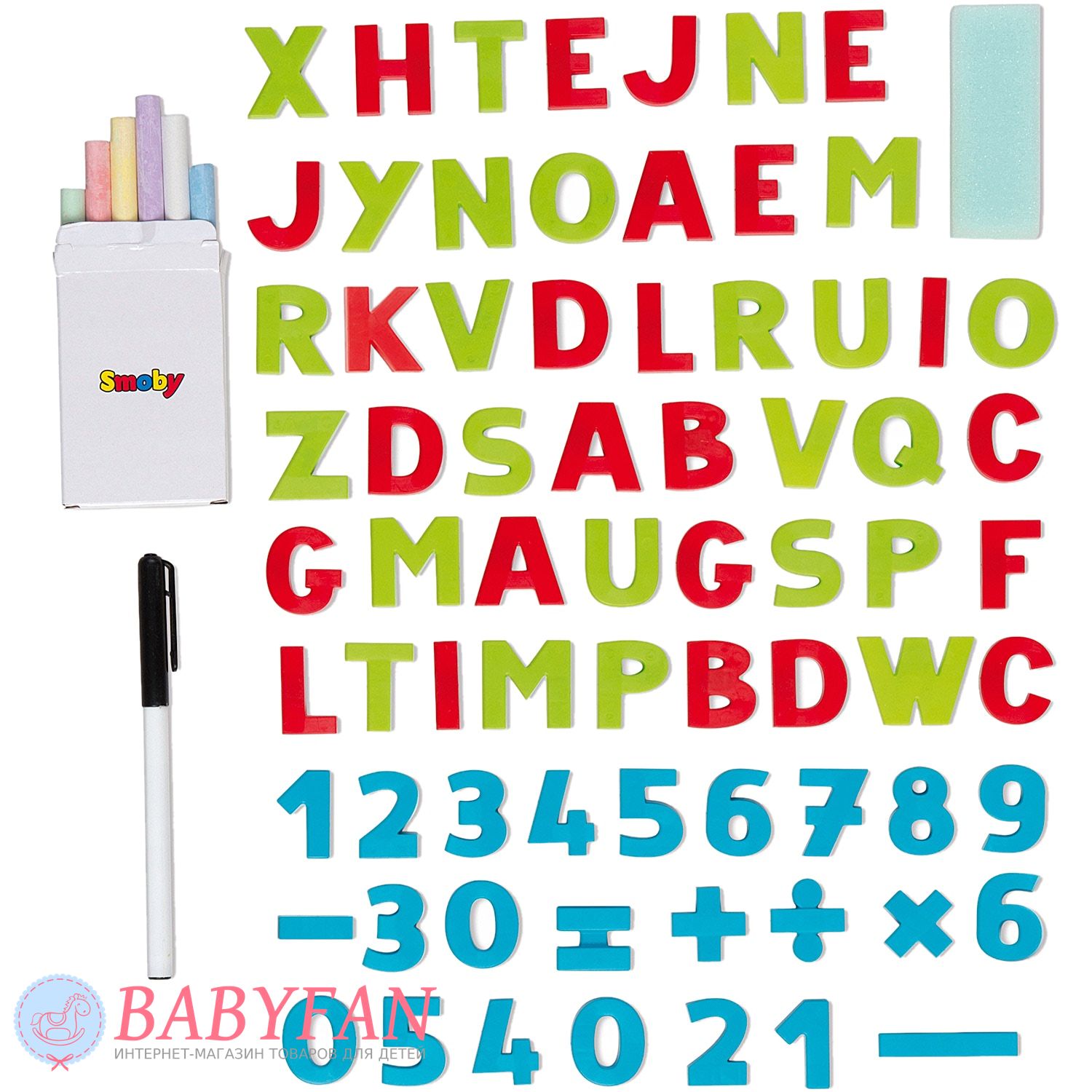 Комплект:мольберт , 1 маркер , 6 кольорових крейд , 18 цифр на магнітах , 48 букв латинського алфавіту , 6 арифметичних знаків , 1 губка