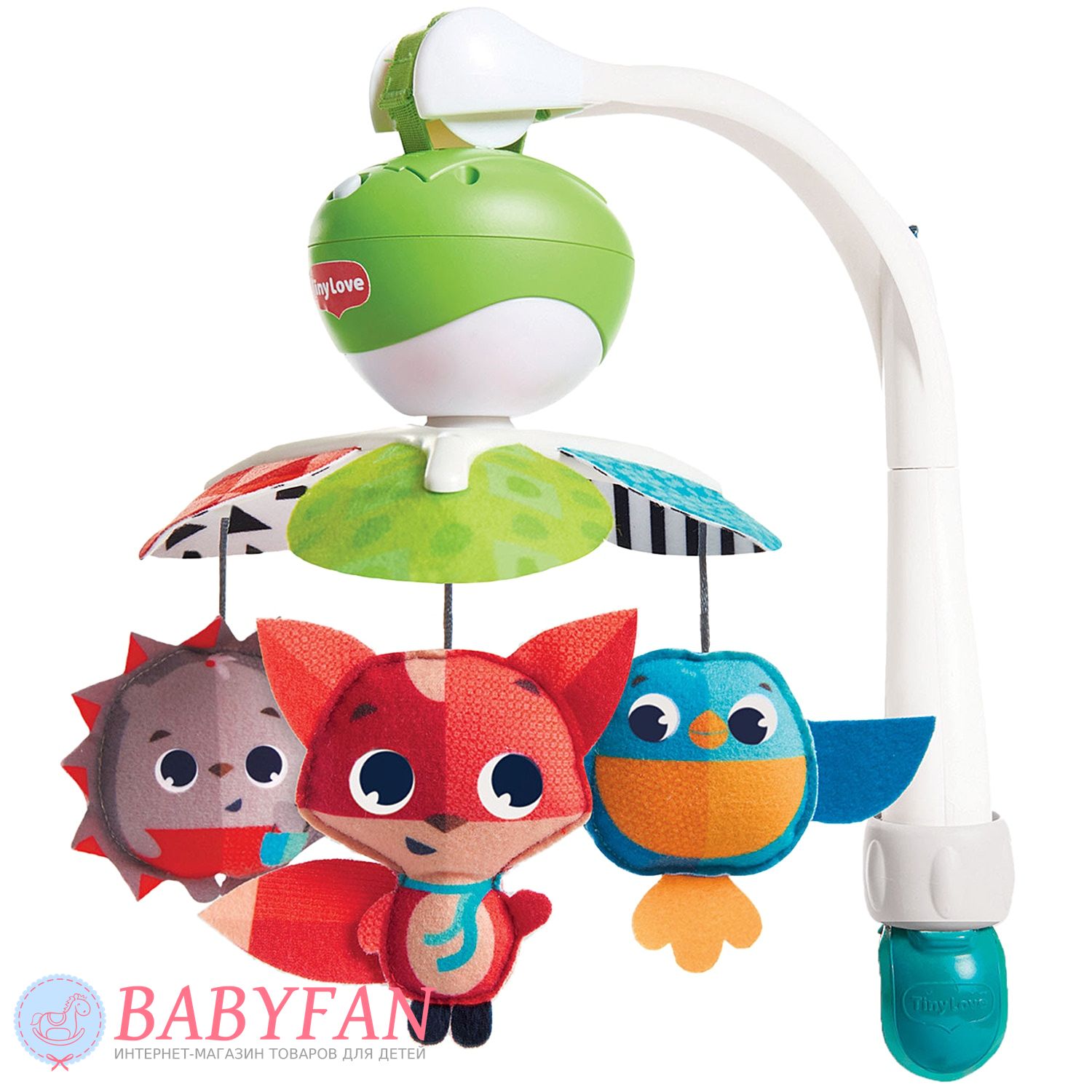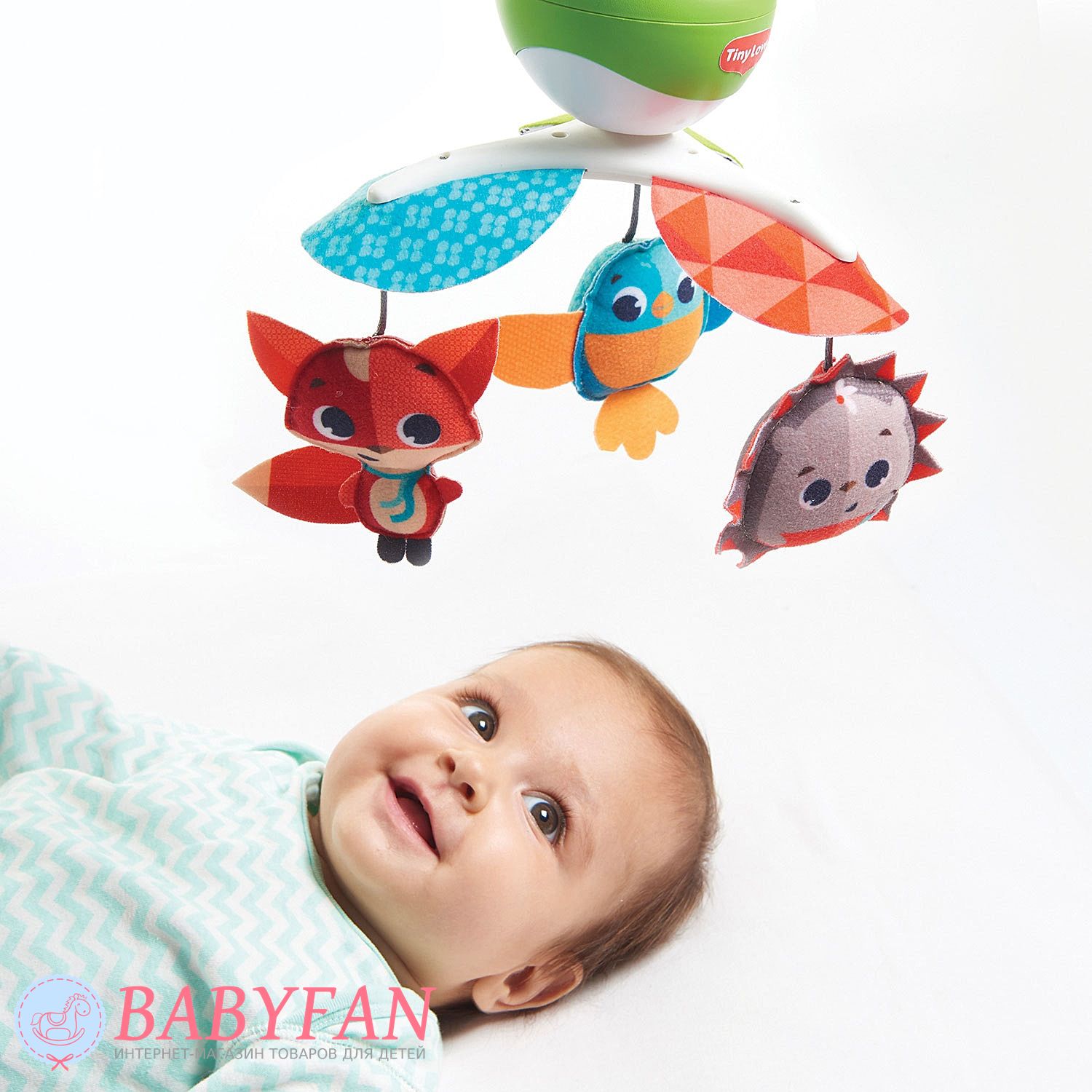 Мультифункціональний мобіль 3 в 1 Tiny Love Весела галявина – щоб заспокоїти малюка, що плаче, достатньо лише включити приємні мелодії на цьому мобілі і звернути увагу дитини на підвішені забавні іграшки. Крихітка з цікавістю їх розглядатиме, а потім неодмінно захоче дотягнутися і доторкнутися до яскравих звірят.