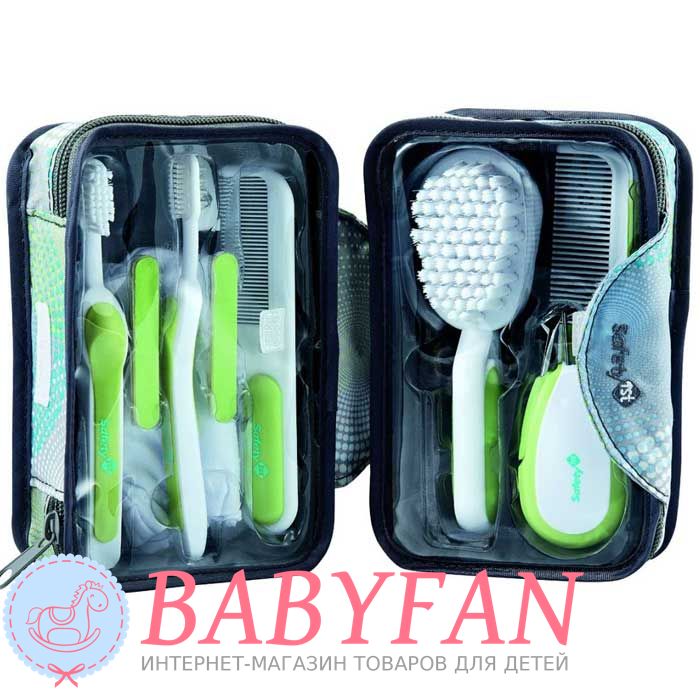 Набір гігієнічний Safety 1st Care&Grooming Baby Vanity 8 од. - тут все необхідне, щоб упорядкувати ручки і порожнину рота малюка, а також кілька гребінців. Зручна сумочка полегшує використання та зберігання набору, її зручно брати у дорогу. Набір по догляду за немовлям Safety 1st дозволить матусі акуратно провести гігієнічні процедури своїй дитині не витрачаючи багато часу. Усі необхідні інструменти упаковані у косметичку-органайзер на блискавці.