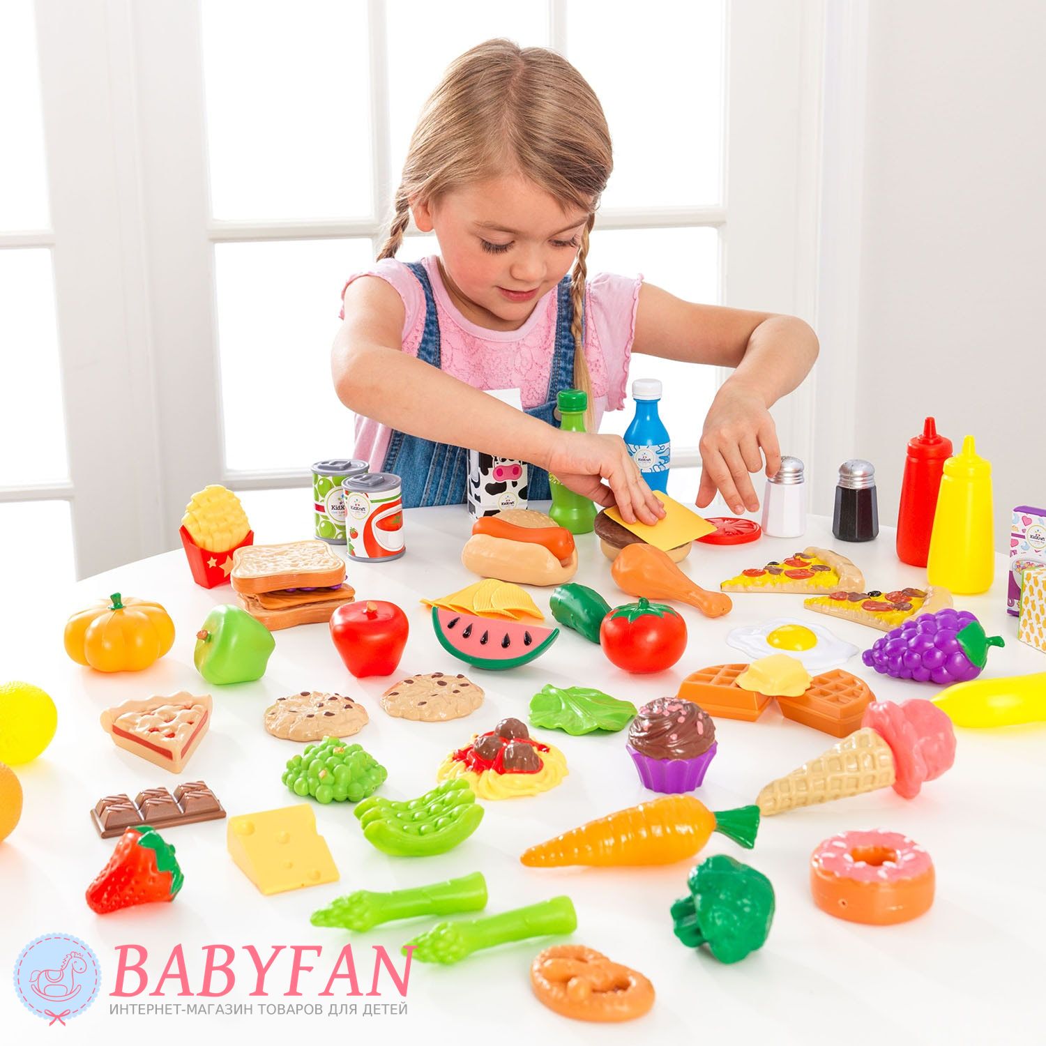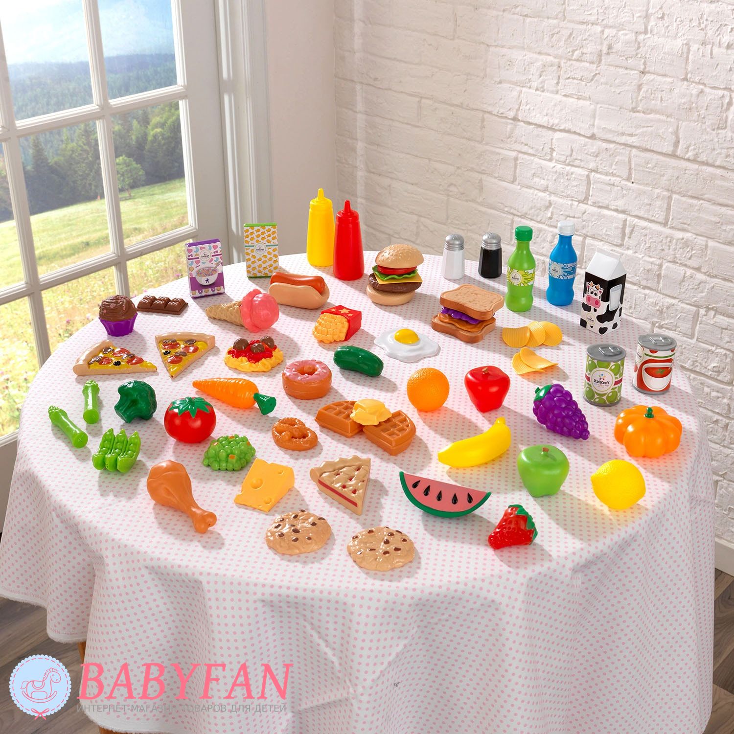 - набір складається з 65 реалістичних продуктів, що включають печиво, чіпси, тюбики з гірчицею та кетчупом, баночки з консервами, пляшечку з лимонадом, перечницю та сільничку, виноград та банан, часточки кавуна, гамбургер, порції піци, хлібобулочні вироби та багато виробів дітям створювати різні страви та поєднувати смаки.