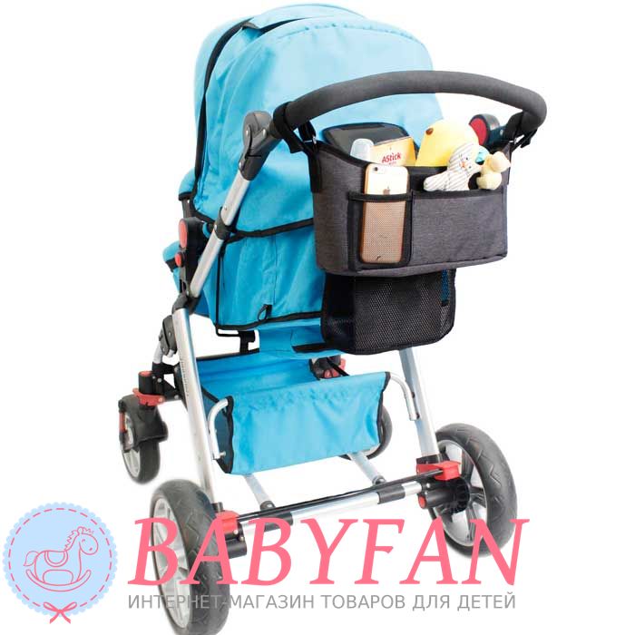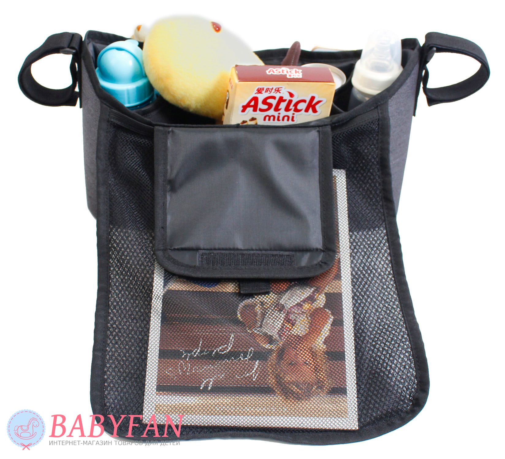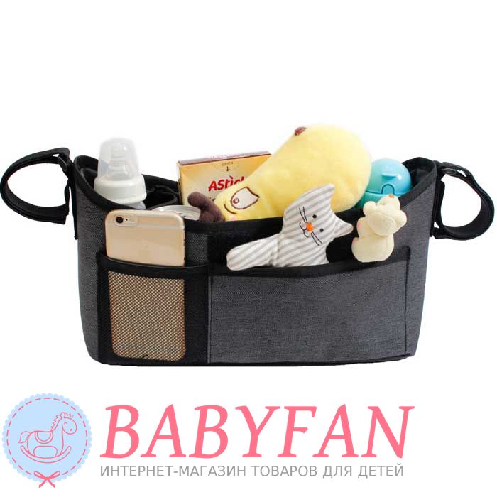 Органайзер для коляски BabyDan – виконаний з якісного нетоксичного матеріалу, що легко кріпиться до ручки коляски. Всередині органайзер має одну велику кишеню для підгузника, серветок або закусок і дві невеликі кишені для пляшки або кружки. Зовні органайзер є дві невеликі кишені, в яких можна зберігати, наприклад, ключі або телефон.