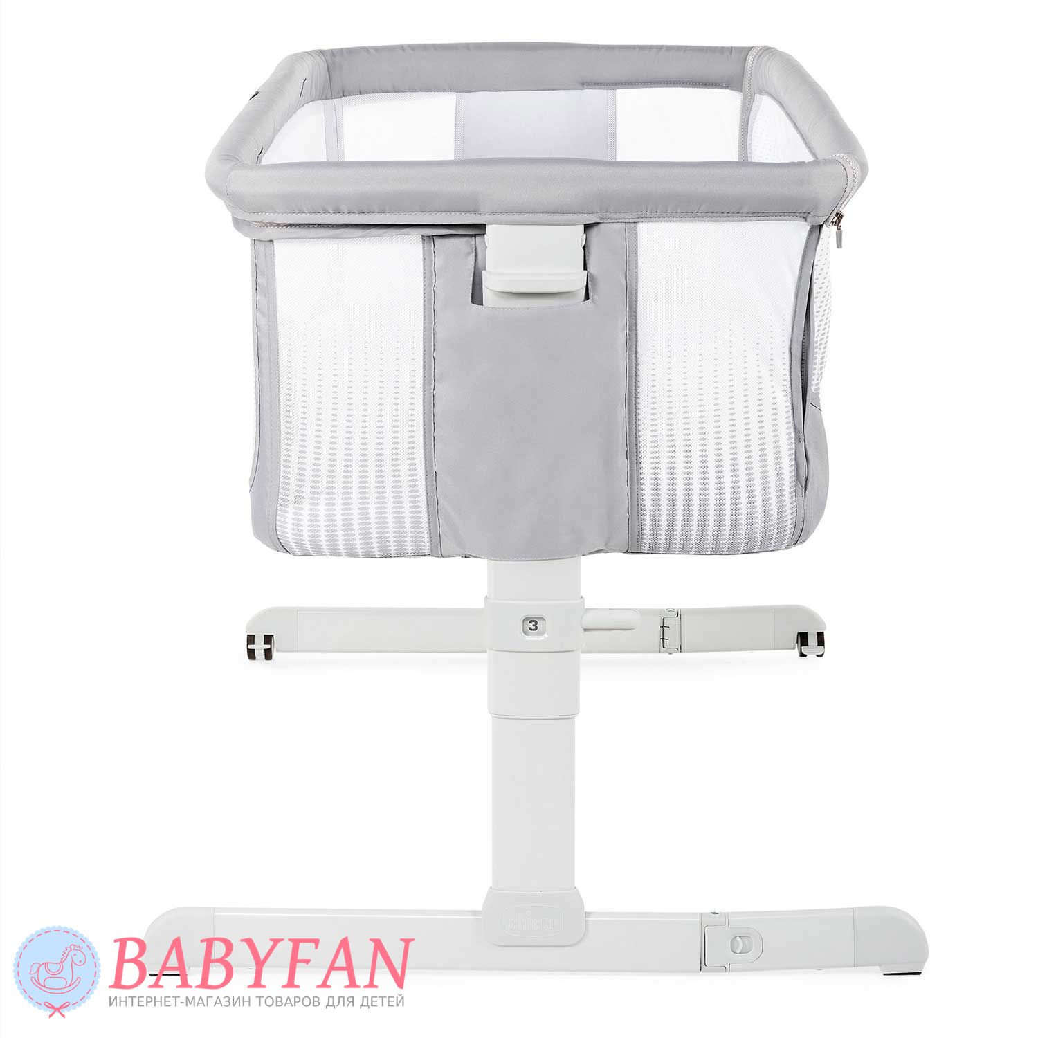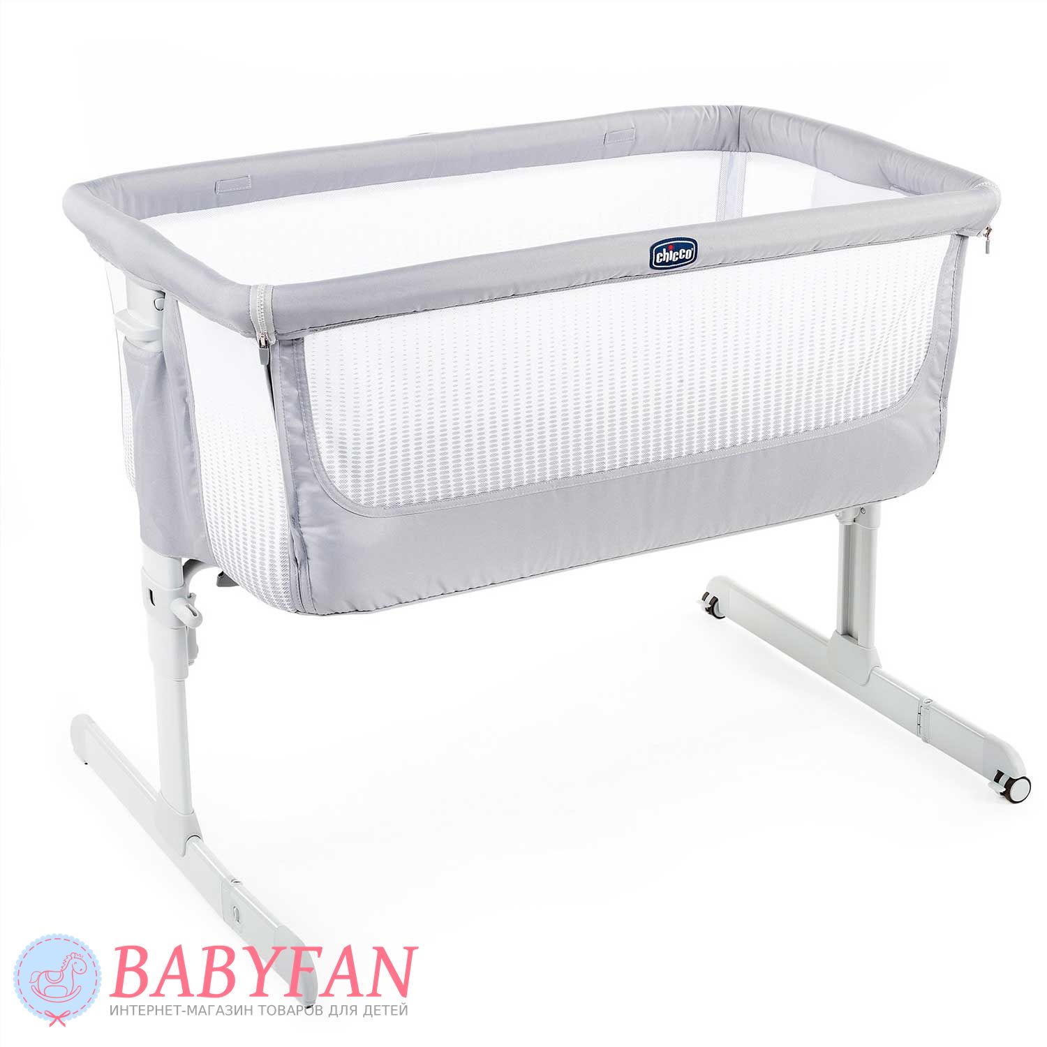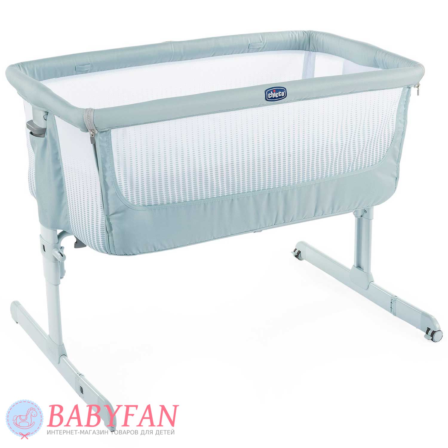 Chicco Next2Me Air – приставне ліжечко для новонароджених немовлят до 6 місяців зі знімним переднім бортиком. Обмеження вагою дитини – до 9 кг. Завдяки ніжкам, що складаються, щільно приставляється до батьківського ліжка будь-якої конструкції, у тому числі з висувними ящиками. Лицьовий бортик знімний, бильця фіксується під ліжечком. Захисна огорожа виконана з сітки, що виконує подвійну функцію: (1) внутрішній простір колиски добре провітрюється, (2) крізь сітку дитина завжди на виду. Висота ліжечка регулюється. Приймає похило положення - полегшує немовляті зригування і дихання при закладеному носику. Пристібається до батьківського ліжка ременями на клямках.