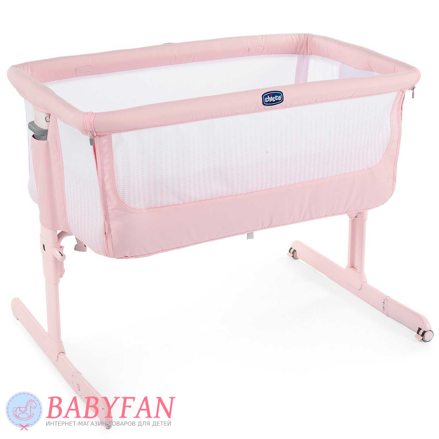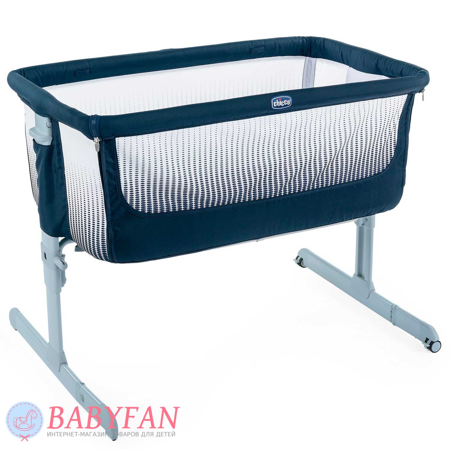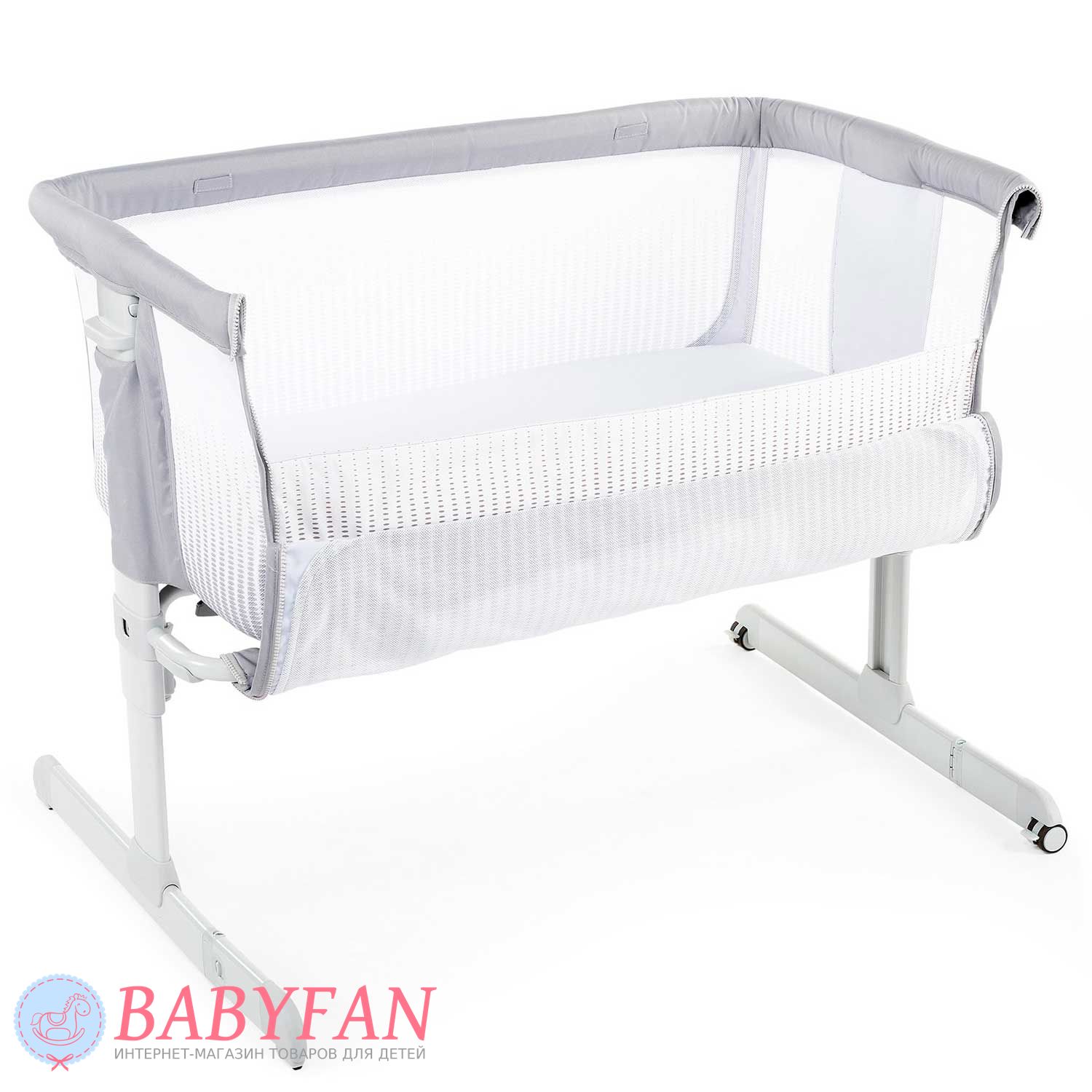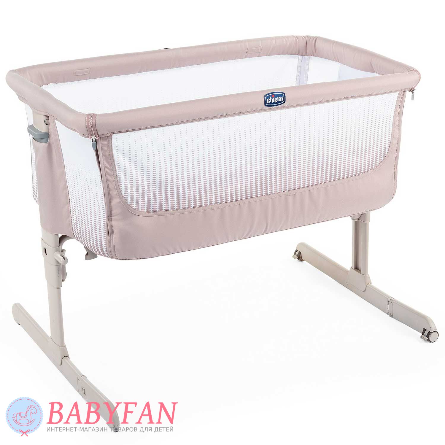 Chicco Next2Me Air – приставне ліжечко для новонароджених немовлят до 6 місяців зі знімним переднім бортиком. Обмеження вагою дитини – до 9 кг. Завдяки ніжкам, що складаються, щільно приставляється до батьківського ліжка будь-якої конструкції, у тому числі з висувними ящиками. Лицьовий бортик знімний, бильця фіксується під ліжечком. Захисна огорожа виконана з сітки, що виконує подвійну функцію: (1) внутрішній простір колиски добре провітрюється, (2) крізь сітку дитина завжди на виду. Висота ліжечка регулюється. Приймає похило положення - полегшує немовляті зригування і дихання при закладеному носику. Пристібається до батьківського ліжка ременями на клямках.