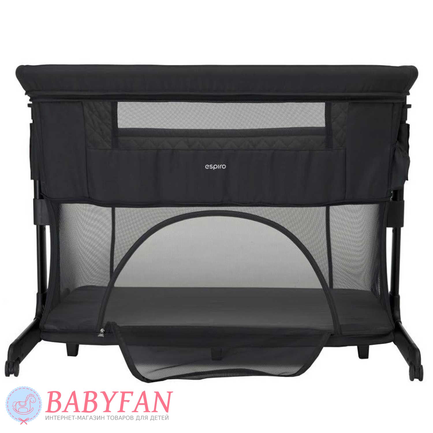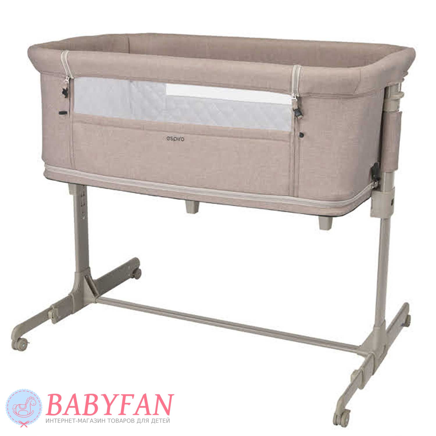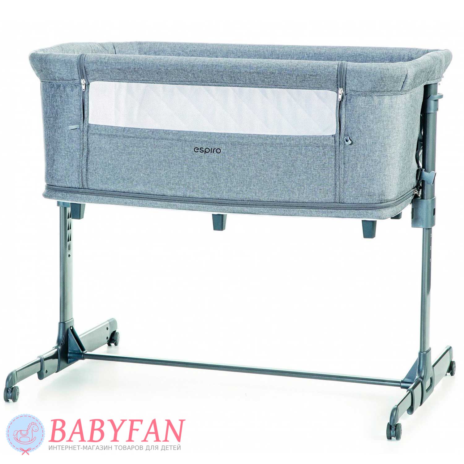 Борт з сітчастою секцією в Espiro Cloud на блискавці. Розстебнувши 2 застібки і від'єднавши штангу, він опускається і мама дотягнеться до дитини не встаючи з ліжка. Коли дитина підросте настільки, що зможе самостійно сидіти, дно опускається і ліжечко перетворюється на ігровий манеж з вентильованими сітчастими бортами та лазом збоку на блискавці. Невеликі колеса на основі полегшують переміщення ліжечка в межах кімнати. Ніжки регулюються за довжиною. Для дитячих іграшок та іншого приладдя на торці передбачена кишеня на гумці.