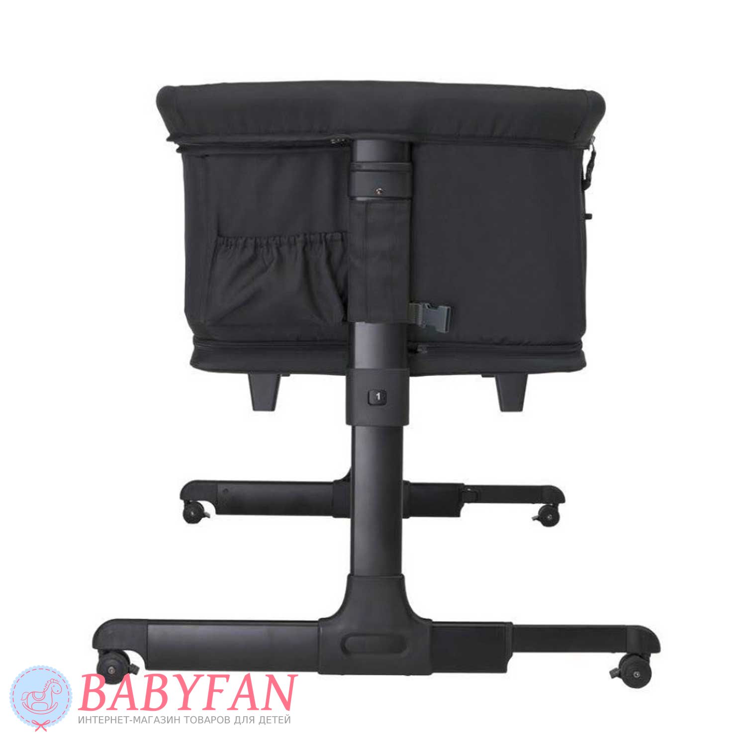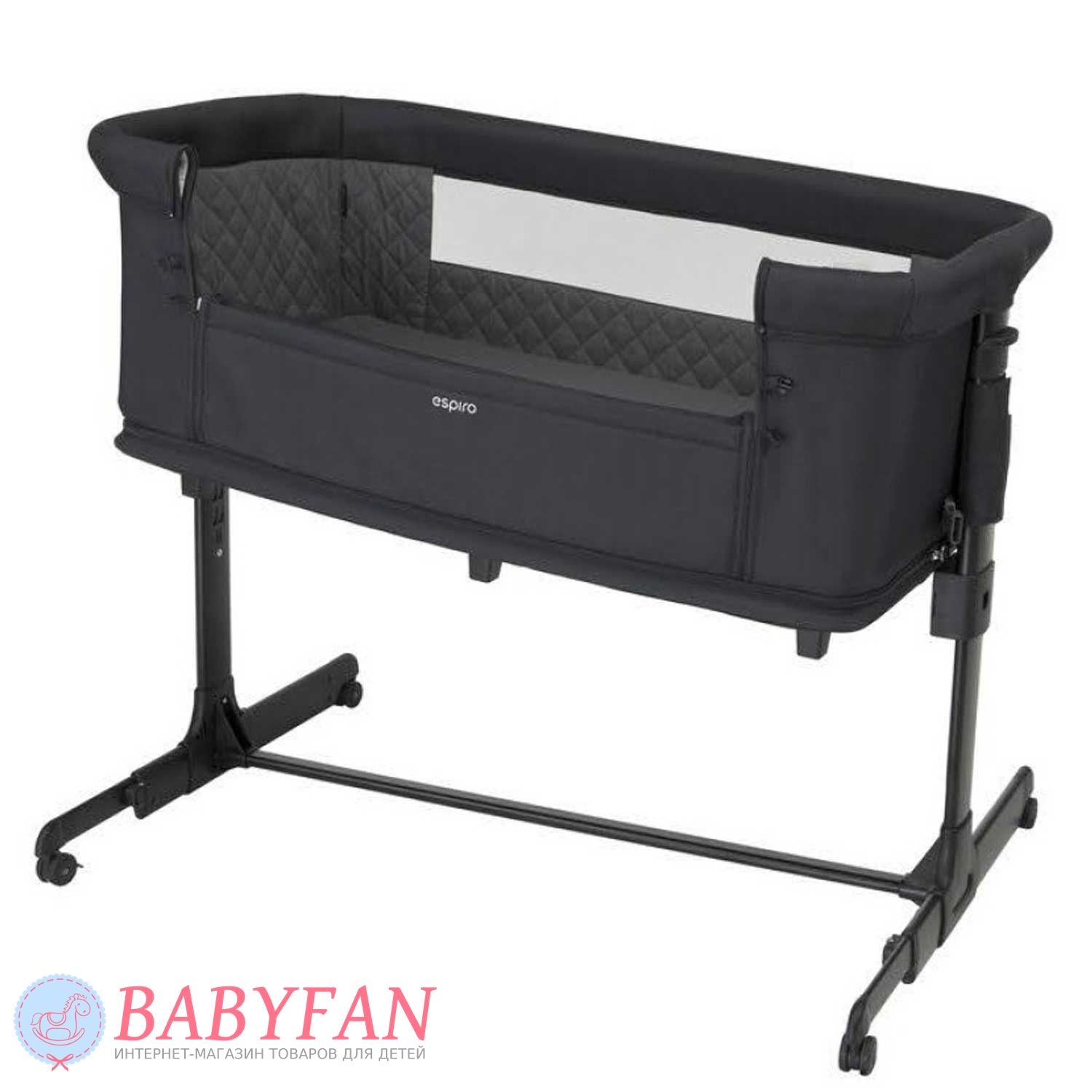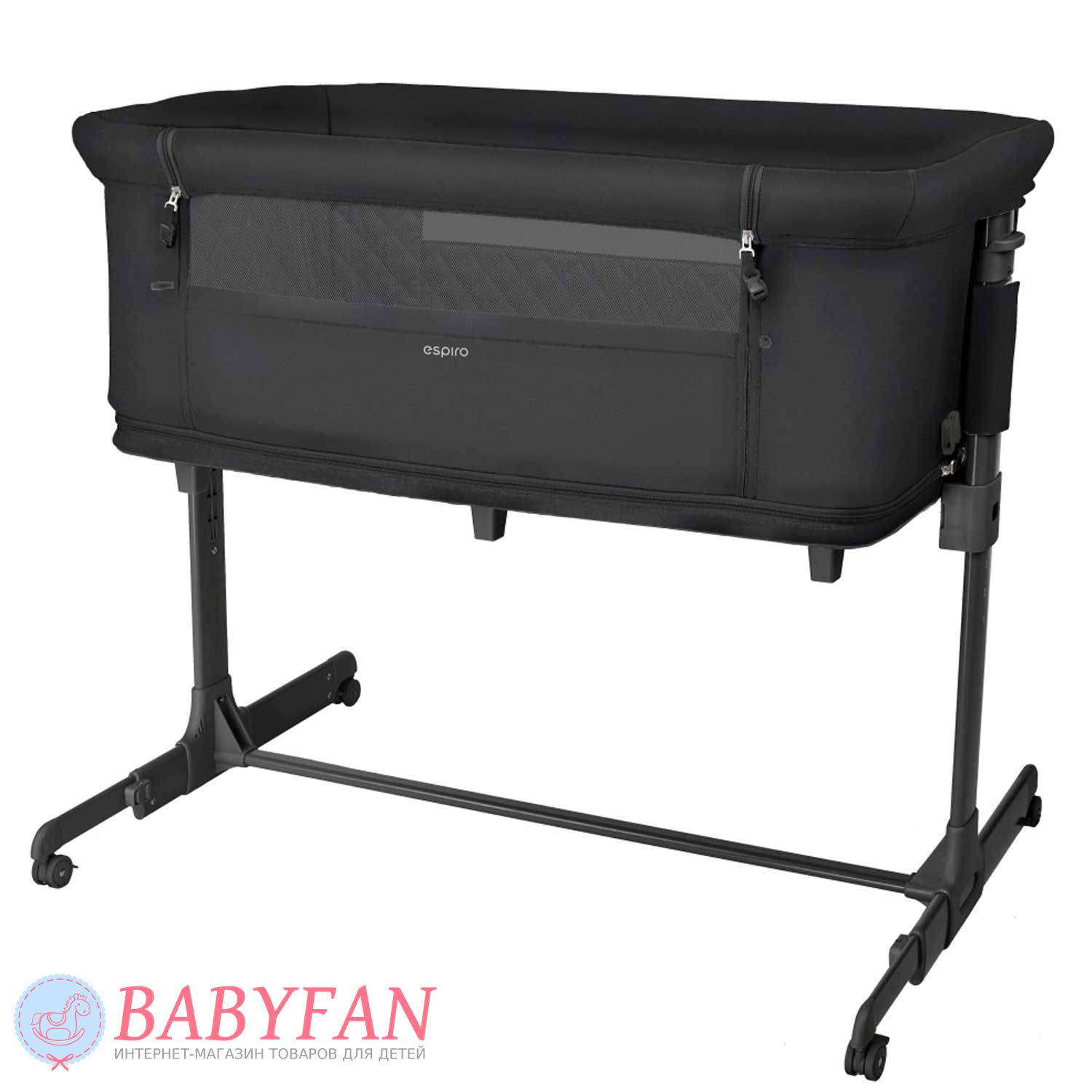 Борт з сітчастою секцією в Espiro Cloud на блискавці. Розстебнувши 2 застібки і від'єднавши штангу, він опускається і мама дотягнеться до дитини не встаючи з ліжка. Коли дитина підросте настільки, що зможе самостійно сидіти, дно опускається і ліжечко перетворюється на ігровий манеж з вентильованими сітчастими бортами та лазом збоку на блискавці. Невеликі колеса на основі полегшують переміщення ліжечка в межах кімнати. Ніжки регулюються за довжиною. Для дитячих іграшок та іншого приладдя на торці передбачена кишеня на гумці.