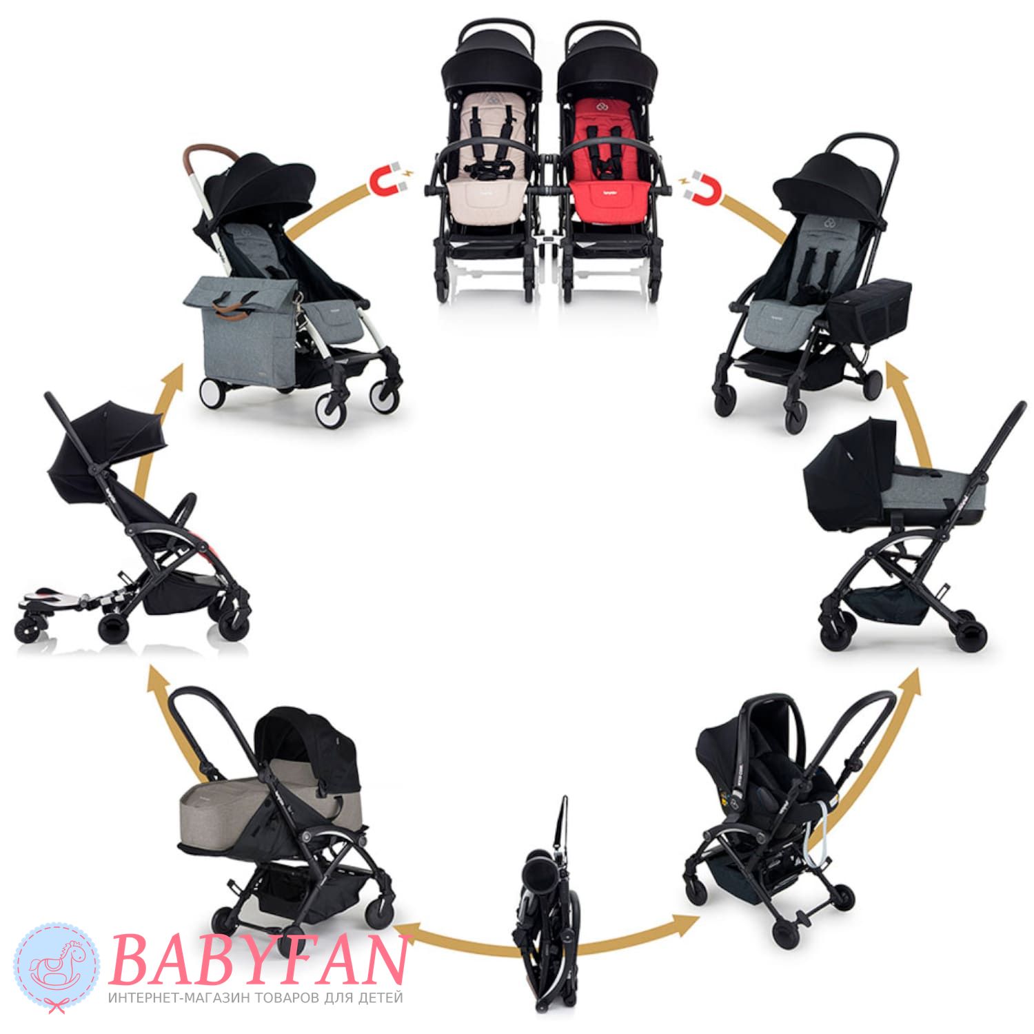 - за допомогою спеціальних адаптерів на шасі коляски встановлюється люлька або автокрісло (обидва модулі купуються окремо). Комбінації використання коляски: прогулянкова коляска для однієї дитини, коляска зі встановленою люлькою або автокріслом для однієї дитини, дві коляски прогулянки, поєднані в одну систему, коляска з двома люльками або прогулянковий блок + люлька для двох дітей.