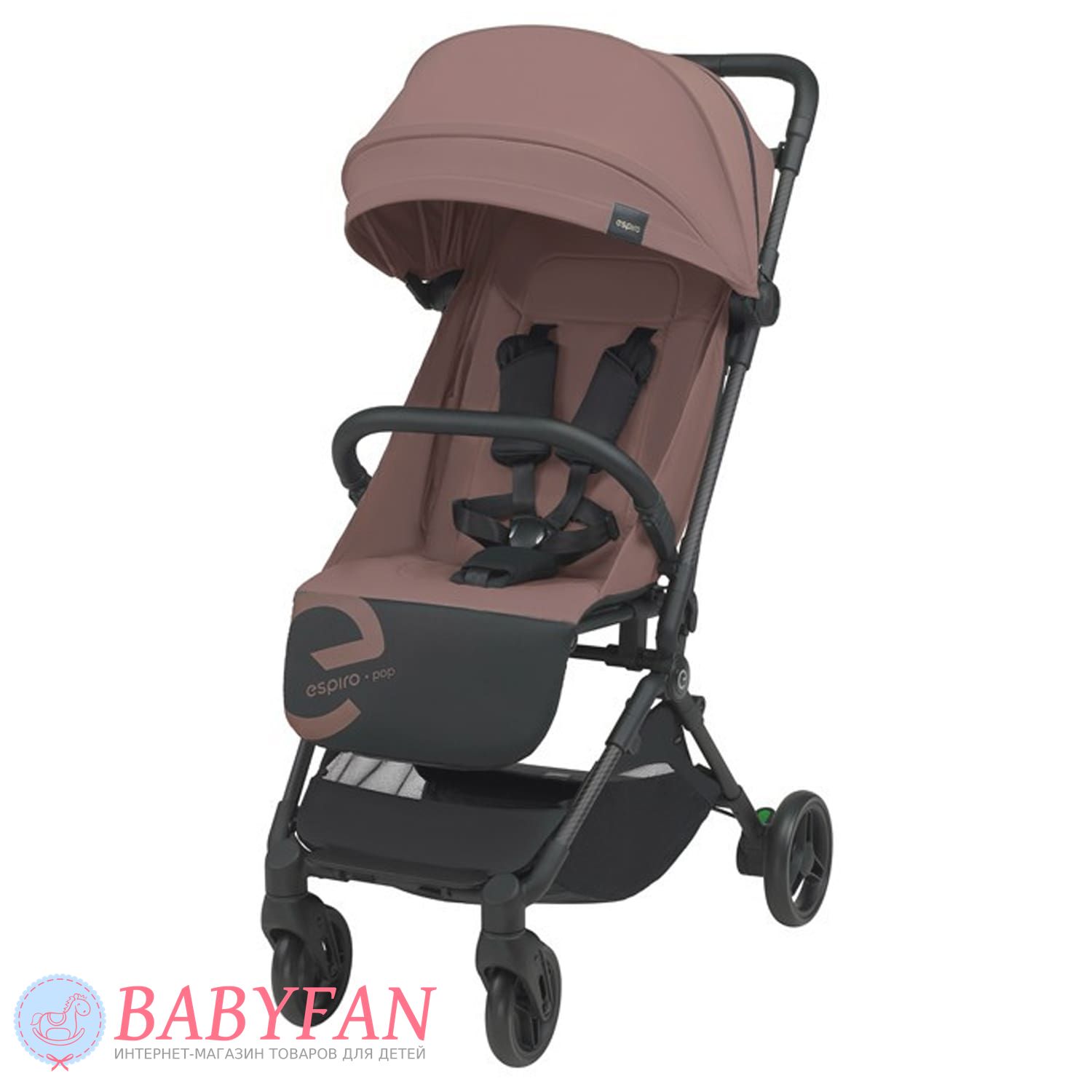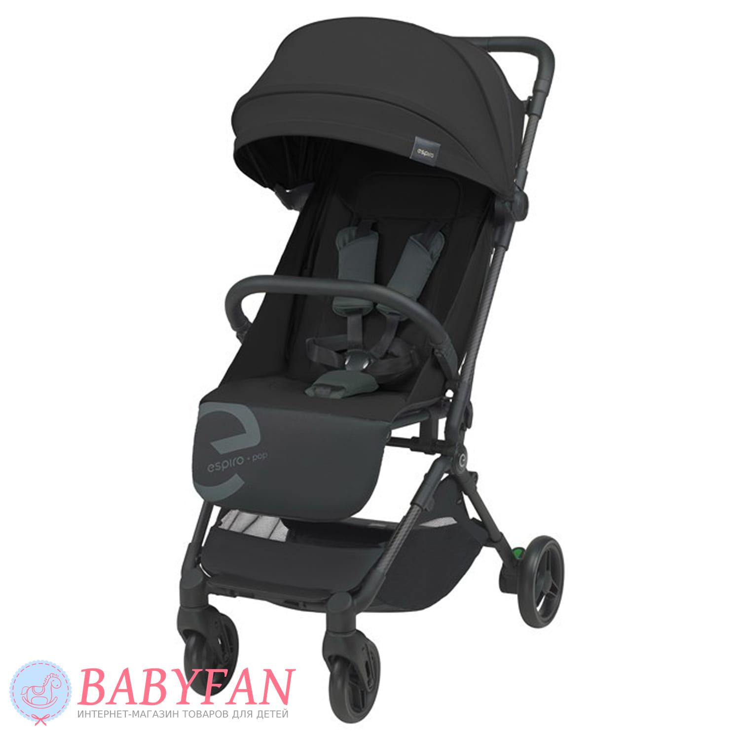 Espiro Pop – ультралегка коляска для подорожей для дітей від 6 місяців до 4 років, вагою до 22 кг. Виконана у 4-колісному класичному дизайні – 2 колеса меншого розміру спереду та 2 більшого розміру ззаду. Виготовлена із міцних, довговічних та якісних матеріалів: рама з карбону, текстиль із водовідштовхувального щільного матеріалу, покришки коліс зі спіненого поліуретану. Легко складається однією рукою. У складеному стані прогулянковий візок самостійно стоїть, поміщається в багажник хетчбека та ручну поклажу літака.