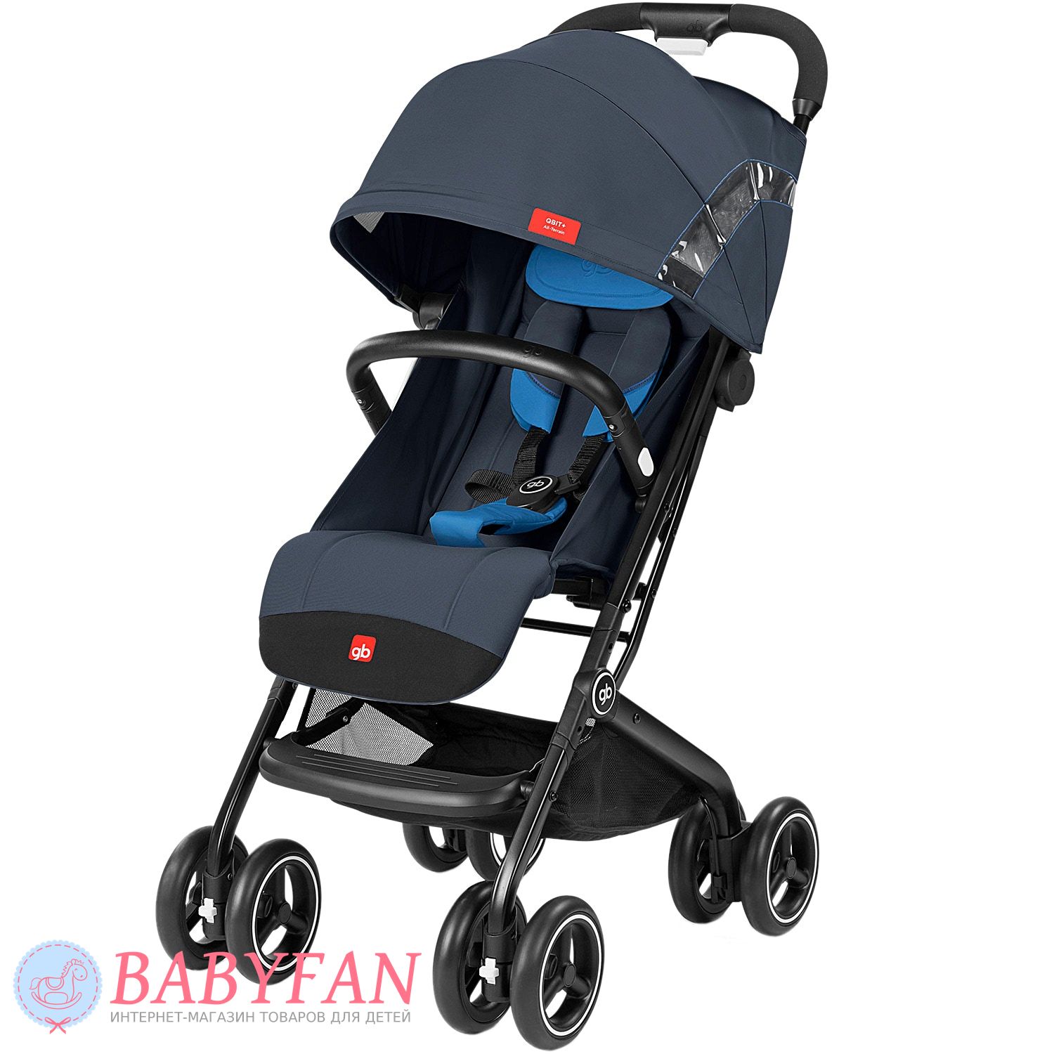 GB Qbit+ All Terrain – прогулянковий візочок з механізмом складання «книжка» для новонароджених немовлят до 4 років. Завдяки своїй компактності та легкості, ідеальна для подорожей в автомобілі чи літаку – поміщається в ручну поклажу. Витримує вагу чотирирічної дитини, допустиме навантаження – 17 кг. З шасі з алюмінію, знімним прогулянковим блоком та знімним чохлом. Компактно складається однією рукою і самостійно стоїть у складеному вигляді.