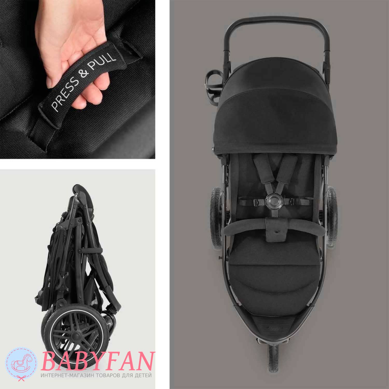 - просте додавання (на сидіння є спеціальний ремінець, за який треба просто потягнути) в компактну конструкцію. Складена коляска завдяки спеціальній системі може переноситися на плечі. При зберіганні/транспортуванні вона посідає мало місця;