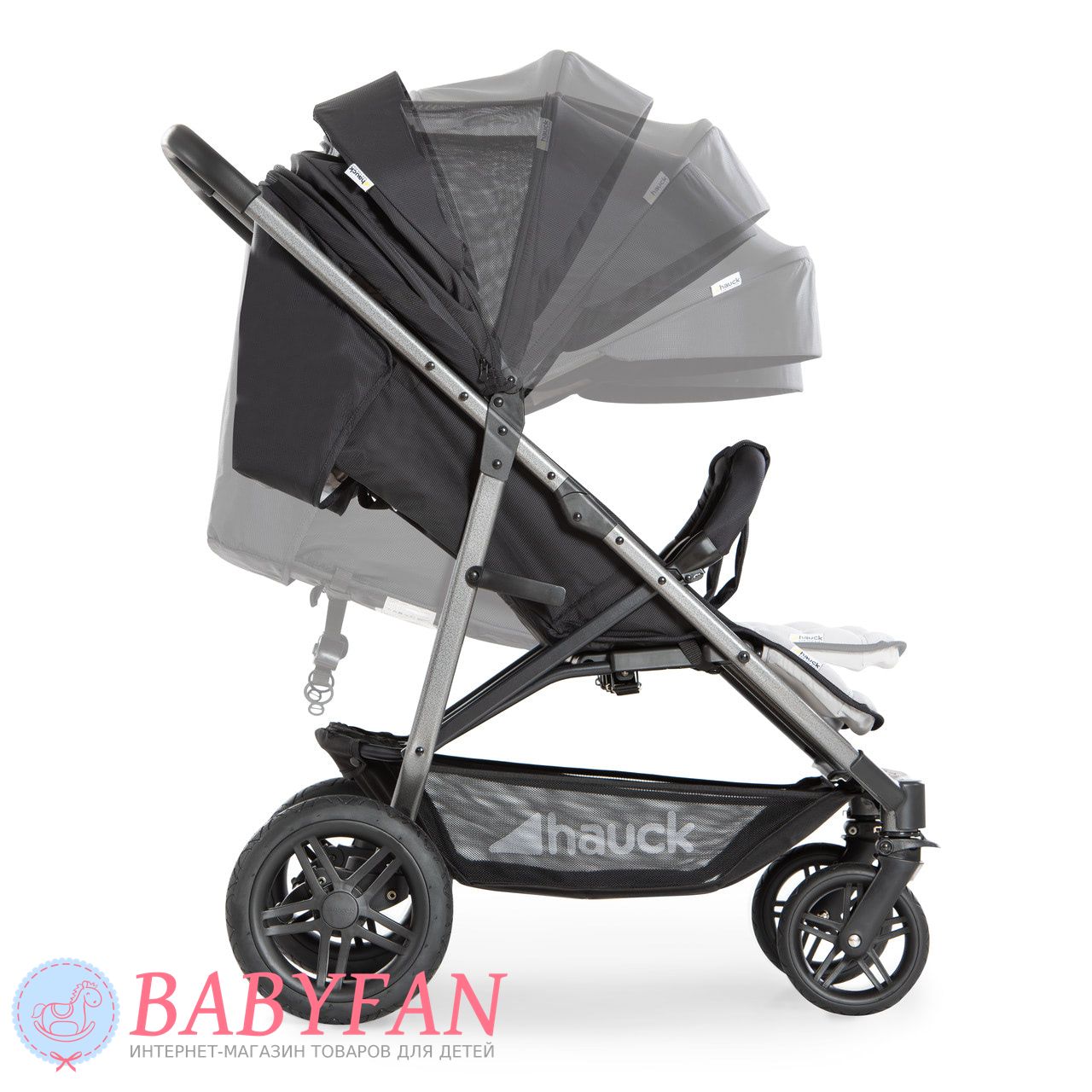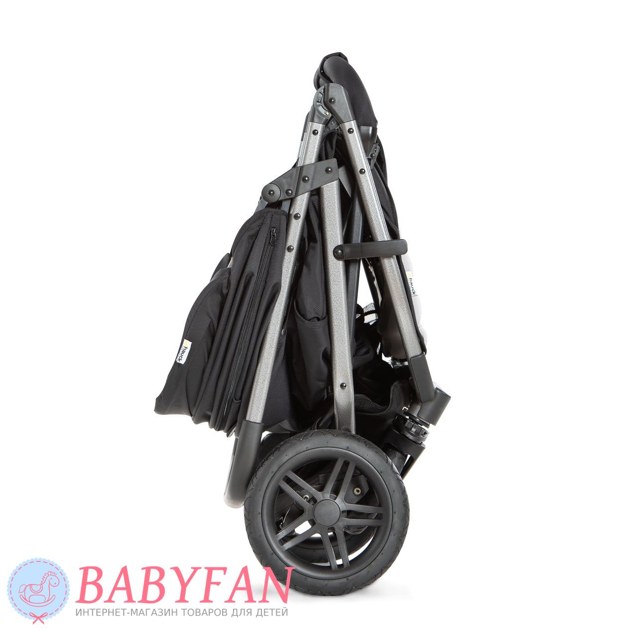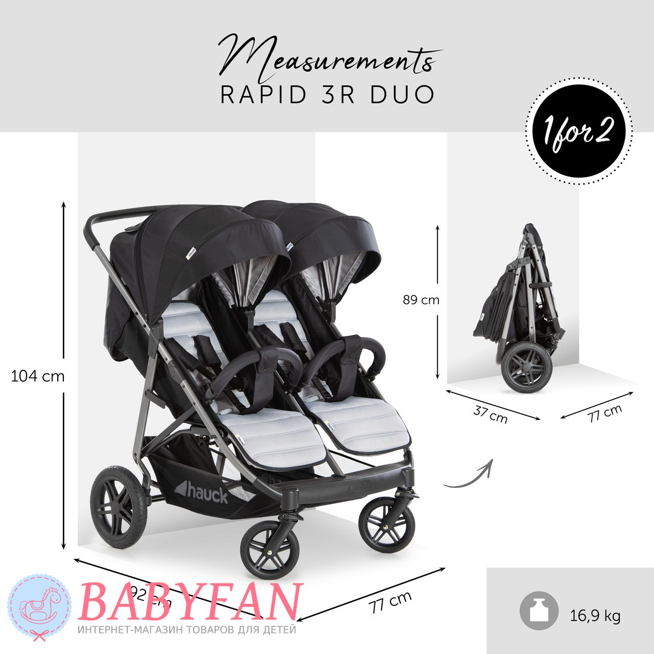 - коляска Hauck Rapid 3R Duo швидко складається однією рукою на кшталт «книжка». Складена «книжка» вільно розміщується в багажному відділенні, завдяки чому не виникає проблем із її транспортуванням та зберіганням;