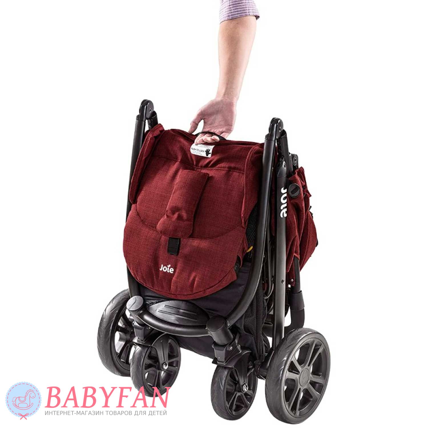 - тканинна ручка, вмонтована в середню частину сидіння, використовується для складання коляски, достатньо потягнути за ручку і коляска моментально складеться навпіл. Від мимовільного розкладання складена коляска має спеціальний захист. У складеному вигляді конструкція стоїть у вертикальній площині без додаткової опори;