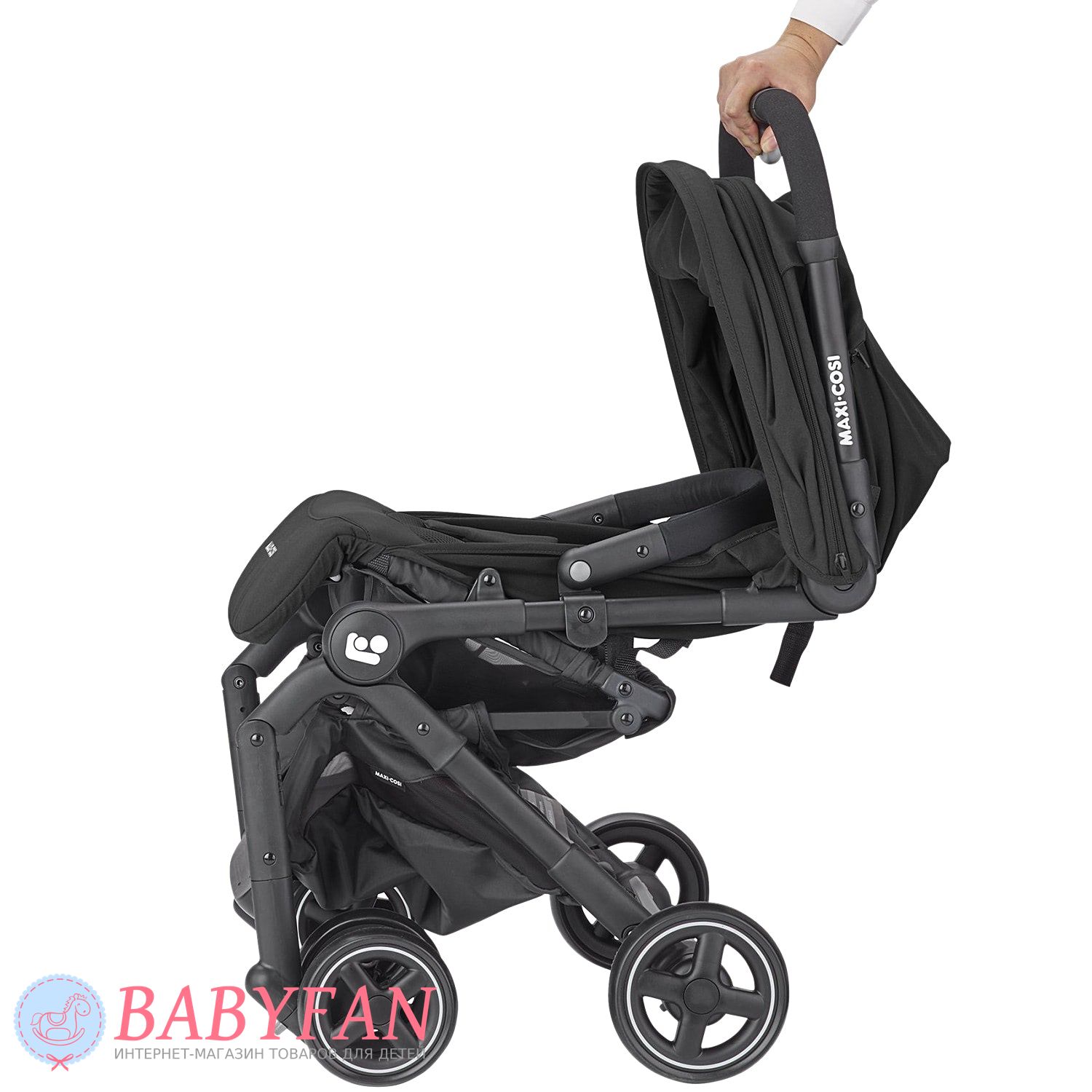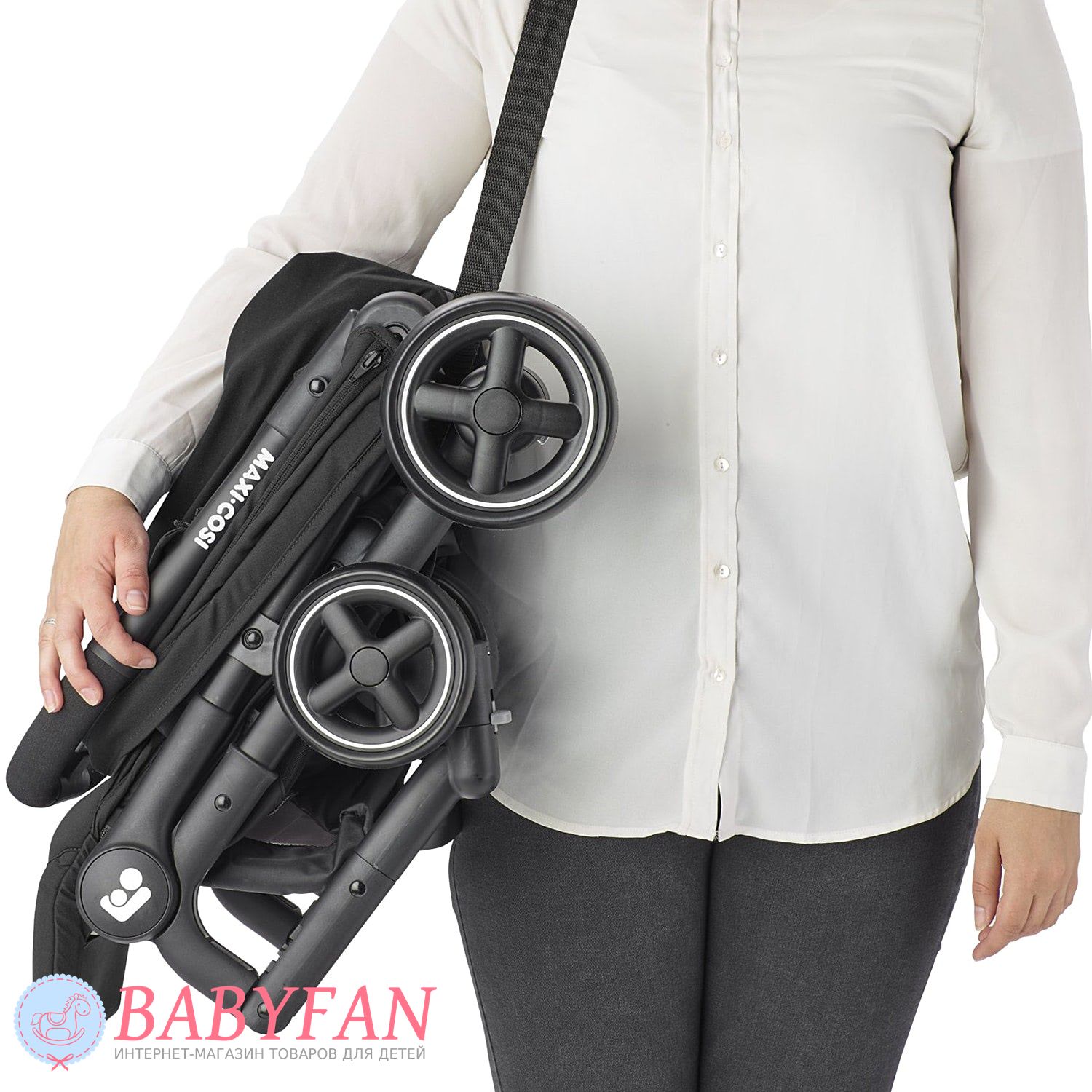 - коляска моментально складається, причому задіюється для цього лише одна рука. У складеному вигляді коляска знаходить ультракомпактні розміри, передбачений захист від мимовільного розкладання. У складеному вигляді коляску Maxi-Cosi Lara зручно переносити на плечі, скориставшись вбудованим плечовим ременем;