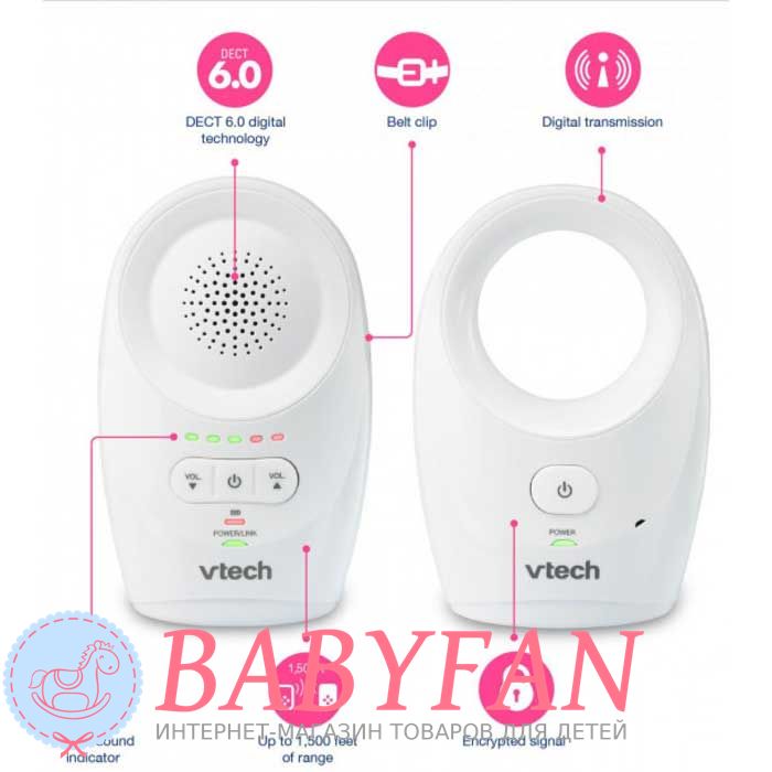 Радіоняня з одностороннім зв'язком Vtech DM1111 – удосконалений звуковий прилад, що дозволяє батькові тримати на контролі дії дитини та керувати нею, перебуваючи в іншій кімнаті. Батьківський блок оснащений затискачем, що дозволяє зафіксувати елемент на ремені або поясі штанів. Завдяки п'ятирівневому звуковому індикатору та цифровій передачі звуку DECT забезпечується гарний зв'язок та налаштування приладу відповідно до своїх вимог.