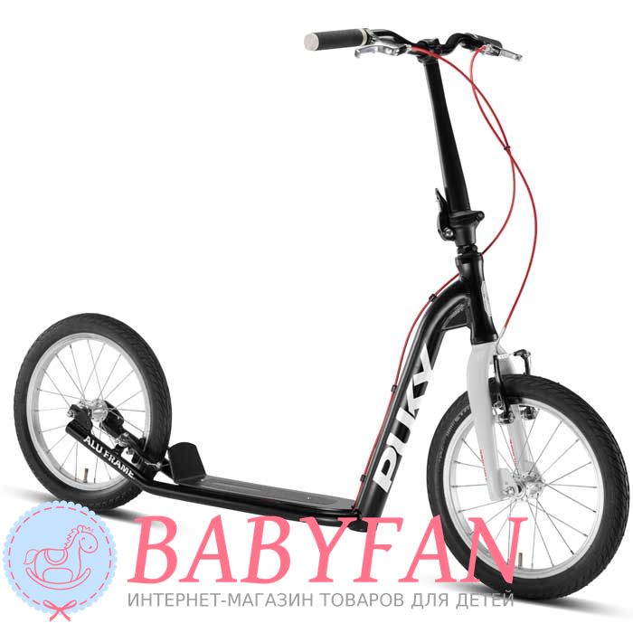 Puky Joker – двоколісний складаний самокат для дітей старше 8 років з великими надувними колесами та двома ручними гальмами у класичному дизайні. Призначений для дітей, підлітків і навіть дорослих, обмеження зростання – від 135 до 190 см, за вагою – до 120 кг. Рама сталева, покрита стійкою, до появи подряпин порошковою фарбою не вигоряє. Колеса великого діаметру – 16 дюймів, багатоспицеві, надувні. Покришки з протектором із гуми. Кермо вигнуте, оснащене двокомпонентними протиковзними грипсами, що добре поглинають вібрації від дороги. Кермо регулюється по висоті, легко складається.