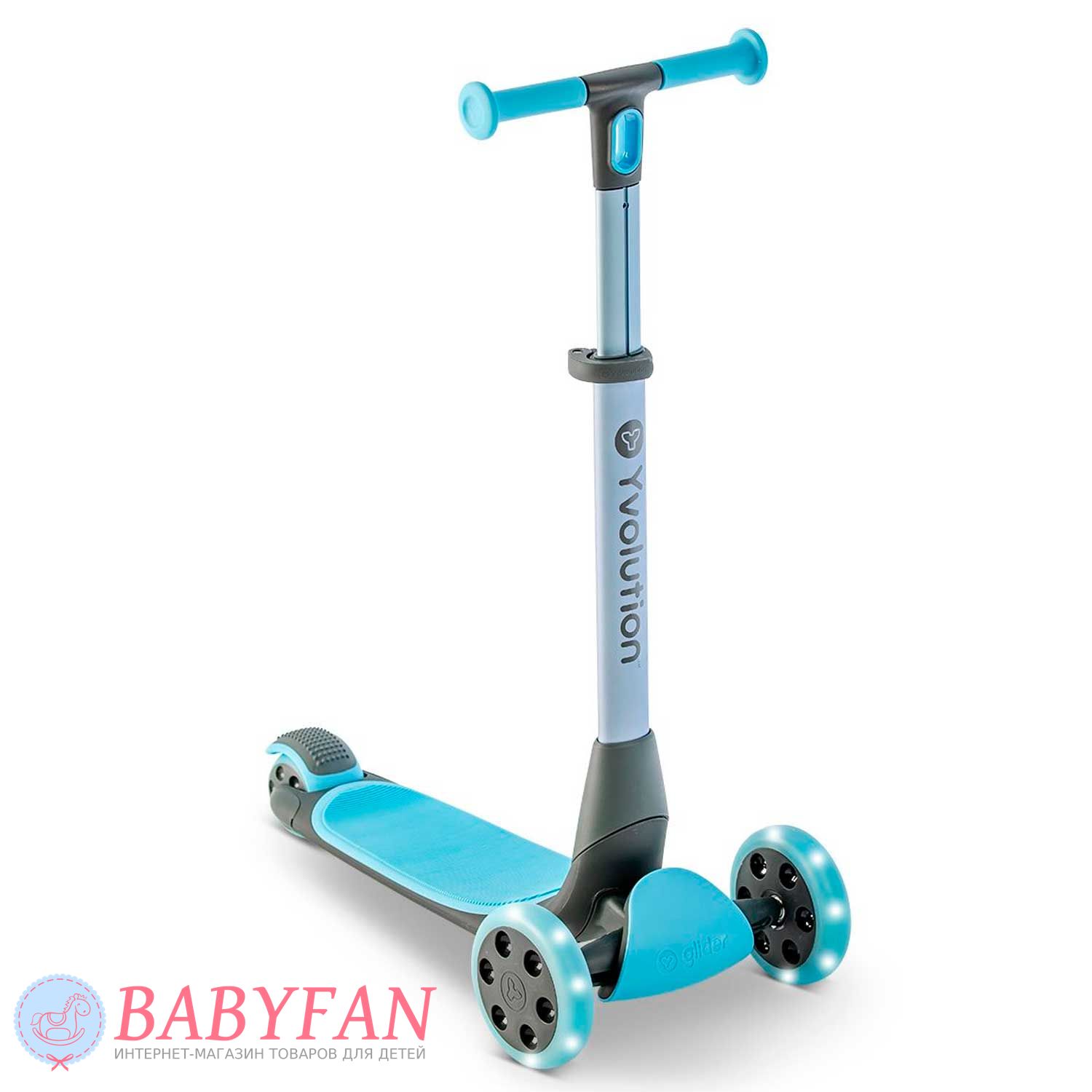 Yvolution YGlider NUA – триколісний складаний самокат зі світлодіодними передніми колесами, регульованим по висоті кермом та широкою декою для обох ніг для дітей віком від 3 до 10 років, обмеження за вагою дитини – до 50 кг. Виконаний у сучасному, яскравому та привабливому дизайні. Виготовлений з якісних, практичних та довговічних матеріалів: алюмінієва рама з елементами із пластику, поліуретанові литі колеса. Компактно складається для перенесення та зберігання – у комплекті передбачений кронштейн на стіну для фіксації самокату.