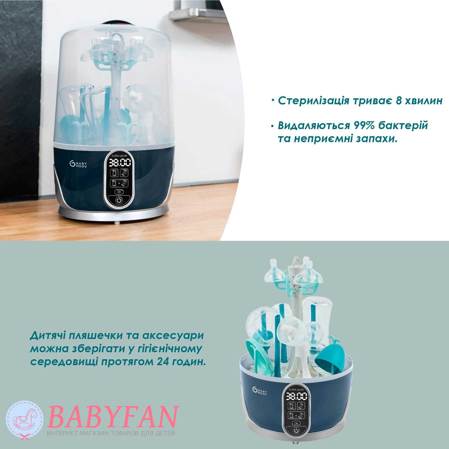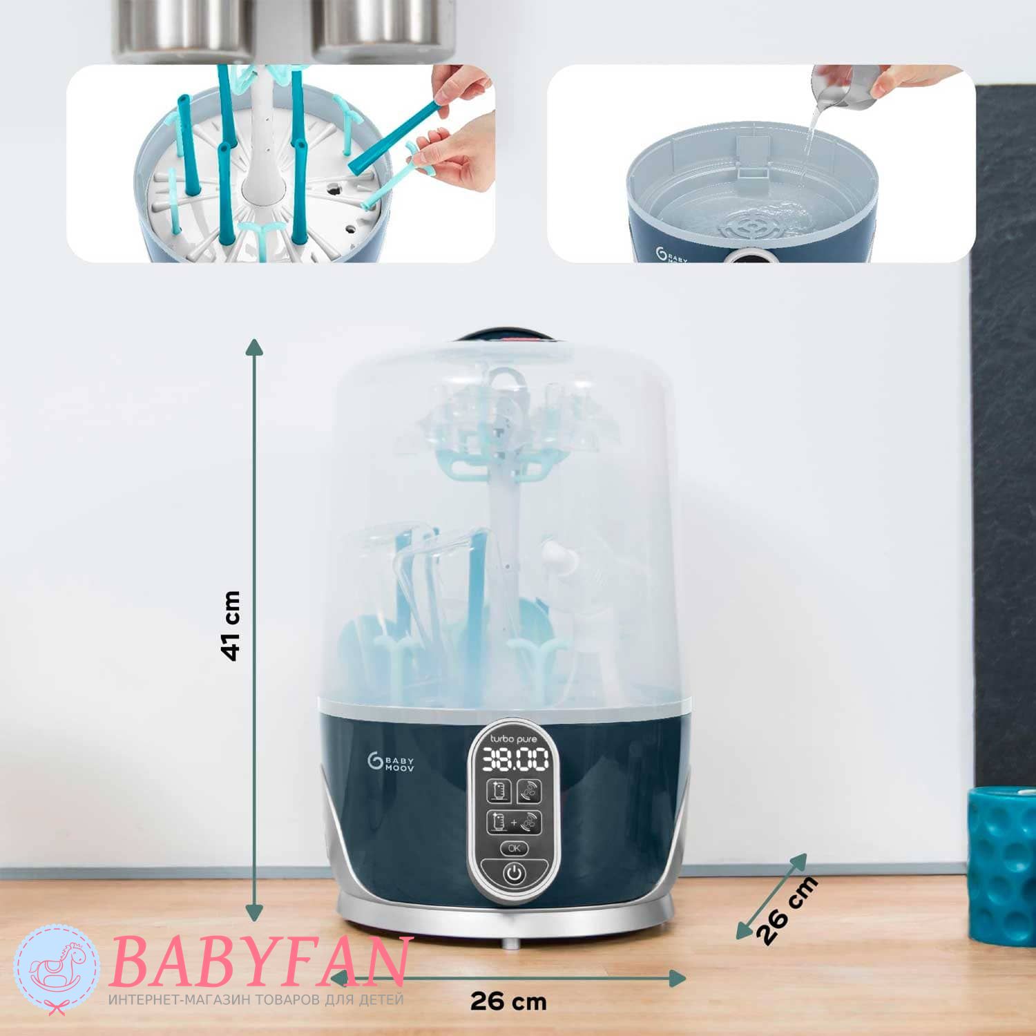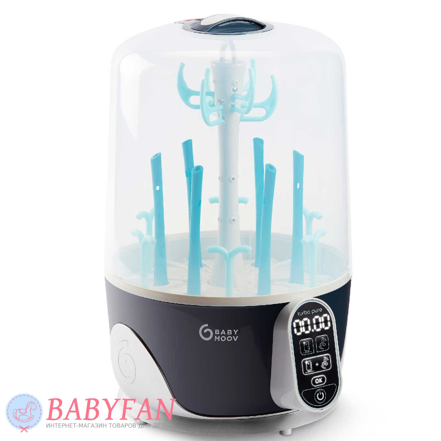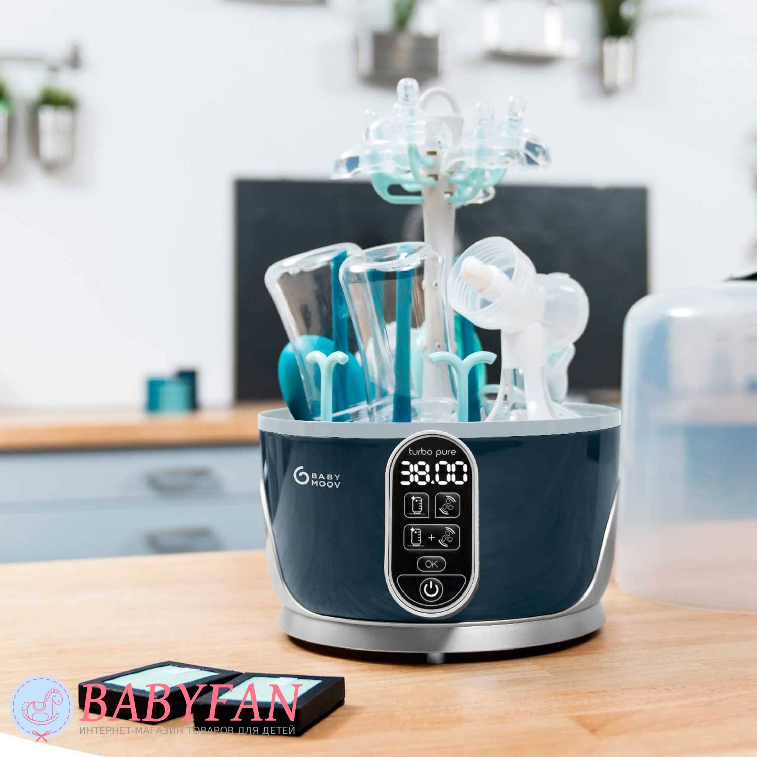 Стерилізатор Babymoov Turbo Pure - чудовий знищувач мікробів на дитячих пляшечках, сосках і частинах молоковідсмоктувача дуже нагоді дбайливій мамі. На тримачах парового стерилізатора Babymoov є отвори для випуску пари, що дозволяє стерилізувати, сушити посуд та аксесуари у самому центрі. За допомогою парового стерилізатора Babymoov у батьків з'явиться більше вільного часу, щоб провести його з користю.