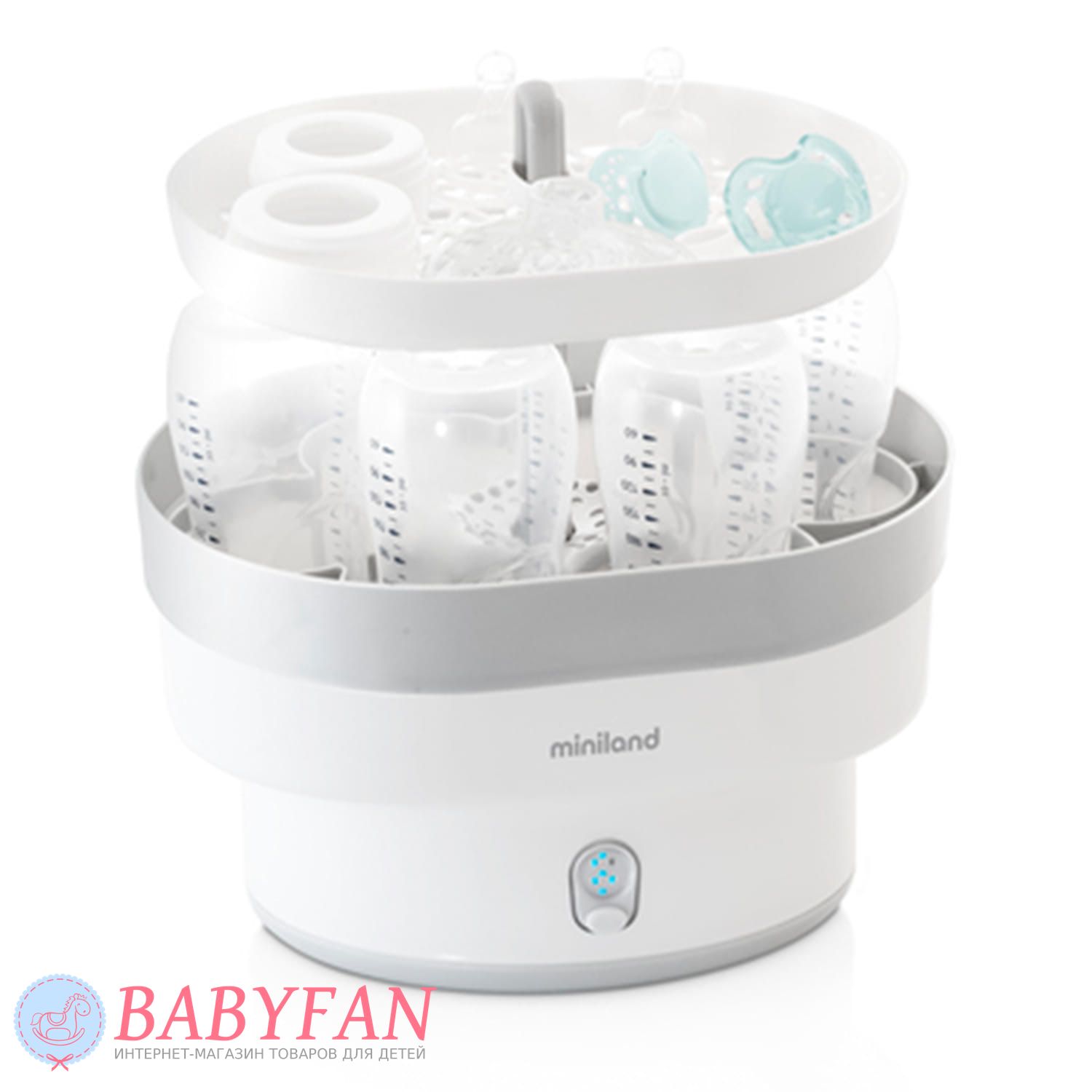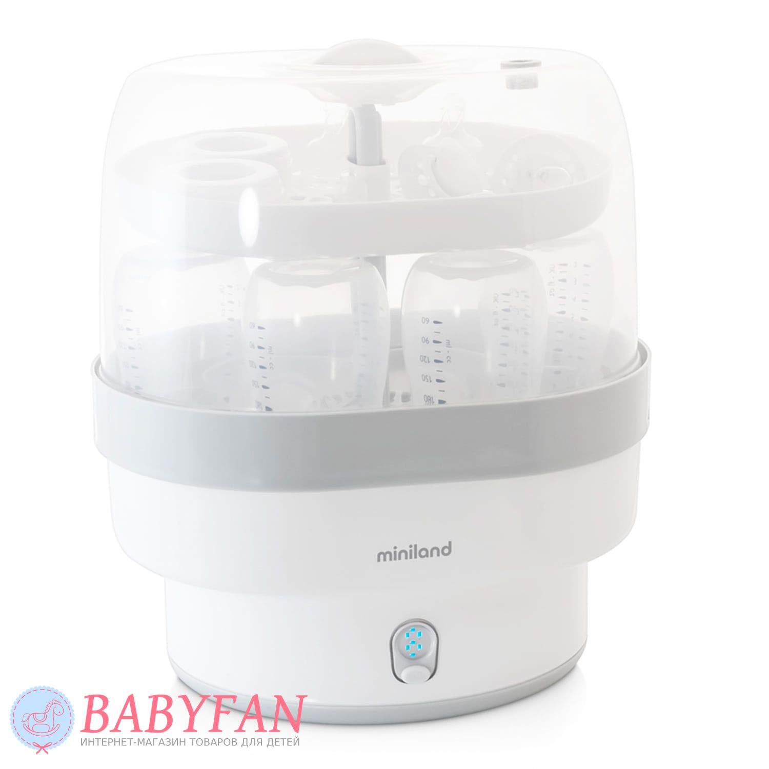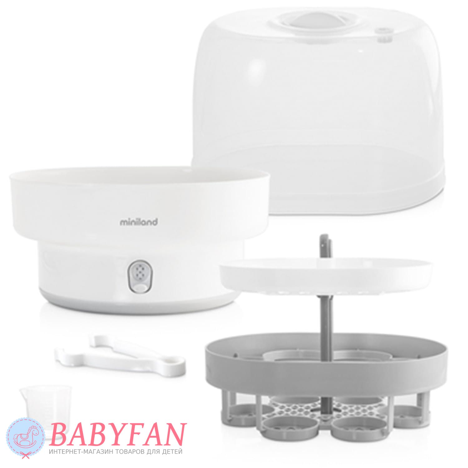 Стерилізатор Miniland Steamy - потужний стерилізатор, що одночасно вміщує в собі 6 пляшечок. З таким аксесуаром можна забути про додаткові засоби для чищення, оскільки пара забезпечує 100% стерилізацію. Стерилізатор Miniland Steamy відрізняється швидкістю, достатньо кількох хвилин для стерилізації пляшечок та аксесуарів для годування, стерильність яких збережеться протягом 3-х годин. Це зручний догляд та зберігання прилад з цифровим дисплеєм, на якому відображається час стерилізації. Завдяки автоматичному відключенню не доводиться стояти біля нього в очікуванні закінчення процесу. Для невеликого дитячого посуду та аксесуарів для молоковідсмоктувачів передбачений спеціальний відсік. Завдяки такому помічнику пляшечки будуть надійно очищені від шкідливих бактерій та мікробів.