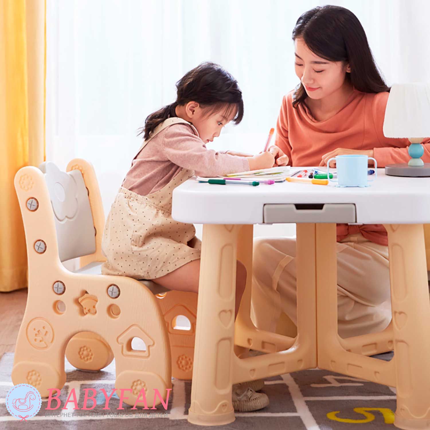 Столик Poppet Pastel квадратної форми, на 4 ніжках із протиковзкими накладками. На поверхні столу можна малювати спеціальними фломастерами. З боків розміщуються 2 висувні ящики для фломастерів, олівців та пензликів. Стіл знизу укріплений ребрами твердості – витримує до 100 кг. У міру зростання дитини регулюється висота столика та сидіння. Легко очищається вологою ганчіркою, не вбирає запахів.