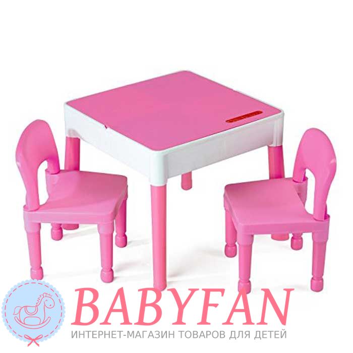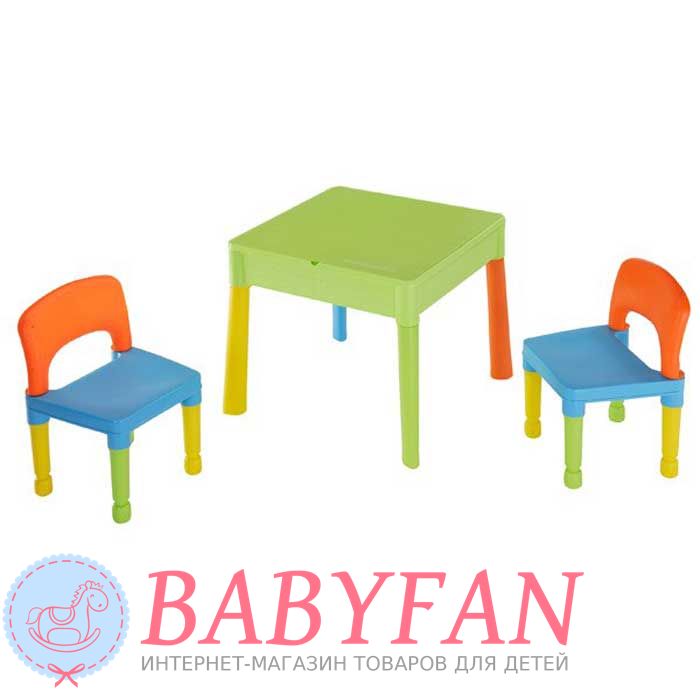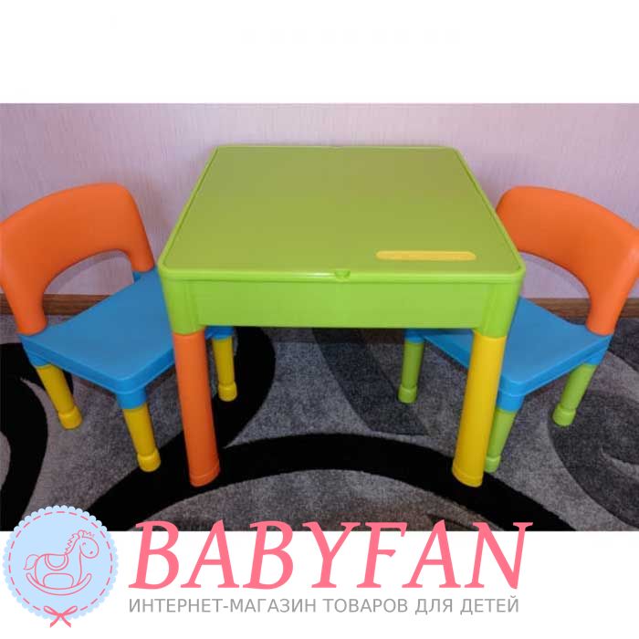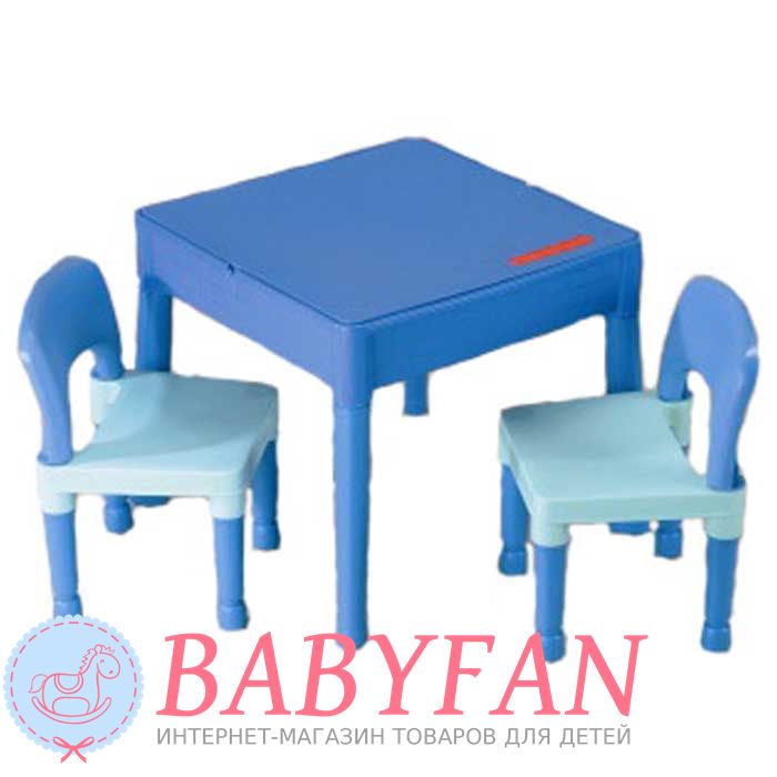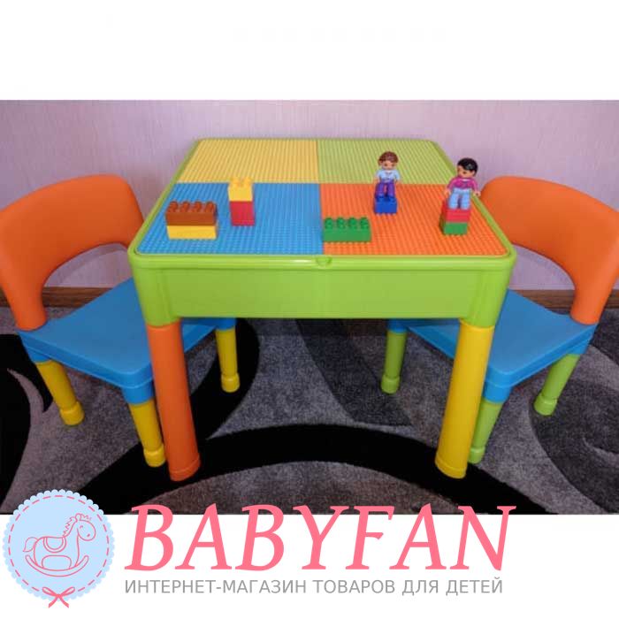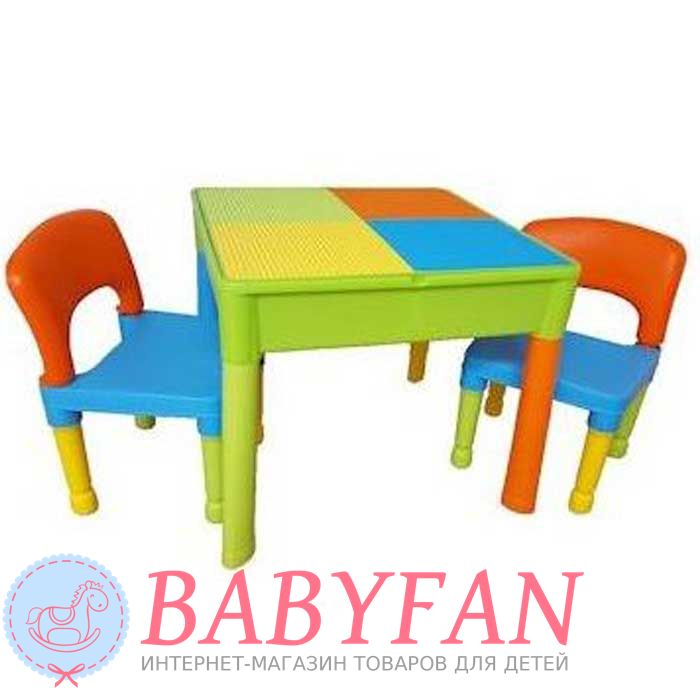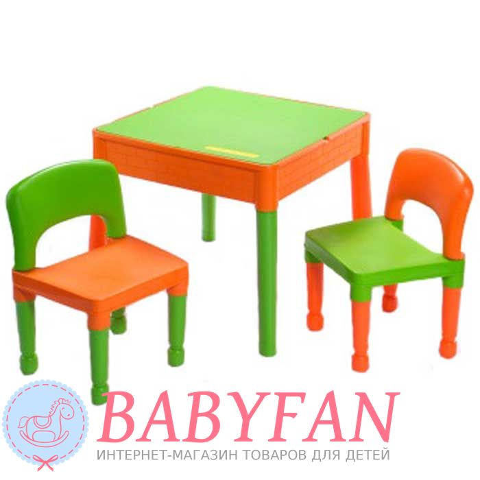 Столик та два стільчики Tega Baby Building Block – гарний та зручний комплект дитячих меблів. Набір призначений для дітей віком від 2 років. Виготовлений із нетоксичного міцного пластику. Усі кути закруглені для безпеки. Стіл може бути використаний як звичайний стіл для малювання чи навчання чи після підйому кришки, стає ігрове поле для блоків Lego. Після повного видалення стільниці може використовуватися як пісочниця, або міні-контейнер для водних розваг. Під стільницею також можна зберігати різне приладдя.