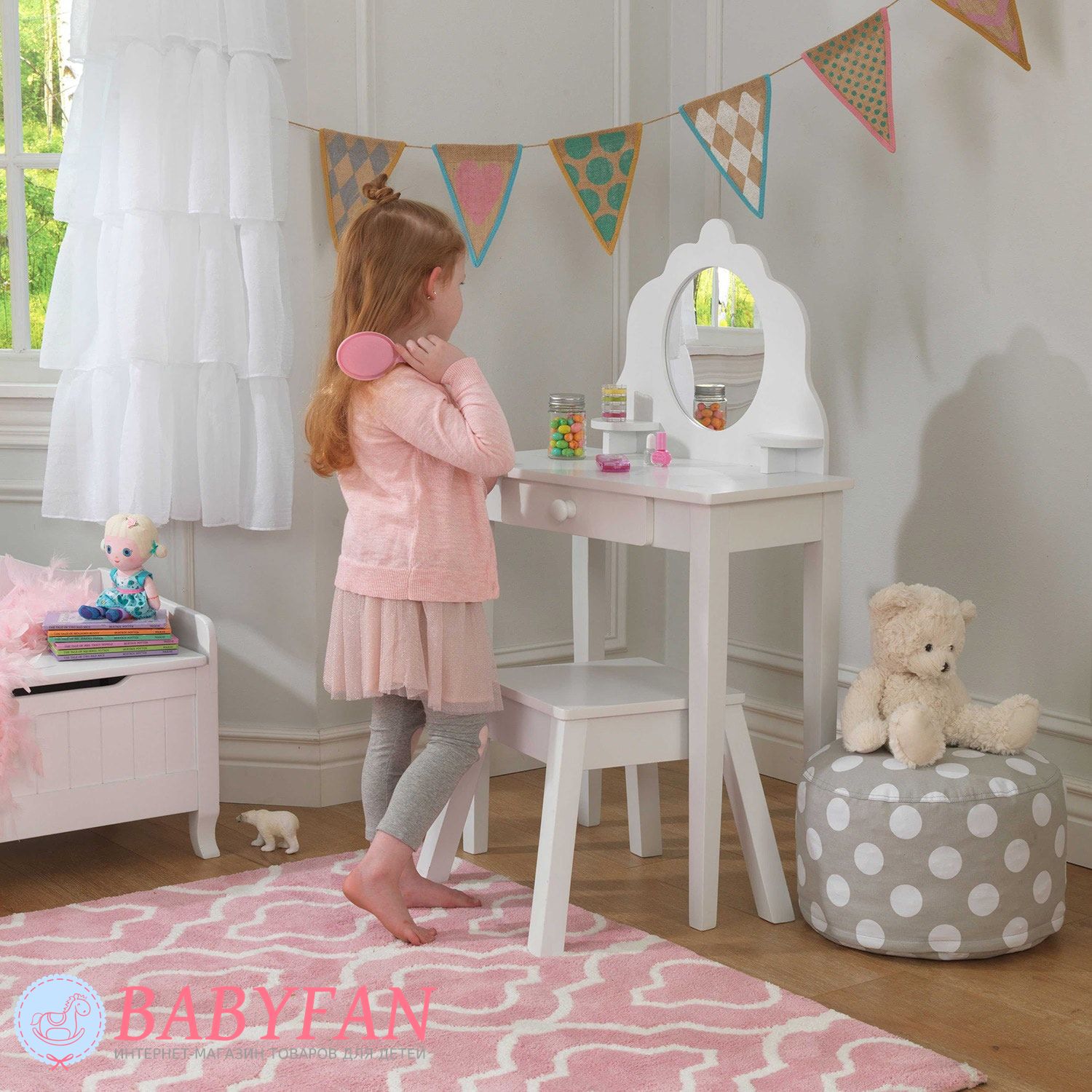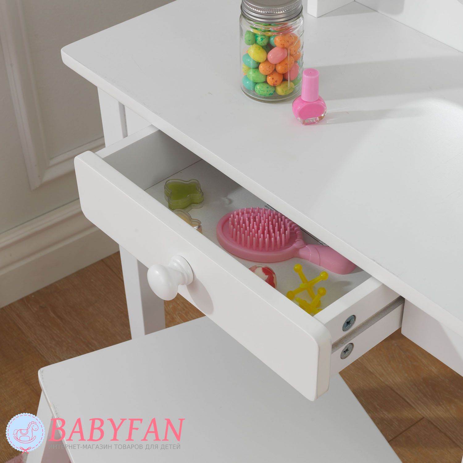 Студія краси KidKraft 13009 "Medium Diva" - класичний туалетний столик з табуретом і дзеркалом для маленьких дівчаток, які, як дорослі жінки можуть чепуритися в своїй студії краси, не заважаючи мамам і старшим сестрам. Це компактна студія краси, яка не займе багато місця в дитячій кімнаті і гармонує з будь-яким стилем інтер'єру.