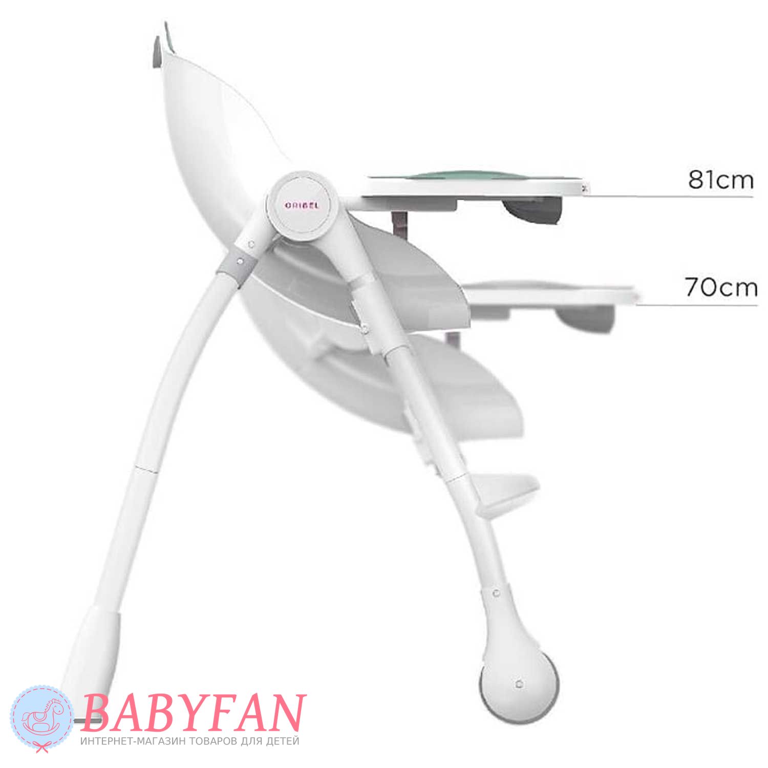 Стільчик для годування Oribel Cocoon компактно складається, у складеному стані самостійно стоїть. Рама виготовлена з алюмінію, пластикове сидіння, з глянсовим покриттям. Вкладиш знімний, протиковзкий, водонепроникний, виготовлений із прогумованого фактурного матеріалу. Стільчик обладнаний підсклянником з підносом - фіксується з кожного боку, і знімним столиком, регулюється ближче-далі, і додатковим підносом. Знятий столик магнітами кріпиться до рами позаду сидіння. Щоб переставити стільчик, його не потрібно піднімати, в основі знаходяться коліщатка і прогумовані накладки.