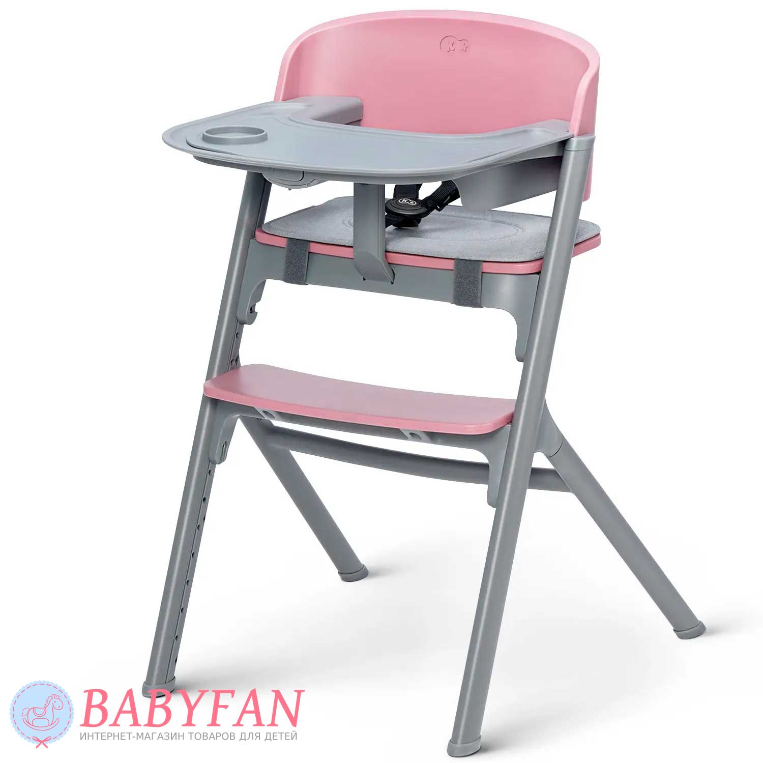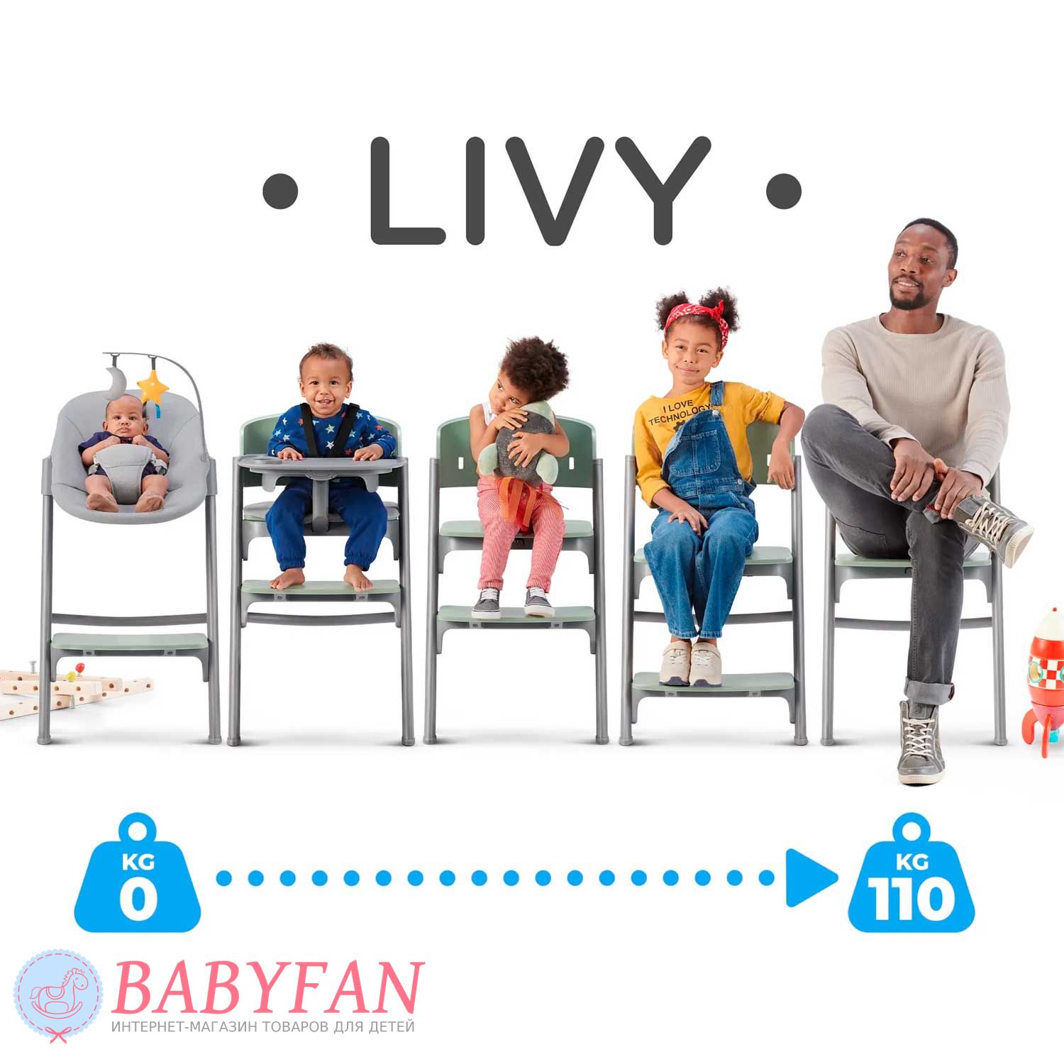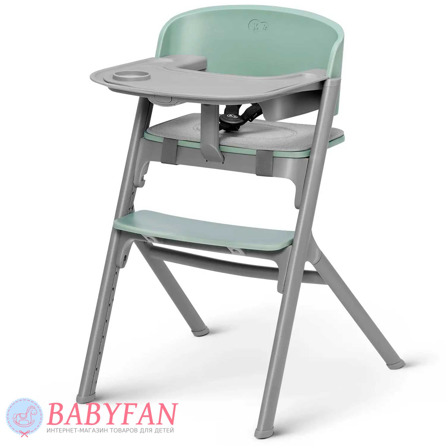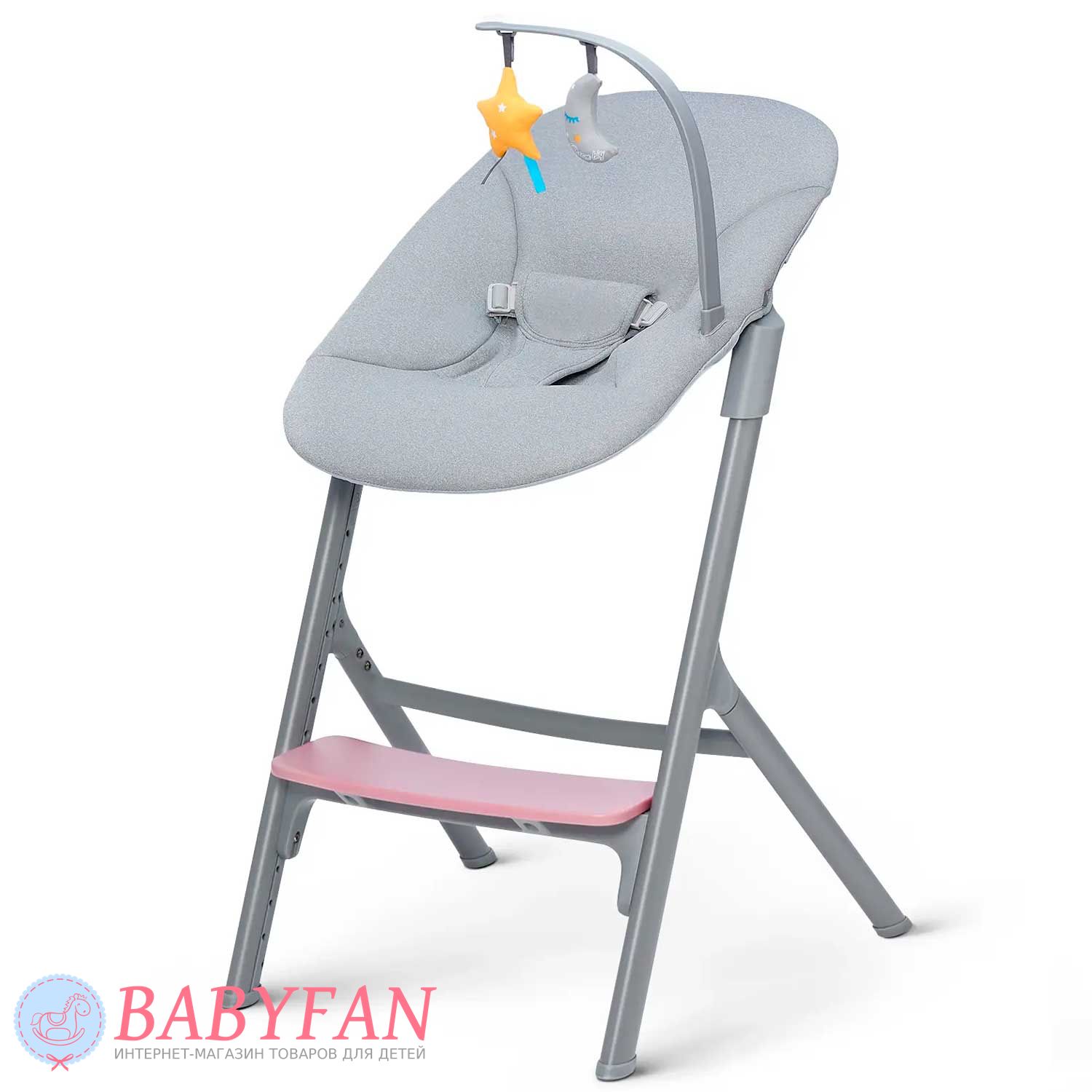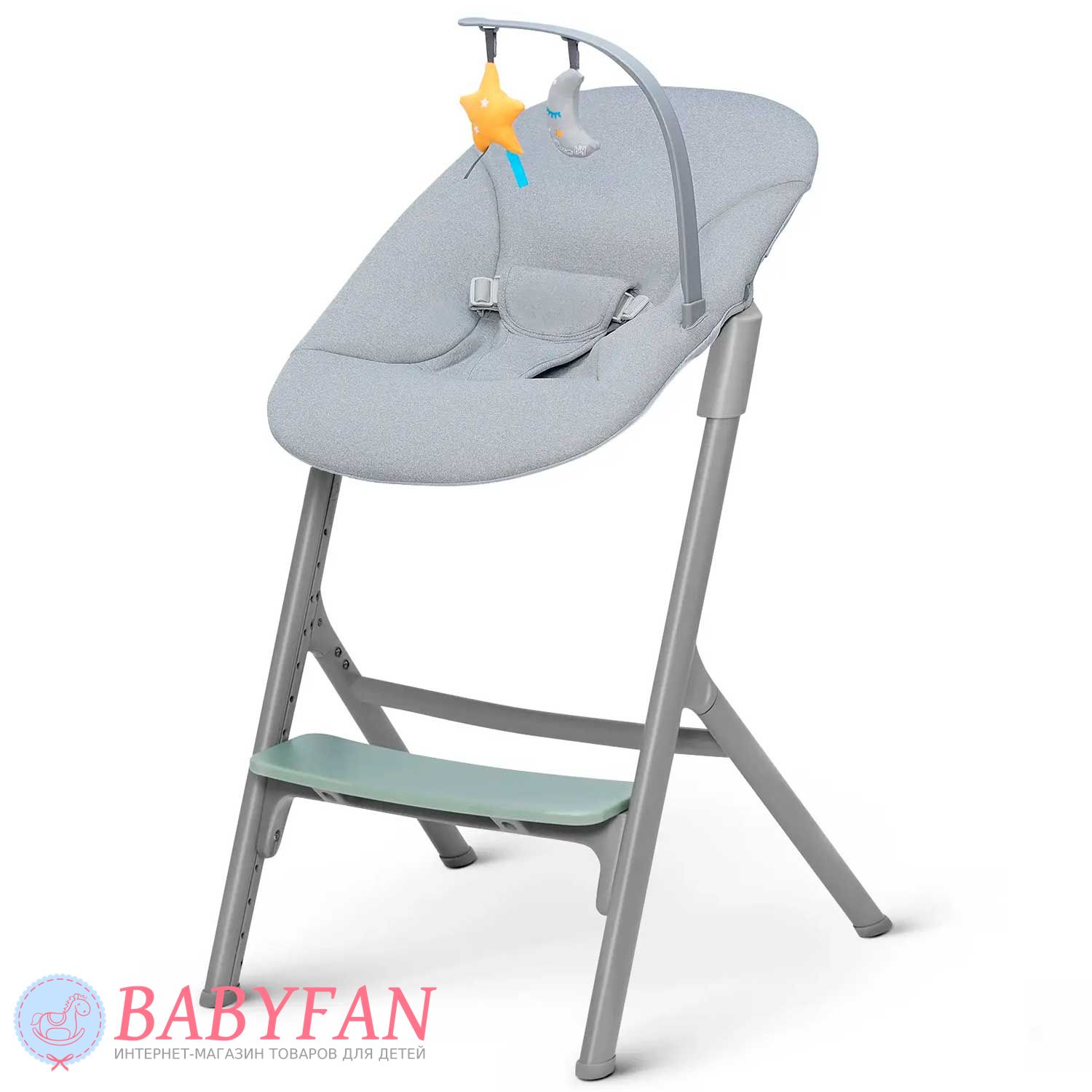 Для новонароджених немовлят на раму Kinderkraft Livy Calmee встановлюється шезлонг із щільним і приємним на дотик чохлом із поліестеру. За безпеку дитини відповідають 3-точкові ремені безпеки. Ремені не натирають, закриті у текстильній кишені. На бічну грань встановлюється дуга з 2 м'якими іграшками, що знімаються. В міру зросту дитини (для дітей старше 6 місяців) шезлонг знімається і на його місце встановлюється регульоване сидіння зі спинкою – Kinderkraft Livy Calmee трансформується у високий стільчик для годування з сидінням і підніжкою, що регулюється по висоті.