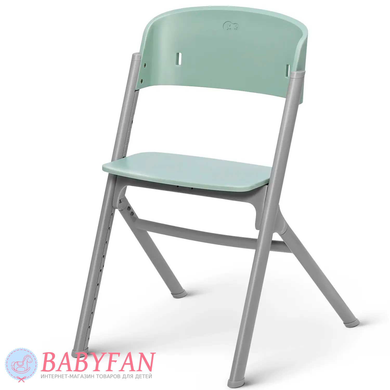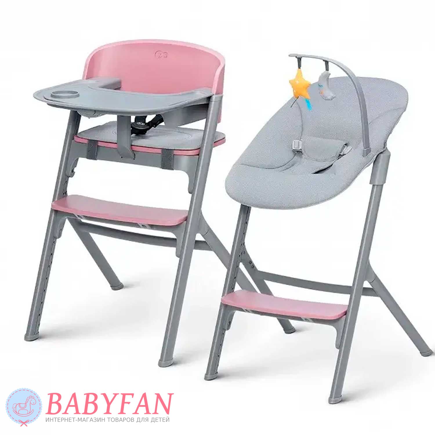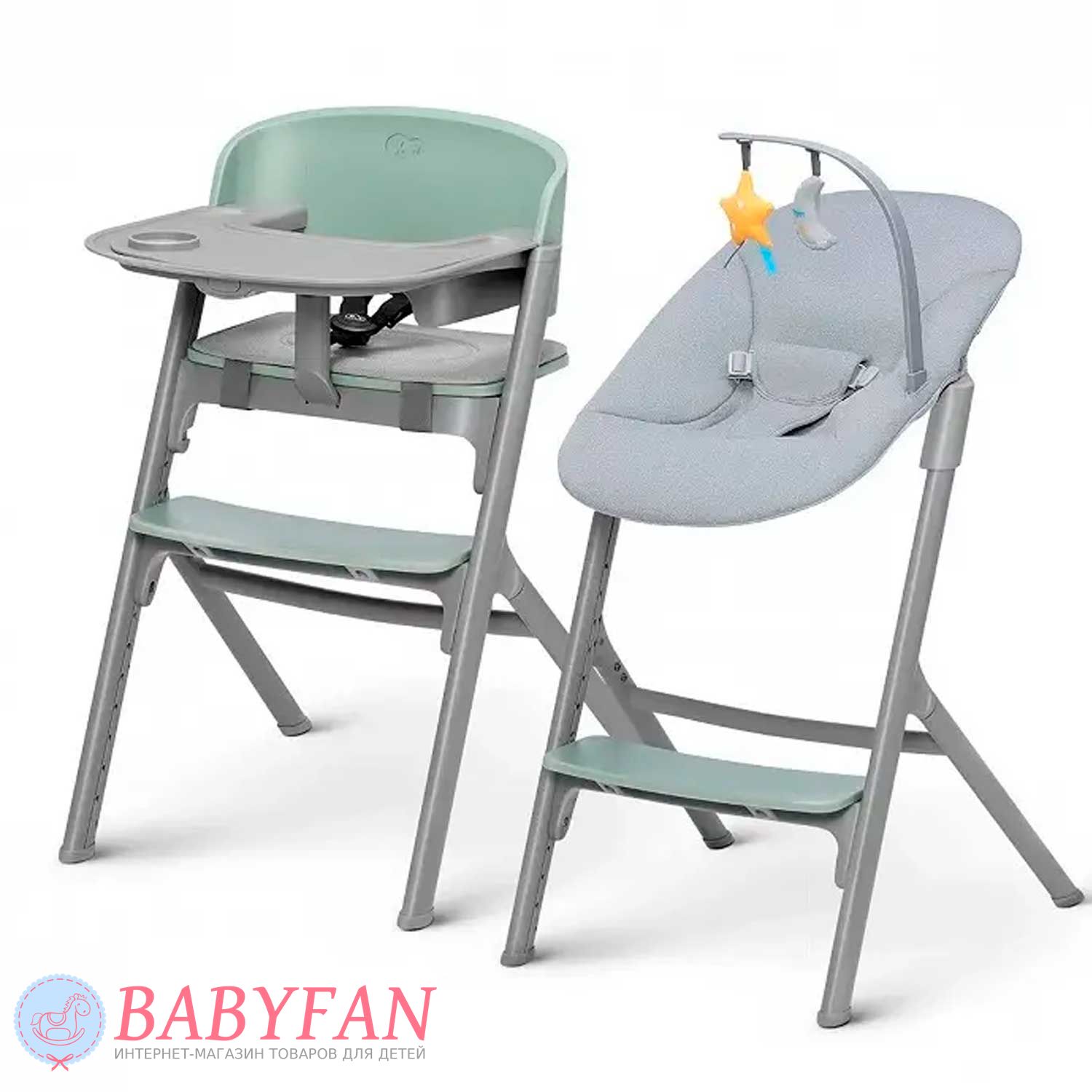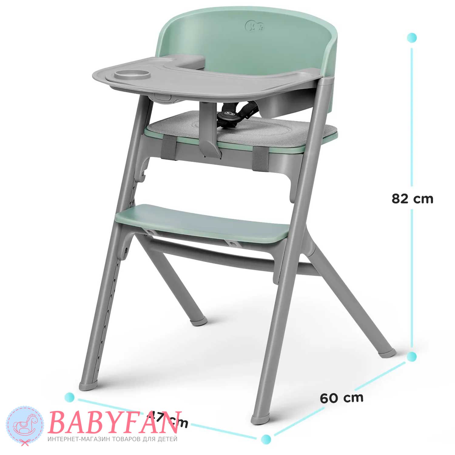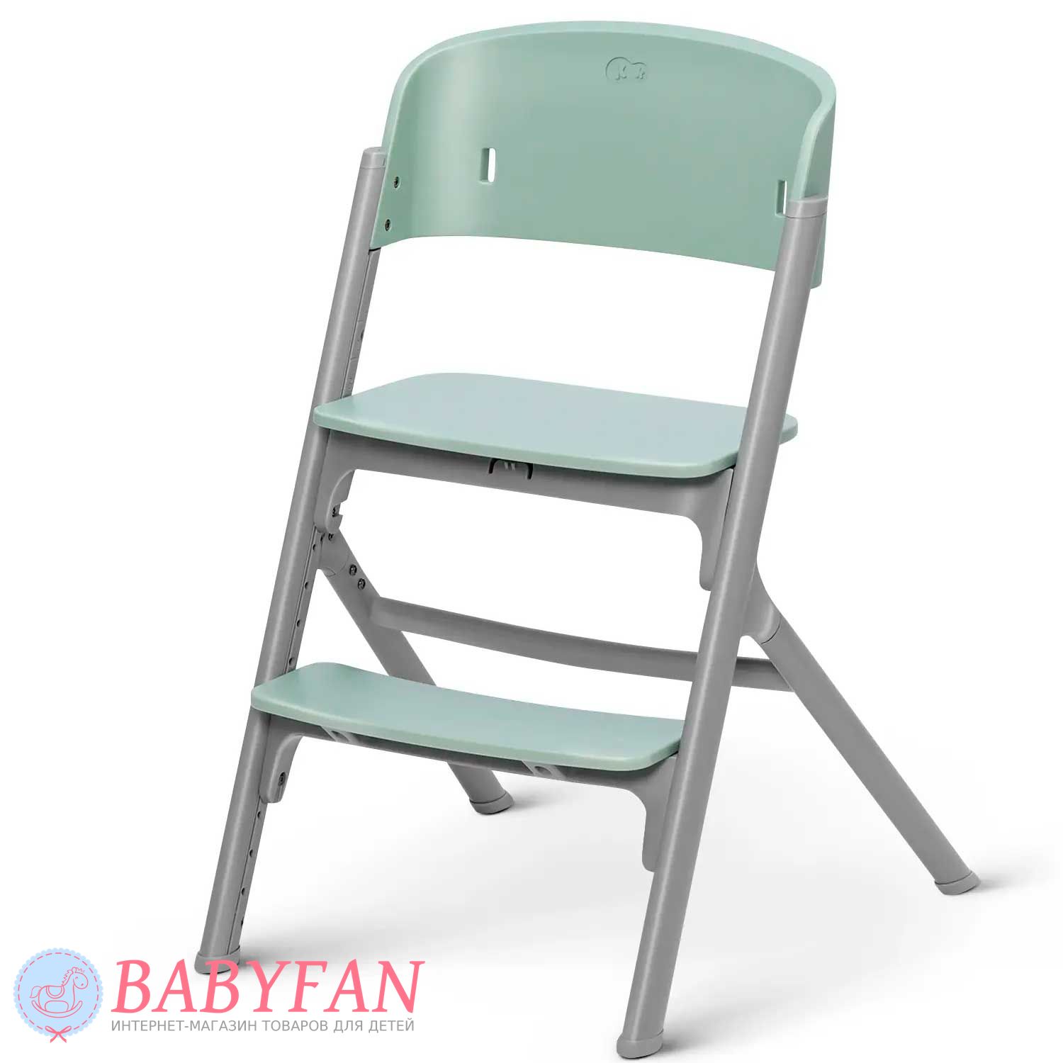 Для новонароджених немовлят на раму Kinderkraft Livy Calmee встановлюється шезлонг із щільним і приємним на дотик чохлом із поліестеру. За безпеку дитини відповідають 3-точкові ремені безпеки. Ремені не натирають, закриті у текстильній кишені. На бічну грань встановлюється дуга з 2 м'якими іграшками, що знімаються. В міру зросту дитини (для дітей старше 6 місяців) шезлонг знімається і на його місце встановлюється регульоване сидіння зі спинкою – Kinderkraft Livy Calmee трансформується у високий стільчик для годування з сидінням і підніжкою, що регулюється по висоті.