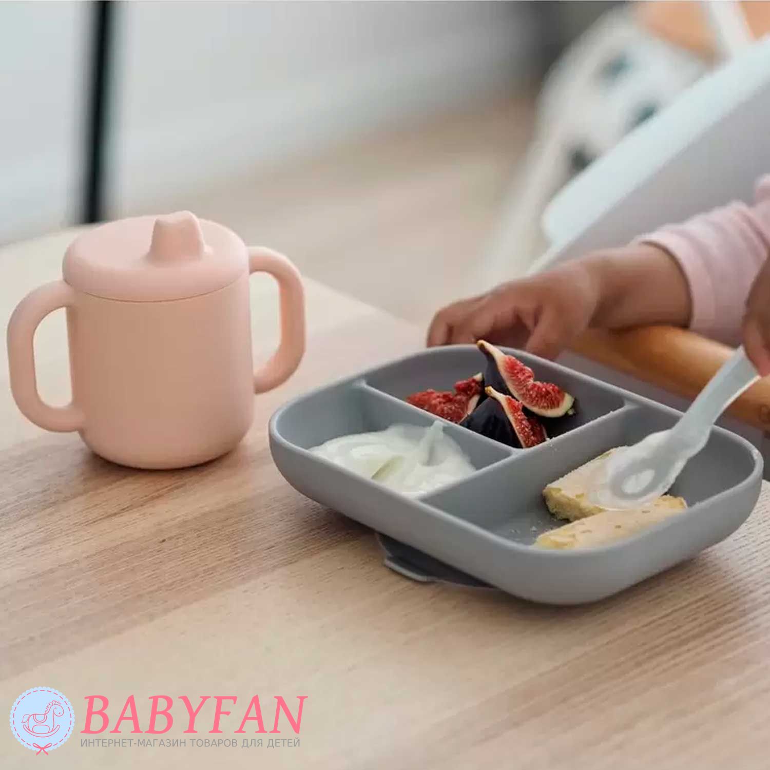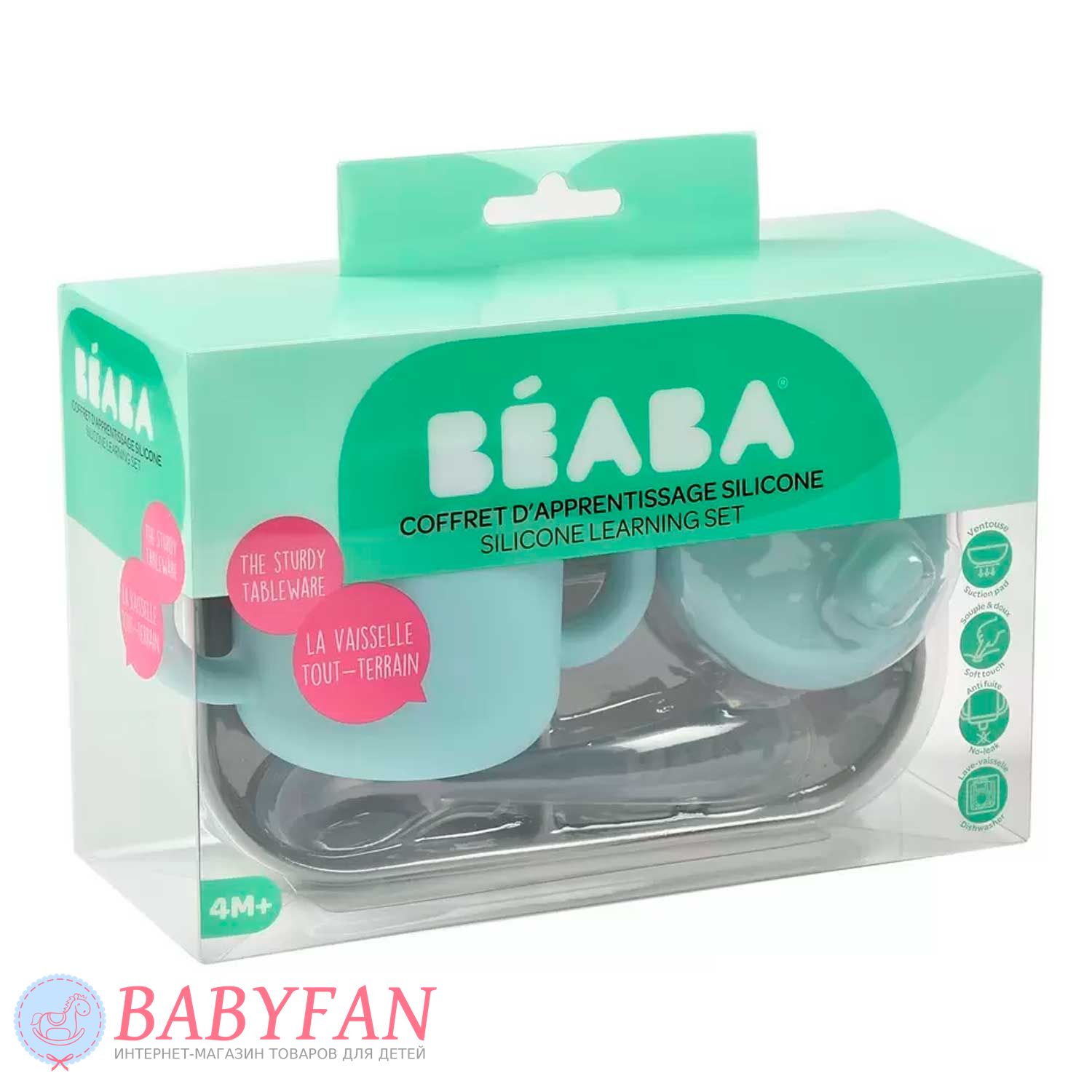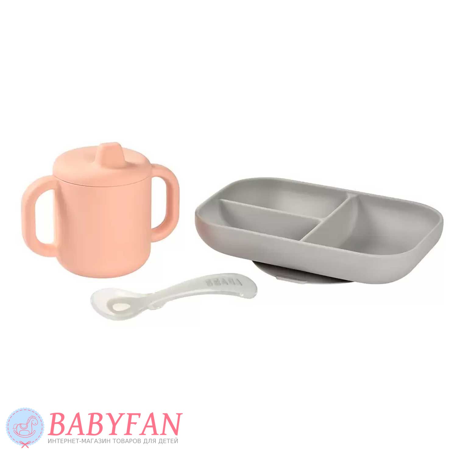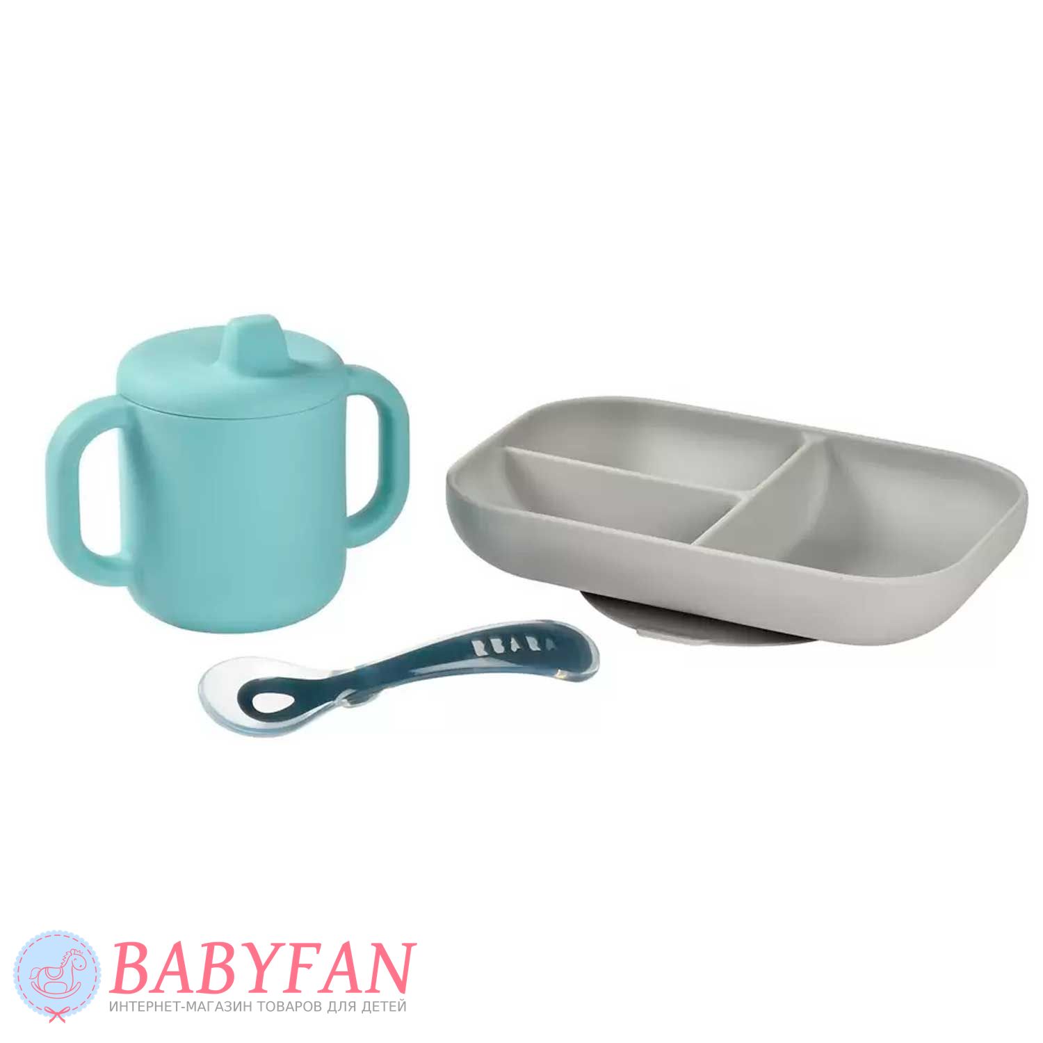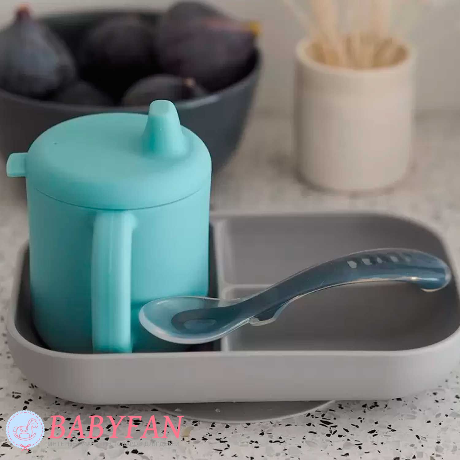 Набір силіконового посуду Beaba 3 предмета - це «вічний» посуд з харчового силікону. Безпечний, не б'ється і не дряпається, не вбирає запахи, безшумний. У комплекті: силіконова порційна тарілка, силіконовий поїльник, ложка. Об'єм тарілки: 2 відділення по 120 мл і 1 відділення на 240 мл. Розміри тарілки: 18 см х 12,5 см х 4 см, ложечка (2-й вік) - 12 см.