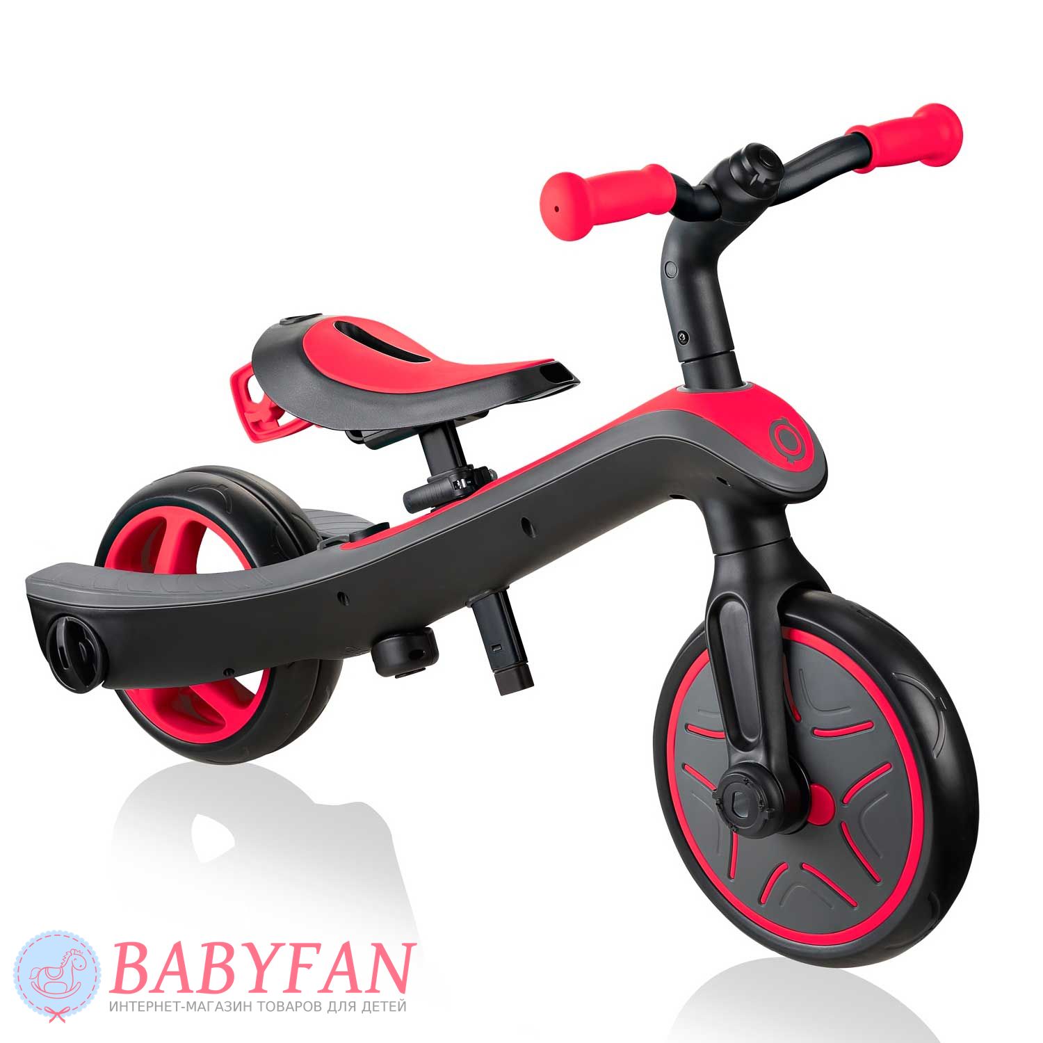 - Для дітей віком від 2 до 5 років – швидкісний двоколісний беговел Globber Explorer Trike. Задні колеса відкручуються, поєднуються та прикручуються між осями велосипеда. Педалі фіксуються під сидіння. Штурхається ногами, керується кермом.