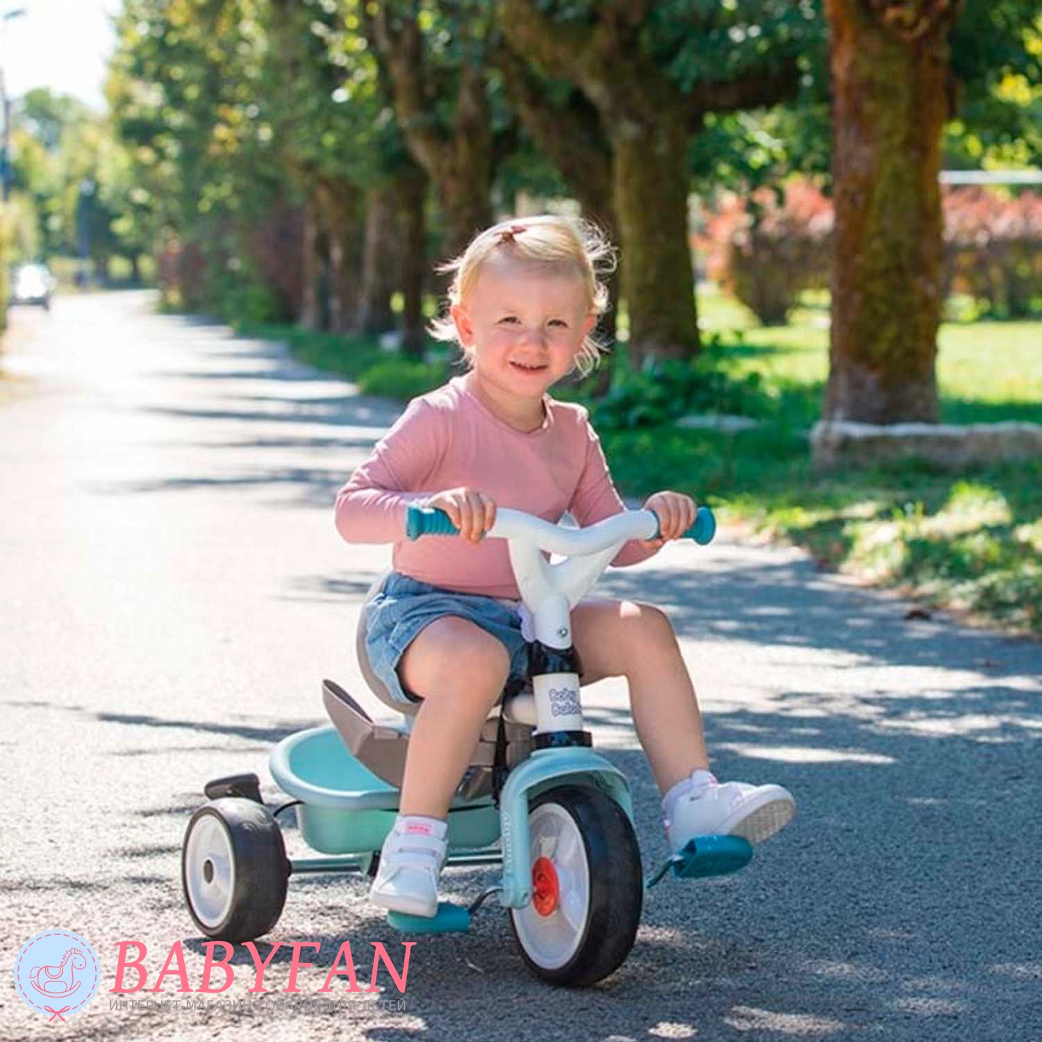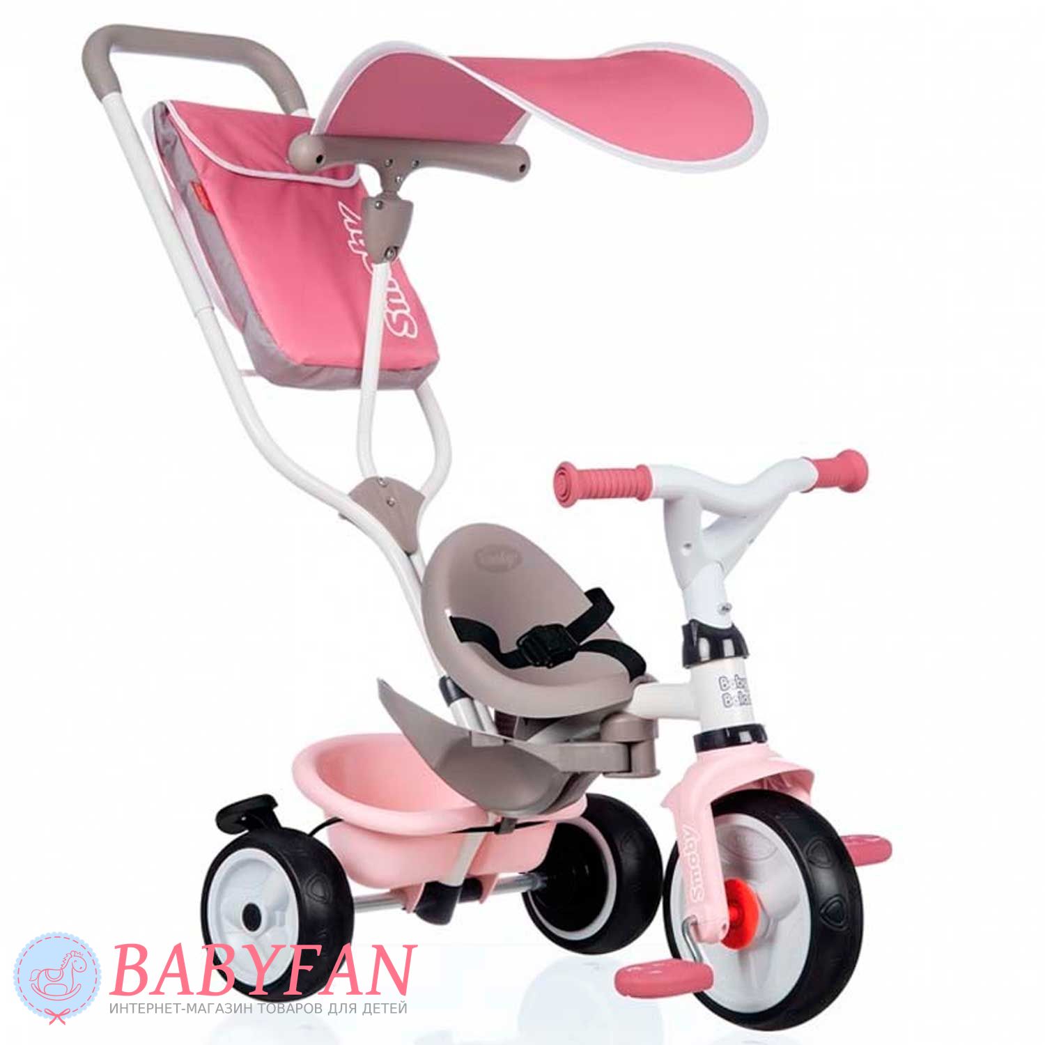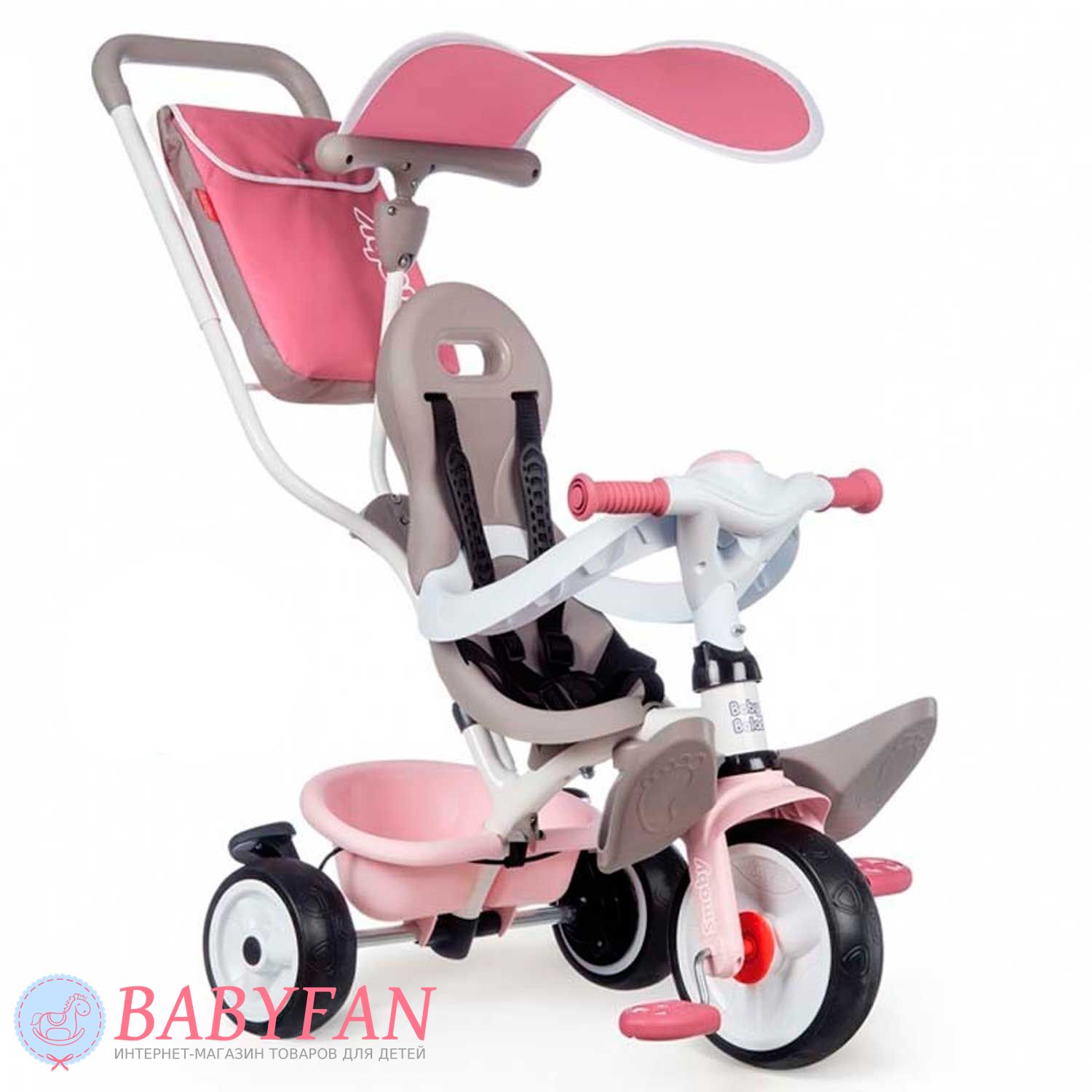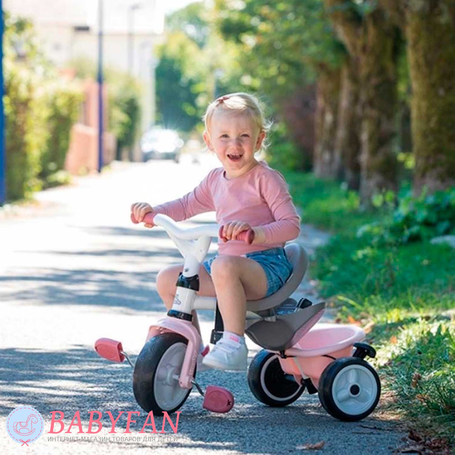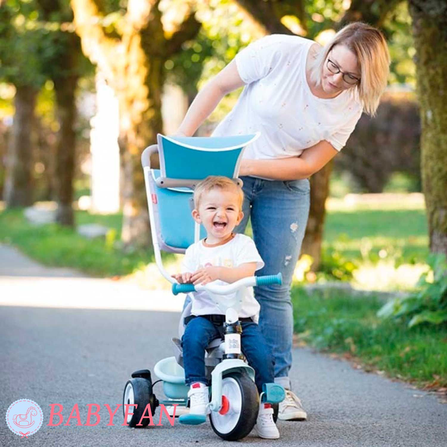 Smoby Balade – триколісний велосипед для дітей від 10 місяців, що трансформується, зі зростанням малюка, з велосипеда з батьківською ручкою в легкий велосипед, керований дитиною. Обладнаний захисною огорожею з високою спинкою та ременями безпеки, 2 підніжками, батьківською ручкою та поворотним сонцезахисним козирком. На ручці управління розміщується знімна сумка для мами. Для дитячих іграшок на задній осі розташований відкидний кошик. Рама сталева, навісне обладнання із легкого пластику. Велосипед призначений для щоденних прогулянок у теплу суху погоду.
