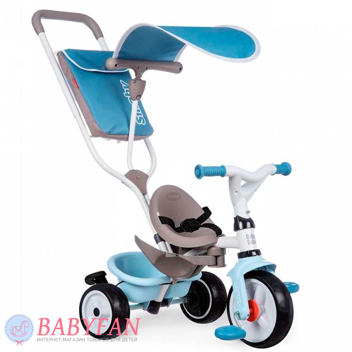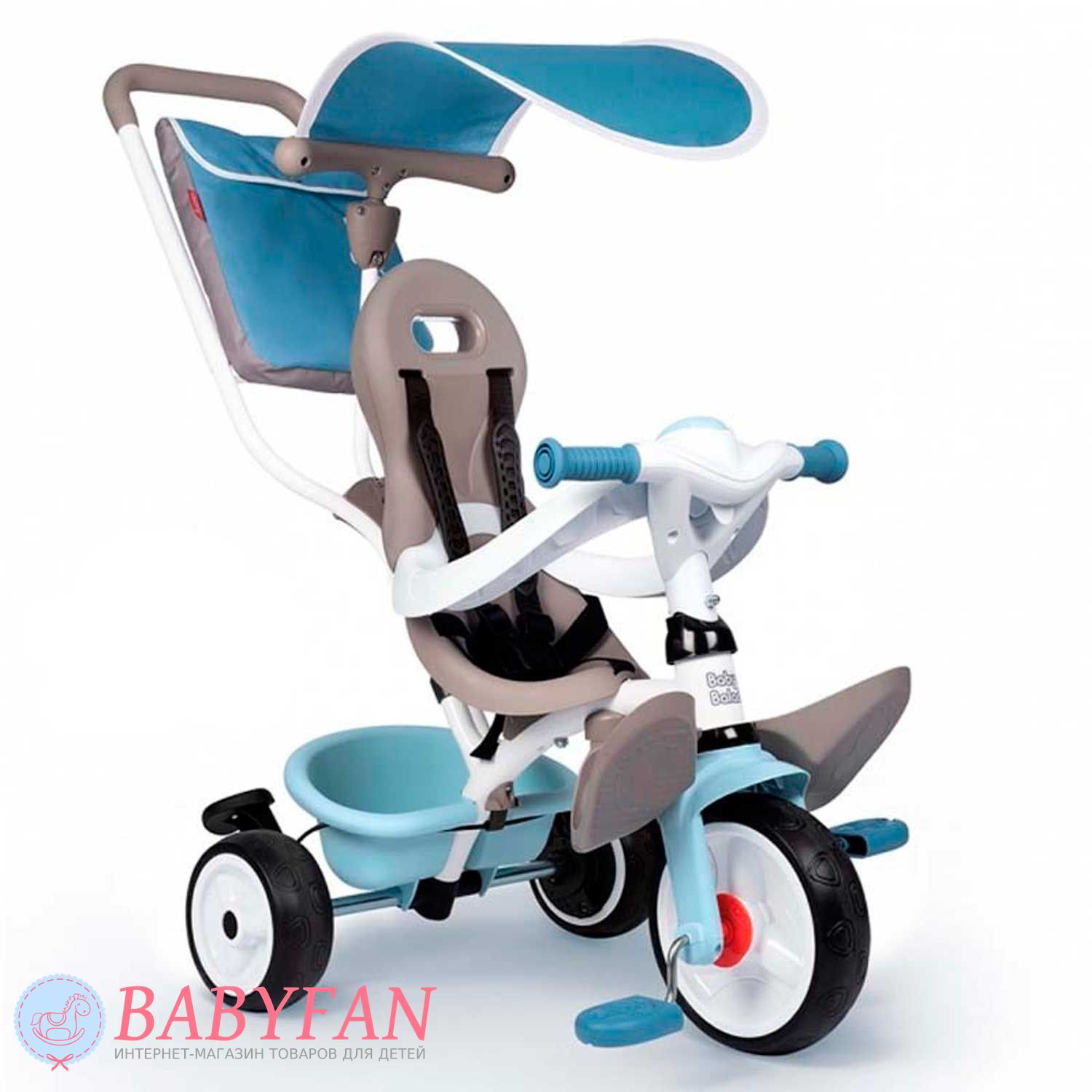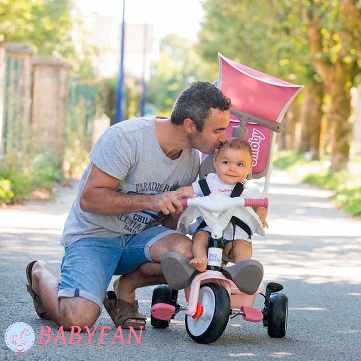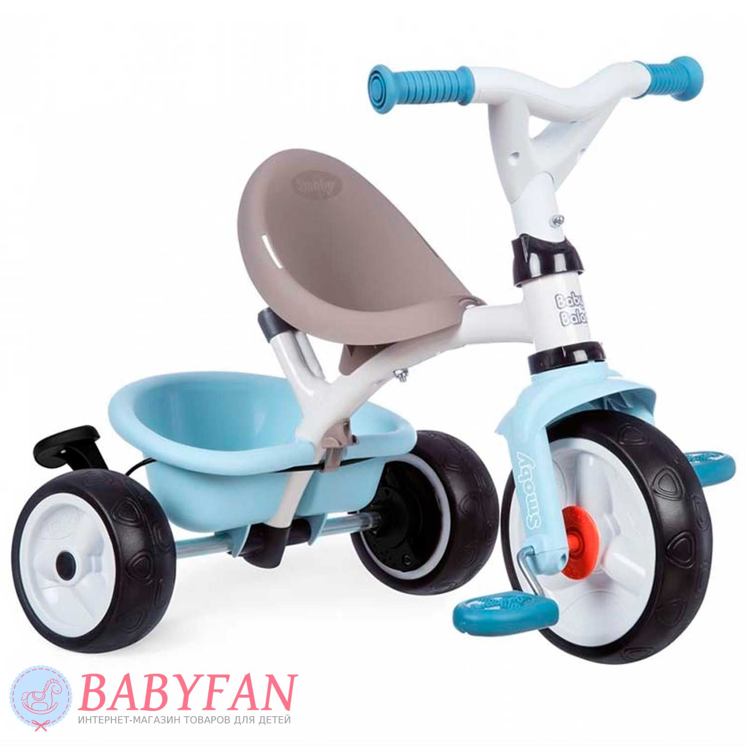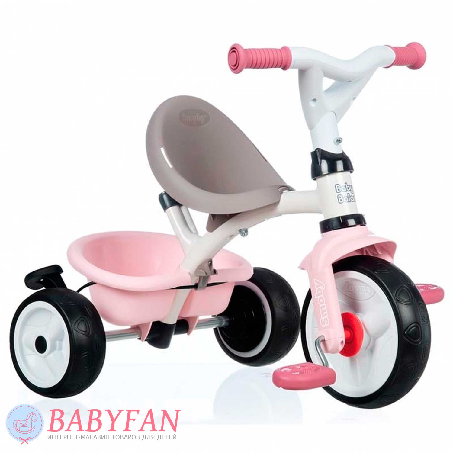 Smoby Balade – триколісний велосипед для дітей від 10 місяців, що трансформується, зі зростанням малюка, з велосипеда з батьківською ручкою в легкий велосипед, керований дитиною. Обладнаний захисною огорожею з високою спинкою та ременями безпеки, 2 підніжками, батьківською ручкою та поворотним сонцезахисним козирком. На ручці управління розміщується знімна сумка для мами. Для дитячих іграшок на задній осі розташований відкидний кошик. Рама сталева, навісне обладнання із легкого пластику. Велосипед призначений для щоденних прогулянок у теплу суху погоду.