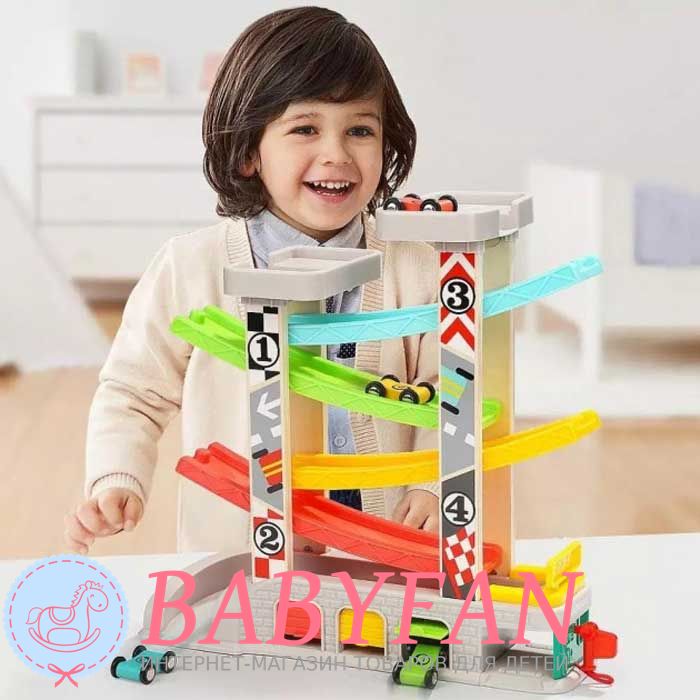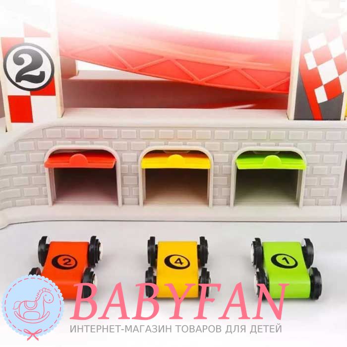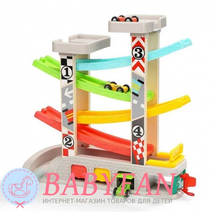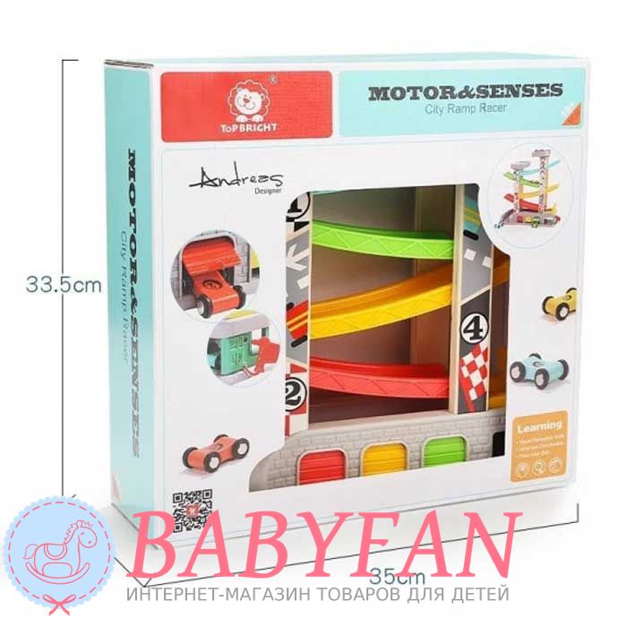 Іграшковий гоночний трек Top Bright 120402 Швидкісний спуск для малюків від 18 місяців виготовлений та міцного різнокольорового пластику. Відповідає європейському стандарту безпеки для іграшок EN71. Сертифіковано ASTM та ICTI. Іграшка складається з 2 веж із пусковими майданчиками, розташованими на різній висоті. Башти з'єднані 4 різнокольоровими елементами дороги. Кожен пусковий майданчик одночасно і паркування для 2 дерев'яних гоночних машин. В основі для сюжетних ігор розташовані 3 гаражі та заправна станція.