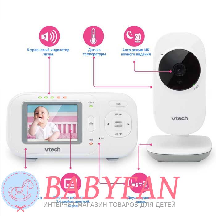 Цифрова відеоняня 2,4" Vtech VM2251 – модель, що дозволяє контролювати дії дитини та температуру повітря в дитячій кімнаті. Камера з дворазовим цифровим збільшенням, бездротовий зв'язок без перешкод, інфрачервоний фільтр у камері та функція двостороннього зв'язку забезпечує зв'язок мами з дитиною, коли вона знаходиться в іншій кімнаті Цифрова нянька значно полегшує життя молодих батьків.