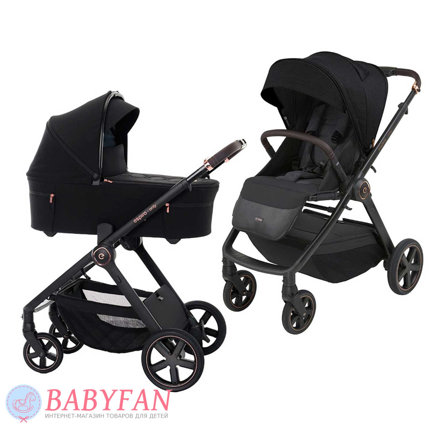 Універсальний візок Espiro Only – модульний візочок 2 в 1 для дітей від народження до 4 років зі складною м'якою люлькою, прогулянковим блоком, що встановлюється «обличчям до мами», алюмінієвим шасі та надувними задніми колесами. Для новонароджених на шасі без адаптерів встановлюється каркасна колиска з твердим дном. Прогулянковий блок із горизонтальним положенням спинки також можна використовувати з народження. Встановлюється в "обличчям до мами" і в бік по ходу руху. Коляска 2 в 1 виготовлена з легких та практичних матеріалів – алюмінієве шасі, текстиль водонепроникний, із захистом від ультрафіолетового випромінювання. Маневрена – повертається однією рукою.