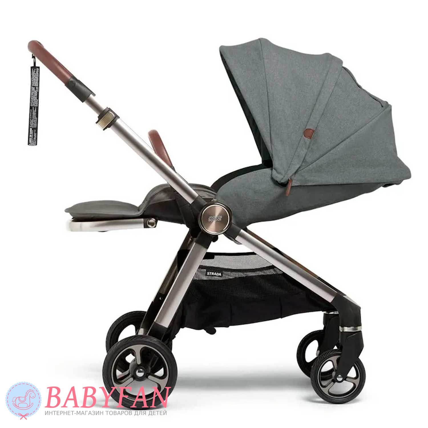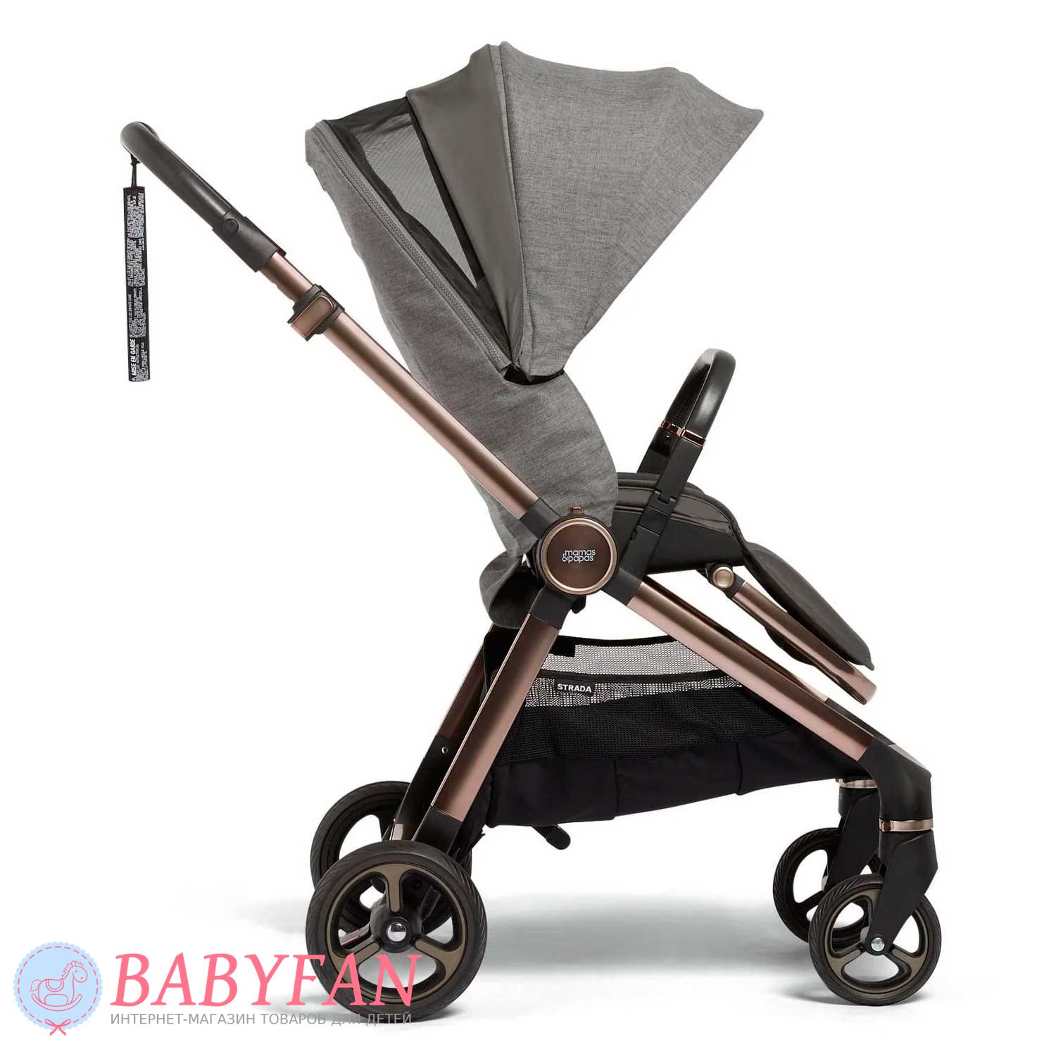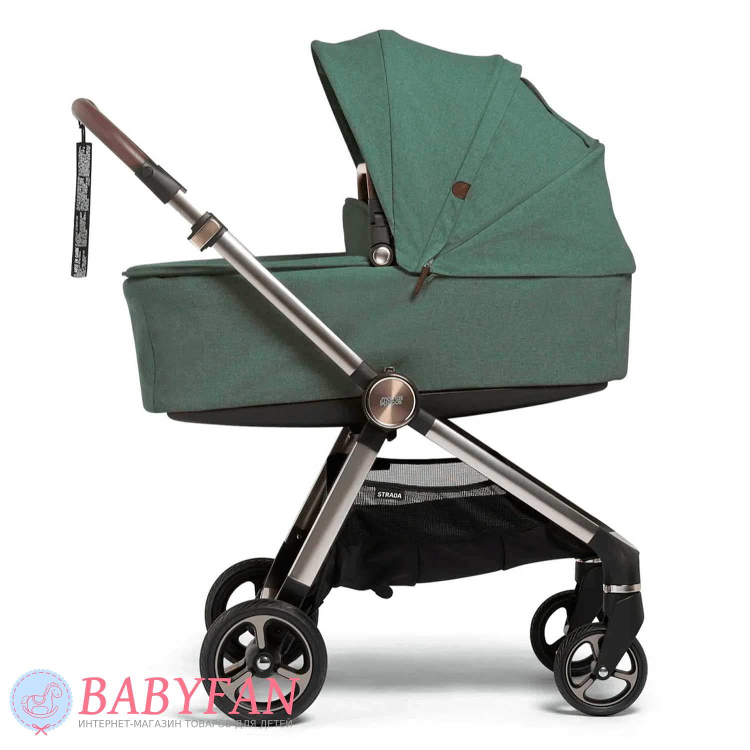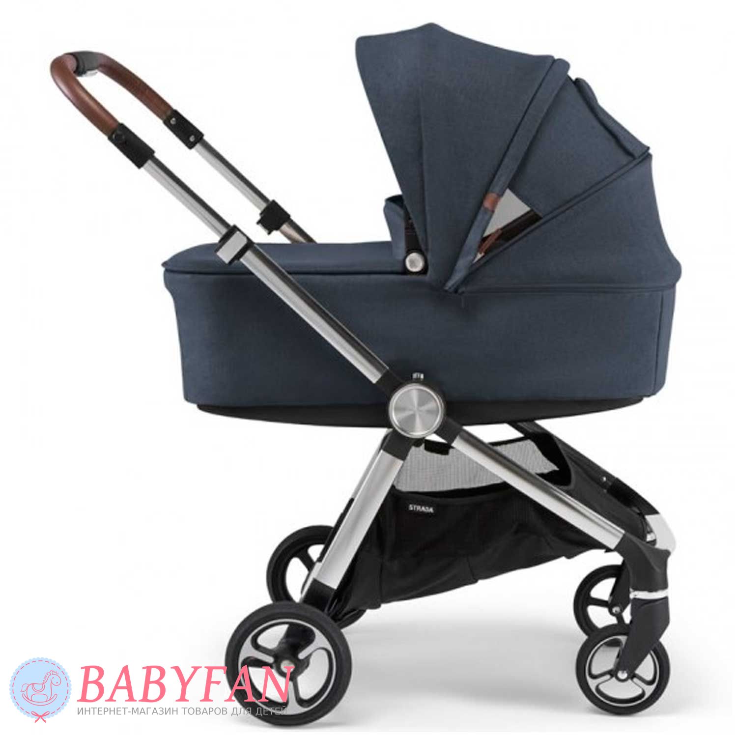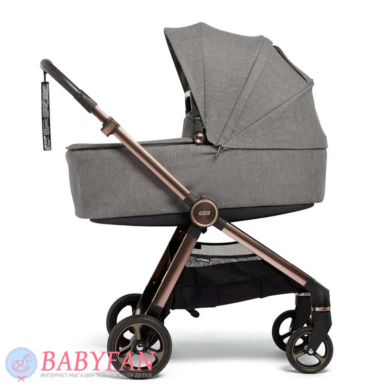 Універсальна коляска Mamas & Papas Strada є модульною системою 2 в 1, що складається з шасі, люльки для новонародженого немовляти і прогулянкового блоку для дітей від народження до 3 років. Обмеження за вагою малюка для колиски – до 9 кг, для прогулянкового блоку – до 15 кг. Виконана з якісних та міцних матеріалів: сталева хромована рама; сполучні елементи із матового пластику; покришки коліс із спіненого поліуретану; батьківська ручка та бампер з екошкіри; текстильні елементи із щільного, приємного на дотик поліестеру з додаванням натуральної бавовни – внутрішня частина люльки та підкладка прогулянкового блоку. Призначена для щоденних прогулянок з дитиною на свіжому повітрі у будь-яку пору року та будь-яку погоду. Для більшого комфорту оснащено пружинними амортизаторами.