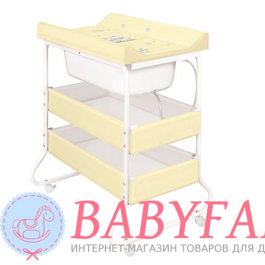 Ванна з пеленатором Ceba Baby Susie – зручне та практичне придбання для батьків, для дітей від народження до року. Столик обладнаний ванною зі шлангом для зливу, пеленальним матрациком з високими бортами. Двома додатковими поличками для дитячих аксесуарів. Чотири колеса, два з яких мають гальмівні фіксатори для переміщення. Жорстка та стійка металева конструкція.