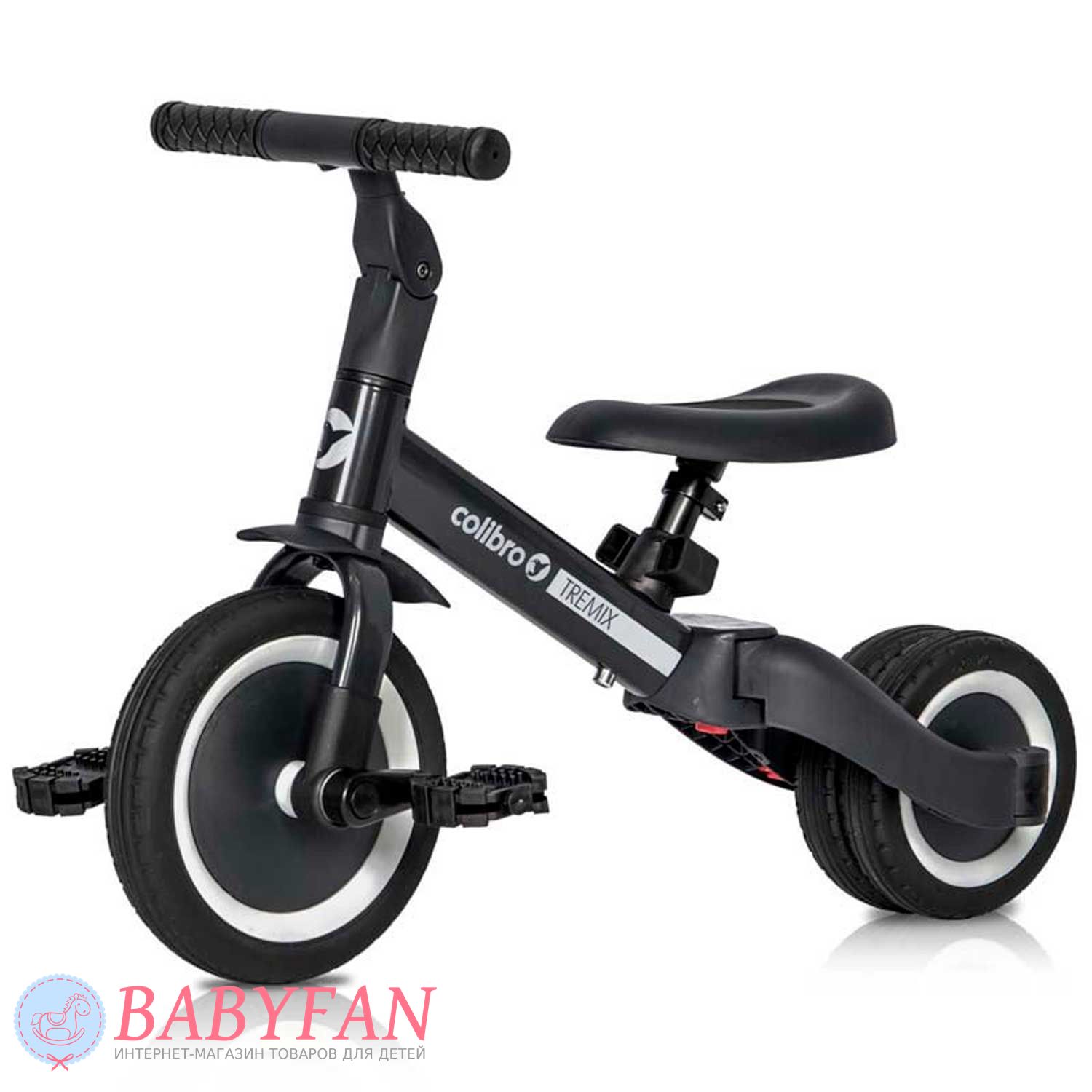 Colibro Tremix - це велосипед-біговел 4 в 1 для дітей від 1 до 5 років. В міру зростання дитини трансформується з 3-колісного беговела на 3-колісний велосипед, 2-колісний велосипед та 2-колісний беговел. Виконаний у класичному дизайні. Виготовлений з якісних та міцних матеріалів: металева рама з елементами із пластику, покришки коліс та грипси із гуми. Завдяки простій фірмовій системі трансформації Colibro Tremix можна використовувати у 4 різних варіантах.