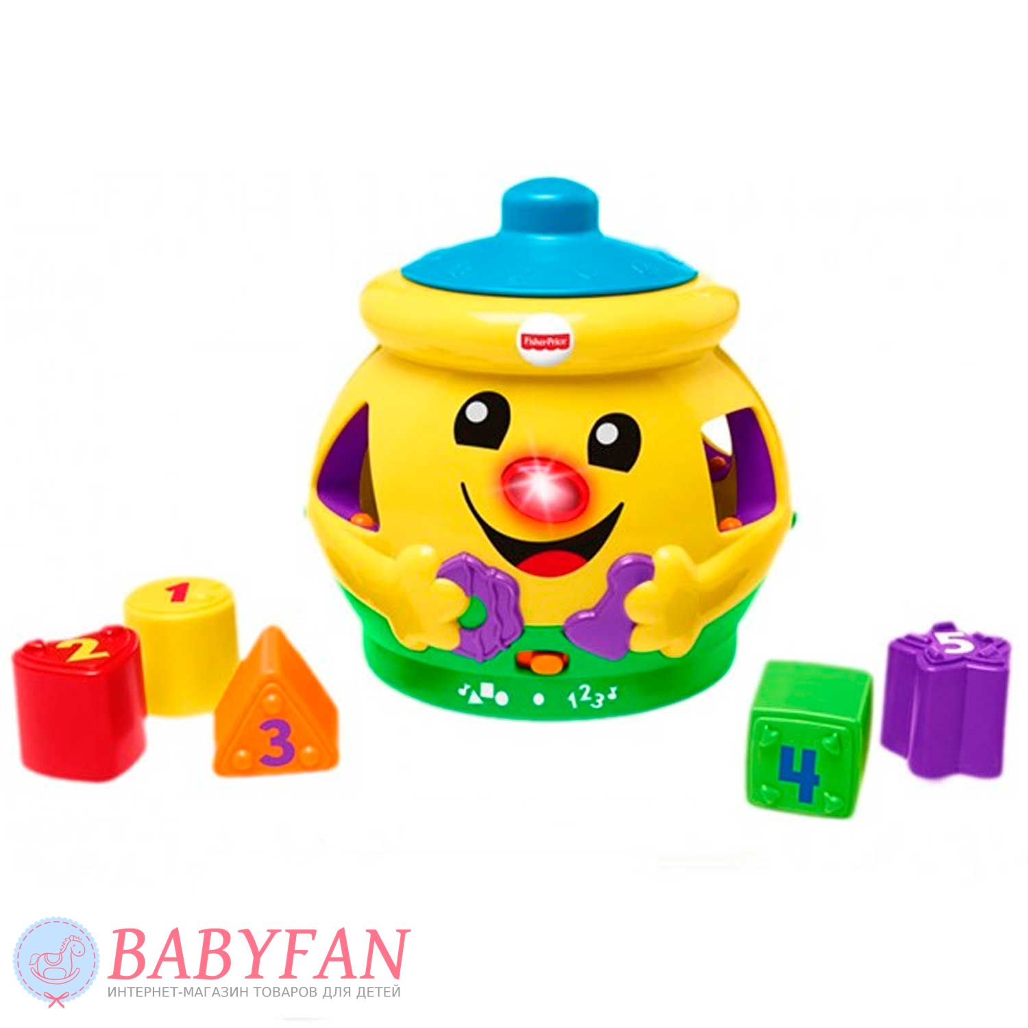 Чарівний горщик (укр.) Fisher-Price M4916 – дивовижна іграшка для дітей. Іграшка має чудове веселе личко, носик-кнопочку та 5 отворів різних геометричних форм. Щоразу, коли малюк натискає на носик, чарівний горщик Fisher-price підсвічується миготливою лампочкою і видає якусь фразу або кумедний звук.
